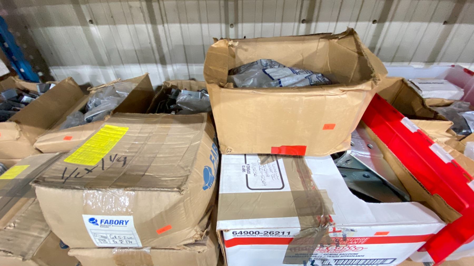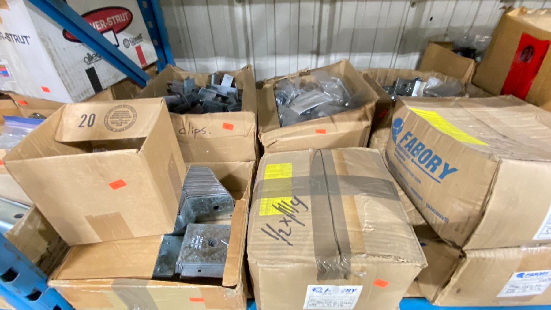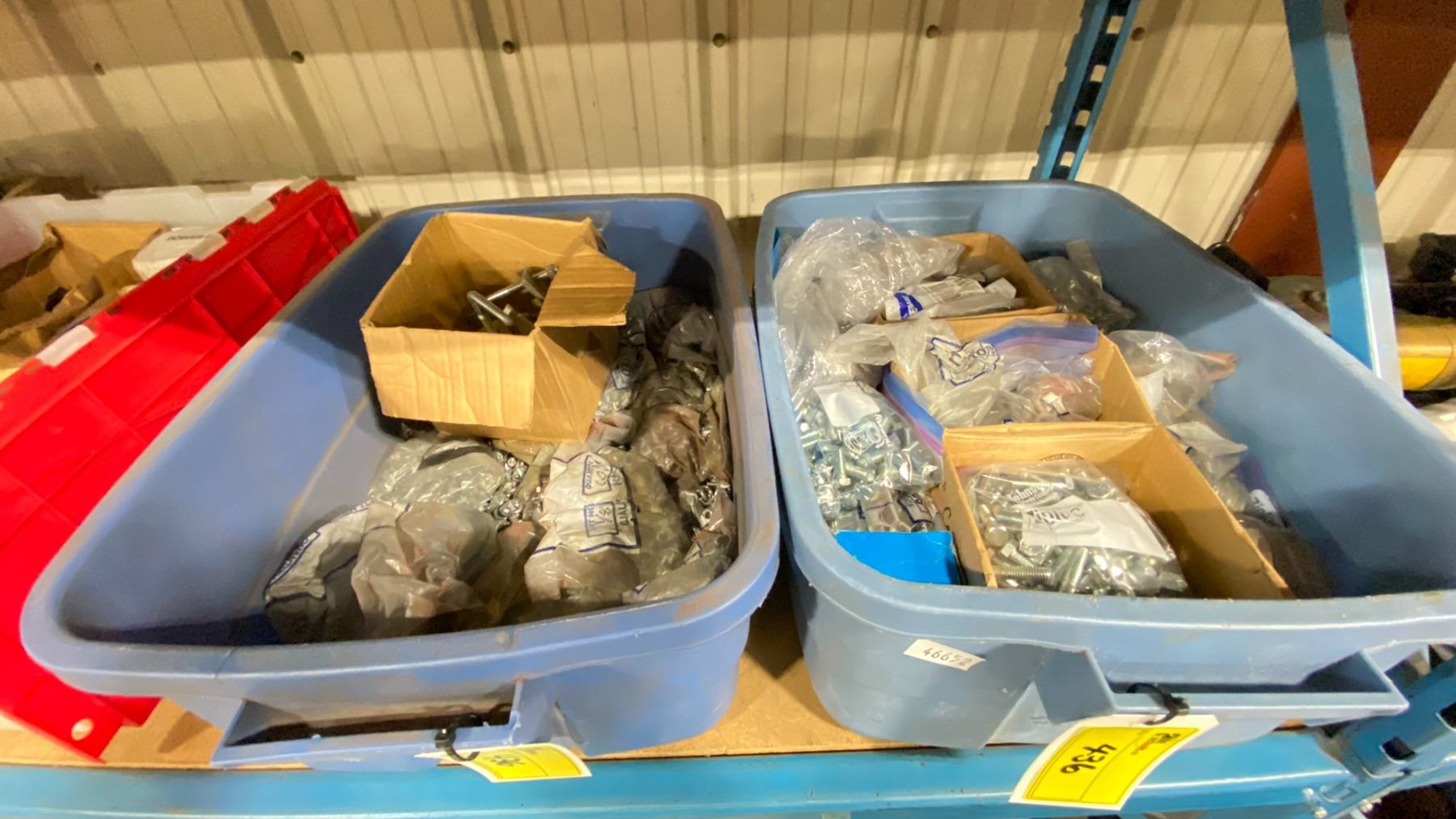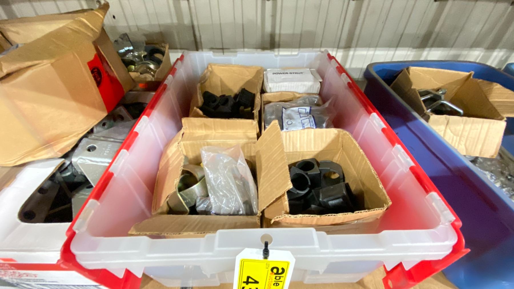 SHELF OF ASSORTED HEAVY DUTY HARDWARE, BRACKETS, & REPAIR ITEMS *MUST TAKE ALL ON SHELF*