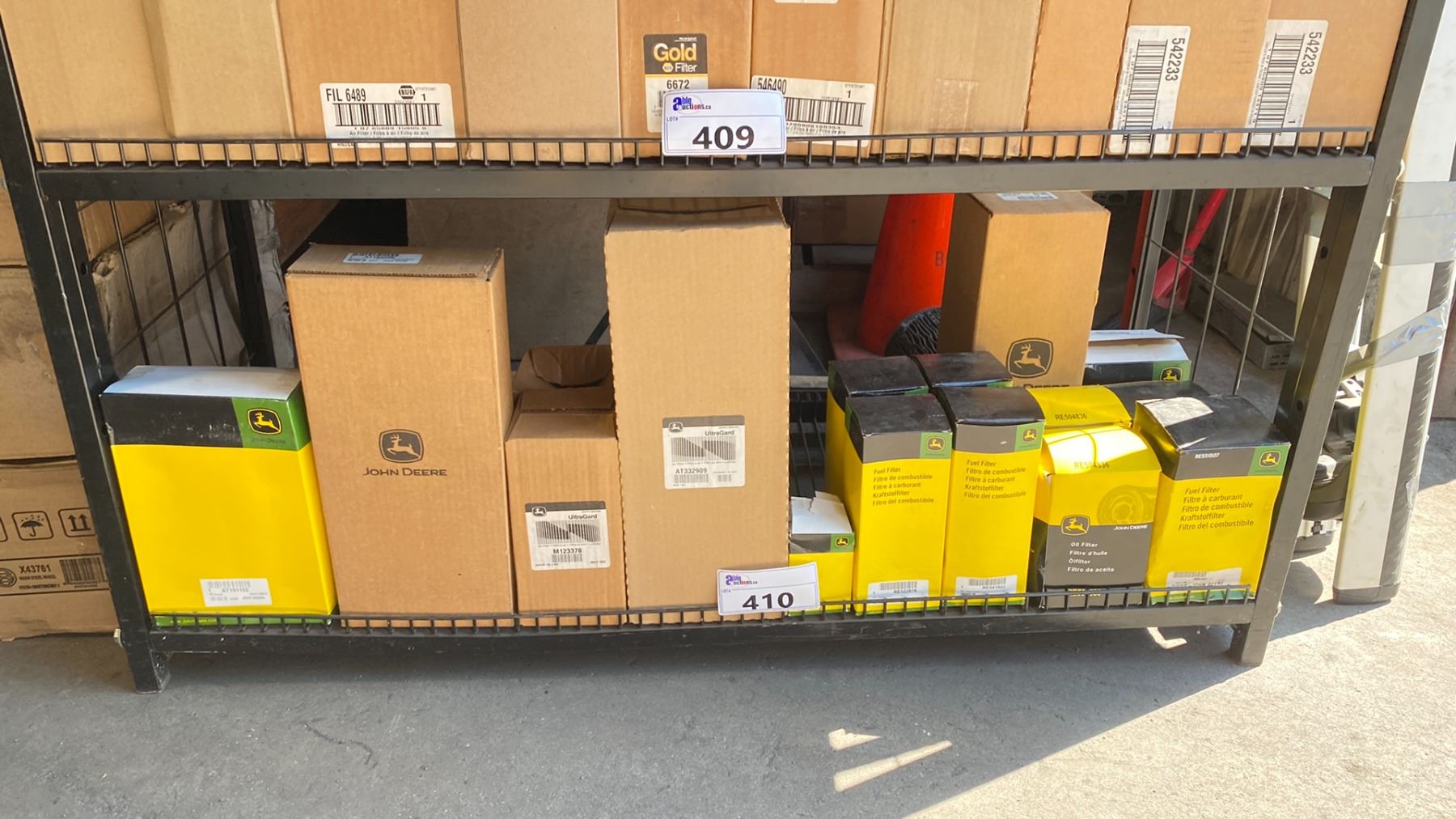 SHELF OF ASSORTED HEAVY DUTY JOHN DEERE VEHICLE FUEL / OIL FILTERS *SHELF NOT INCLUDED*