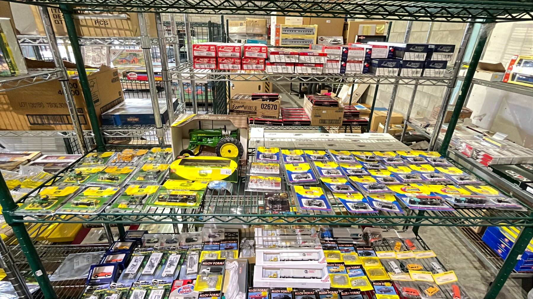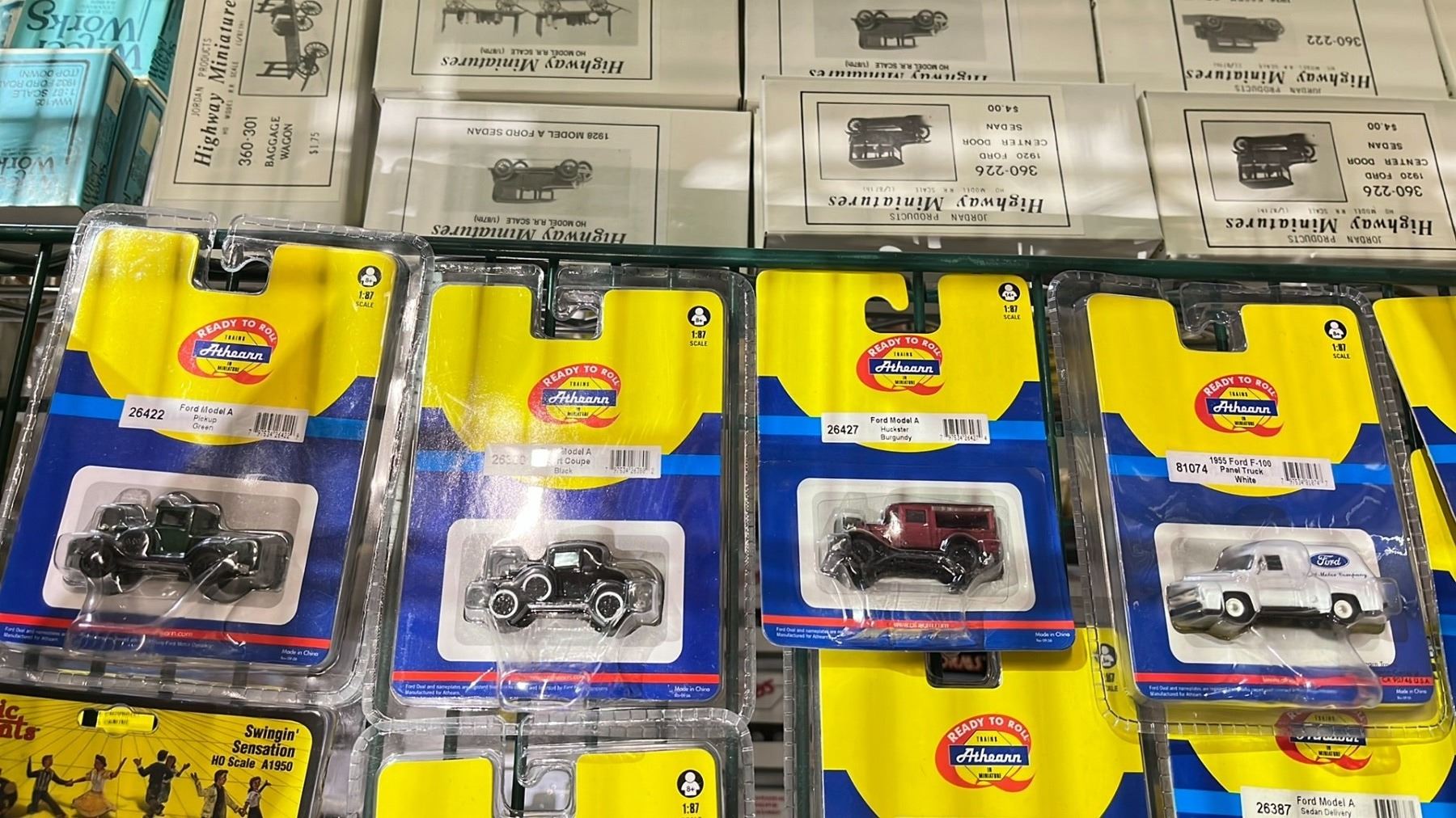 SHELF OF ASSORTED HO SCALE DIE CAST FARM VEHICLES, ATHEARN HO SCALE MODEL TRAIN VEHICLES & MORE