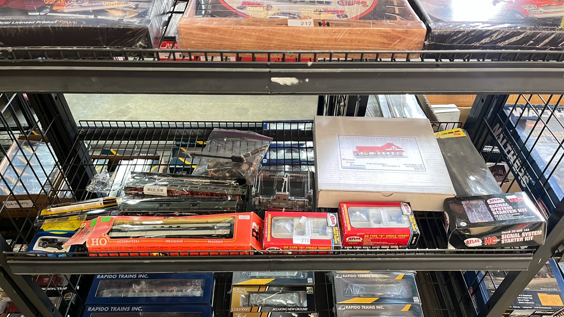 SHELF OF ASSORTED HO SCALE MODEL TRAINS, CANADIAN NATIONAL RAILWAY THIRD CLASS STATION STRUCTURE & MORE