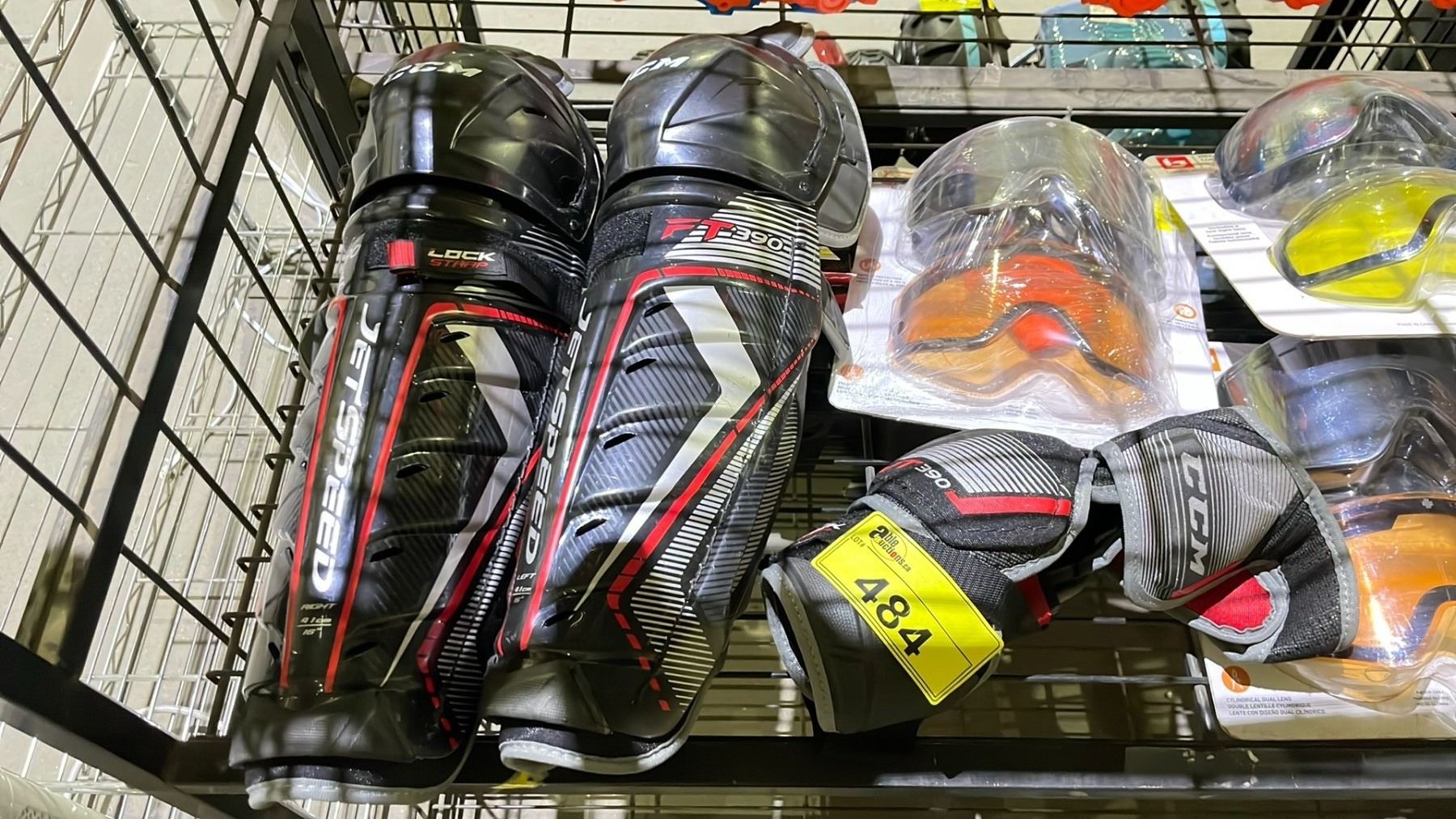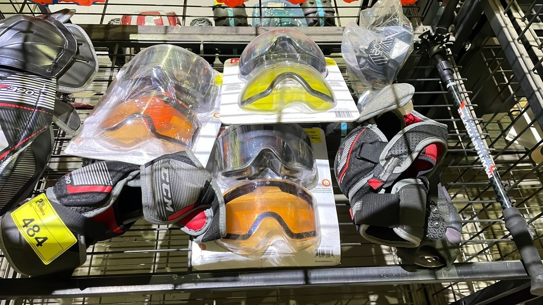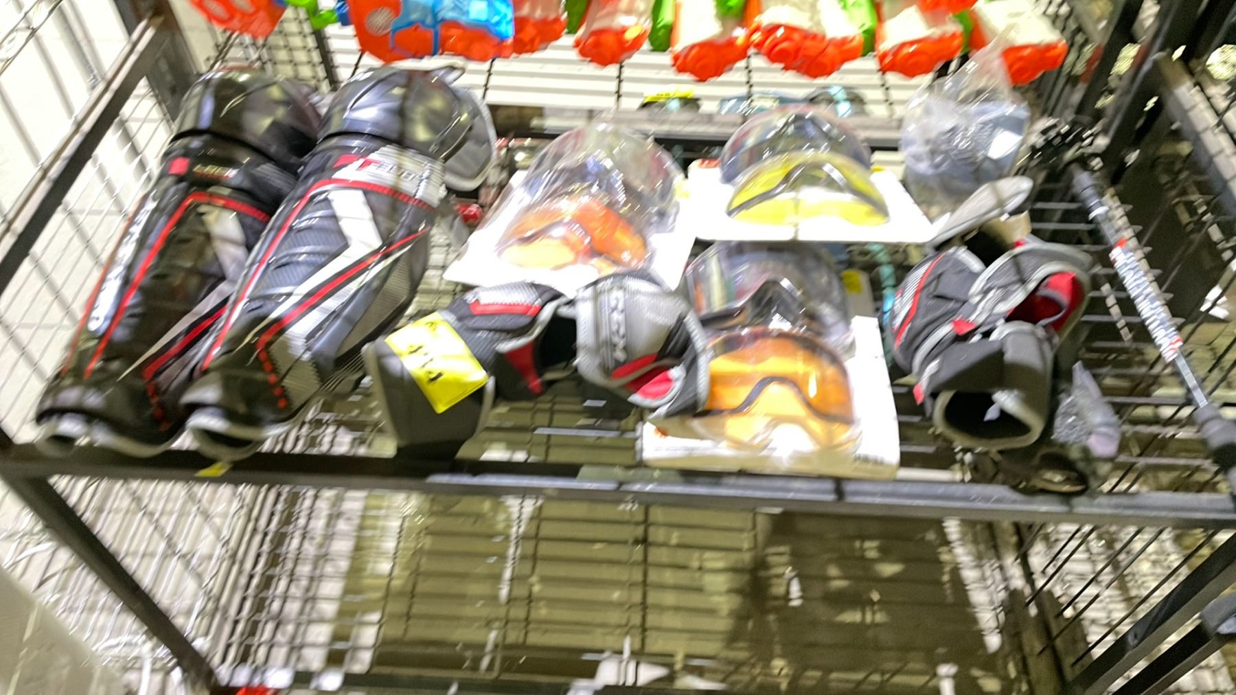 SHELF OF ASSORTED HOCKEY GEAR & SNOW GOGGLES