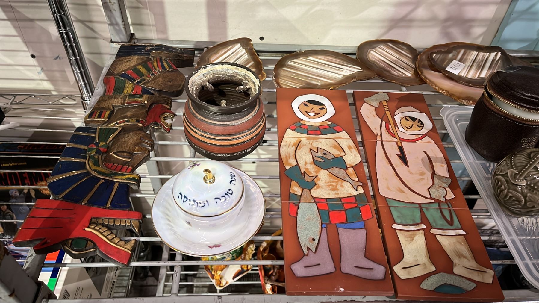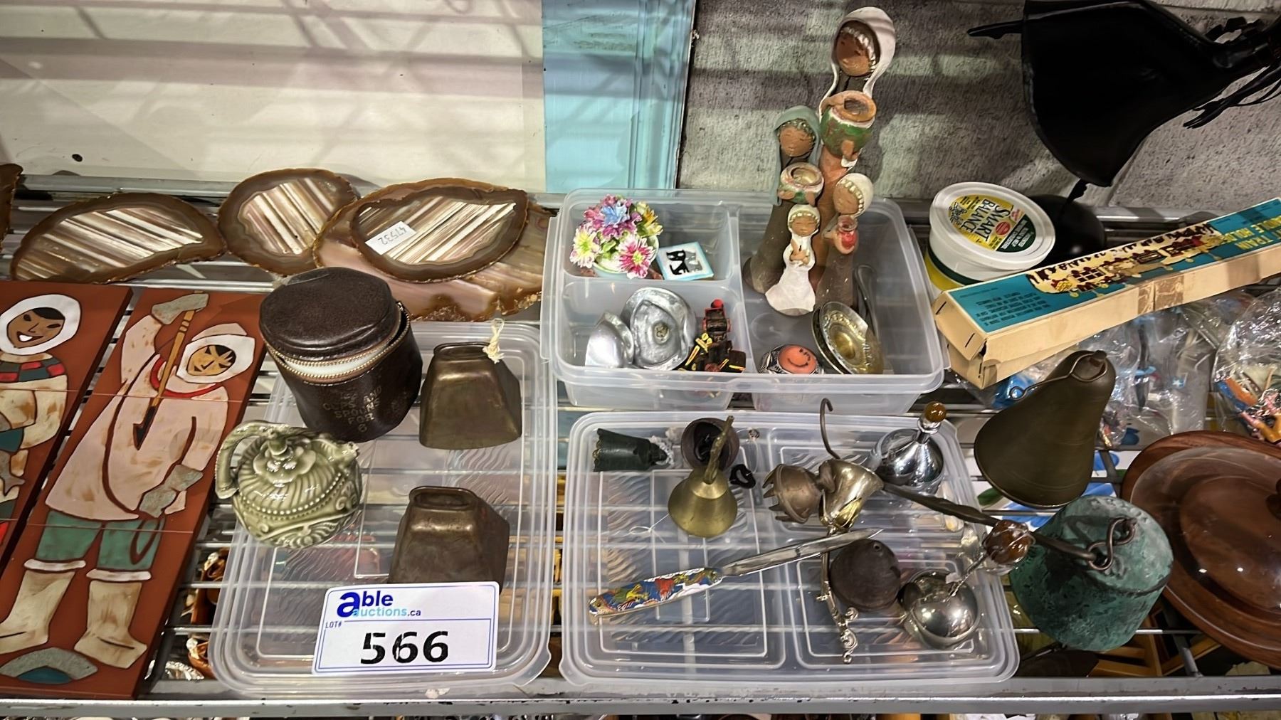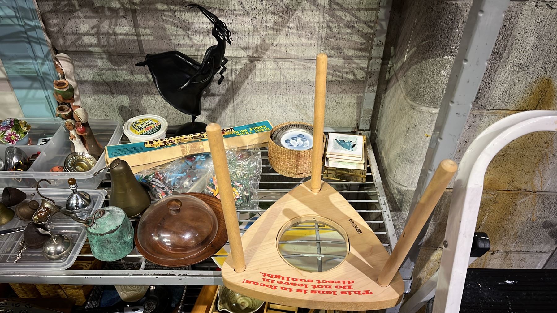 SHELF OF ASSORTED HOME DECOR ITEMS - BELLS, WALL DECOR, & MORE
