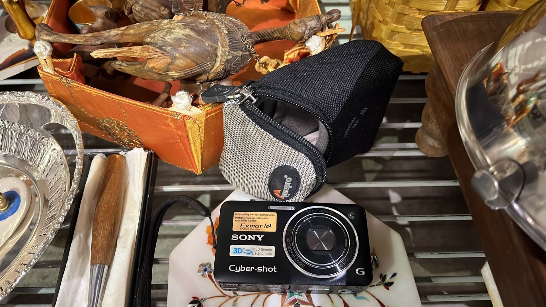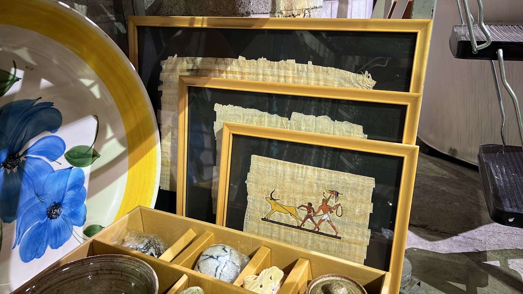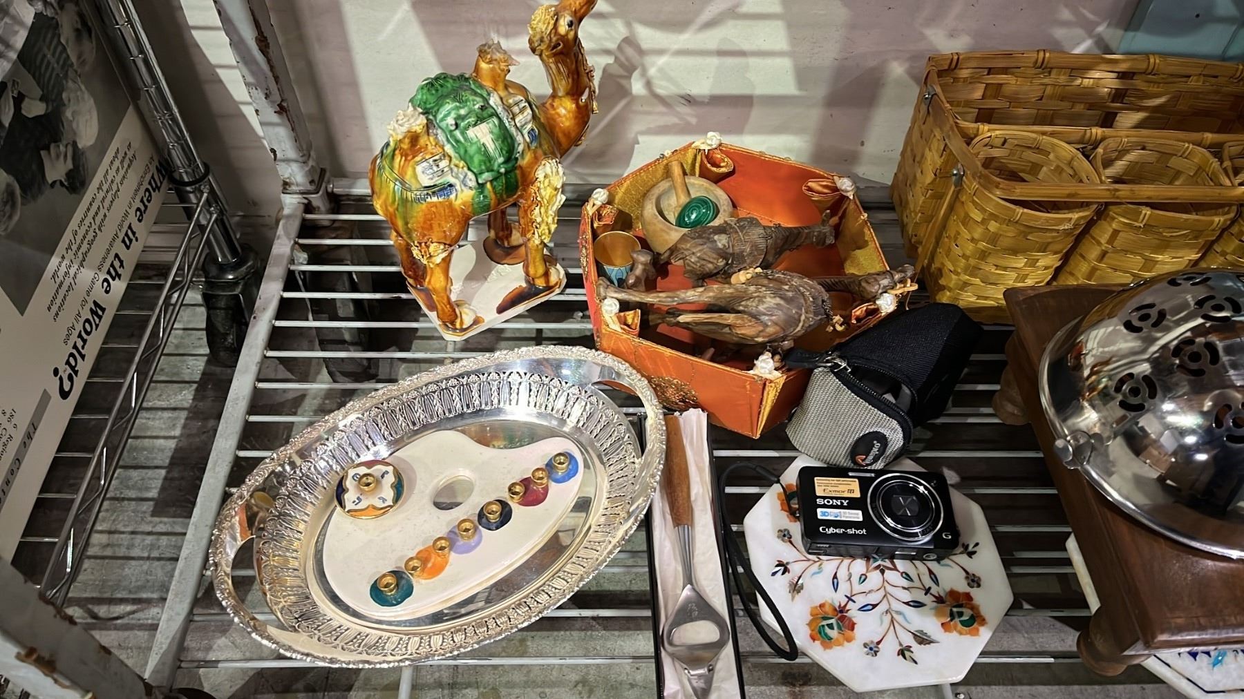 SHELF OF ASSORTED HOME DECOR ITEMS - WALL ART, CANDLEHOLDERS, WOVEN BASKET & MORE