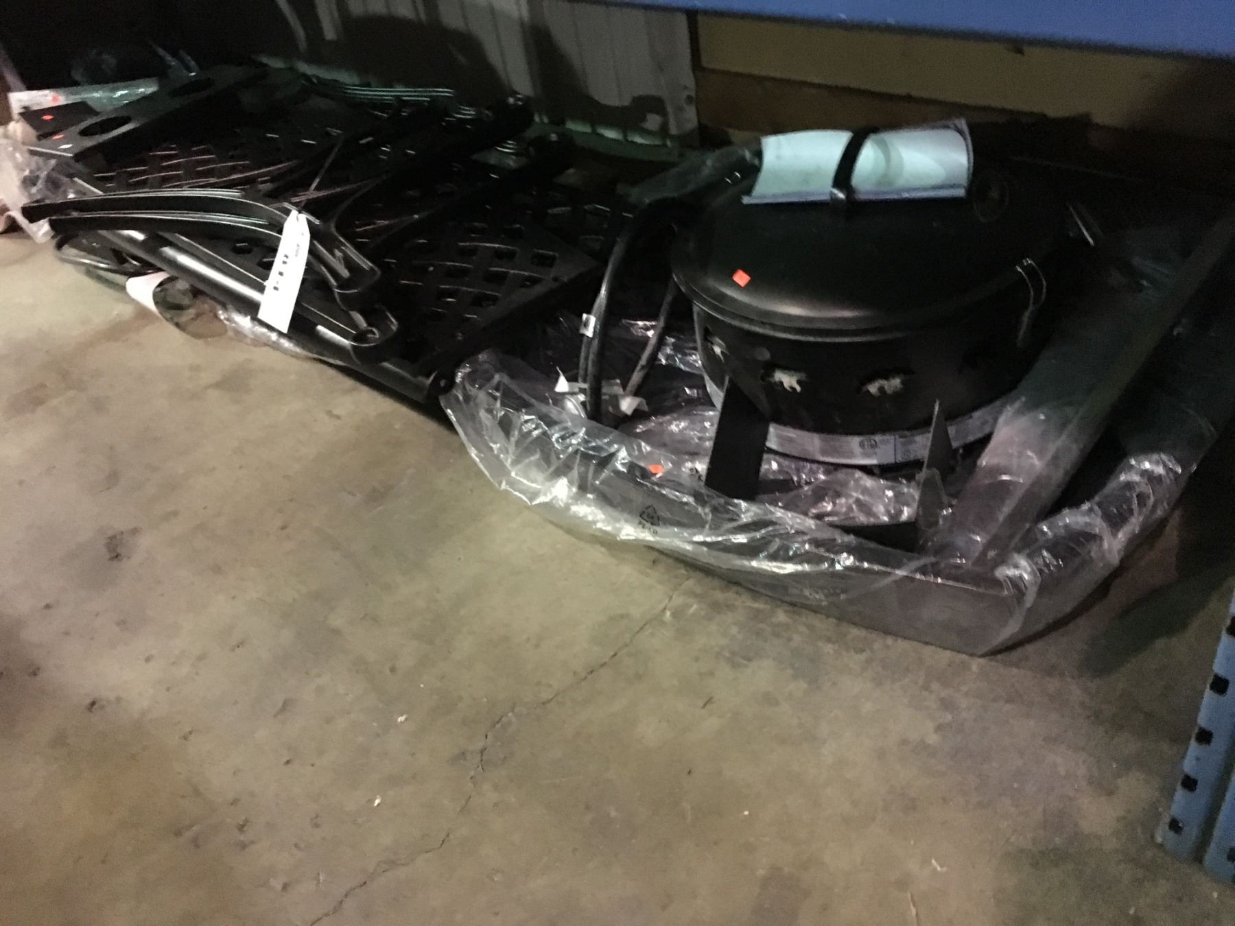 SHELF OF ASSORTED HOME IMPROVEMENT PARTS INCLUDING PROPANE FIREPIT, ALUMINUM BENCH PARTS