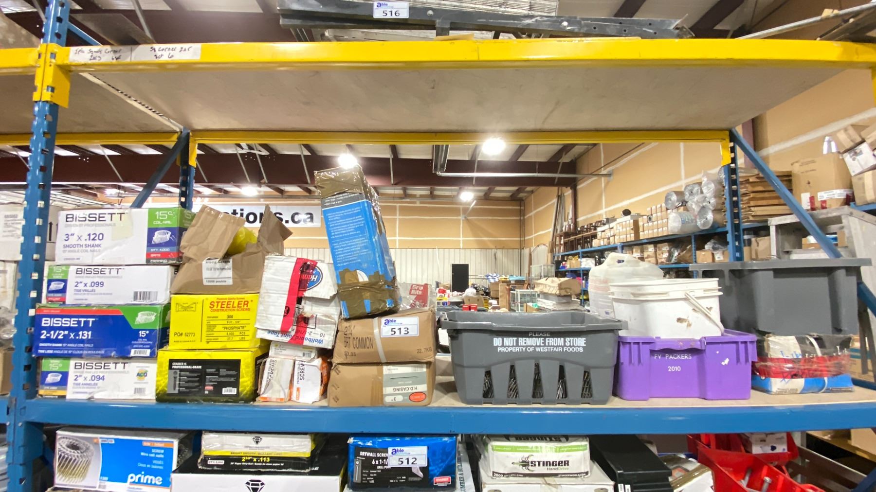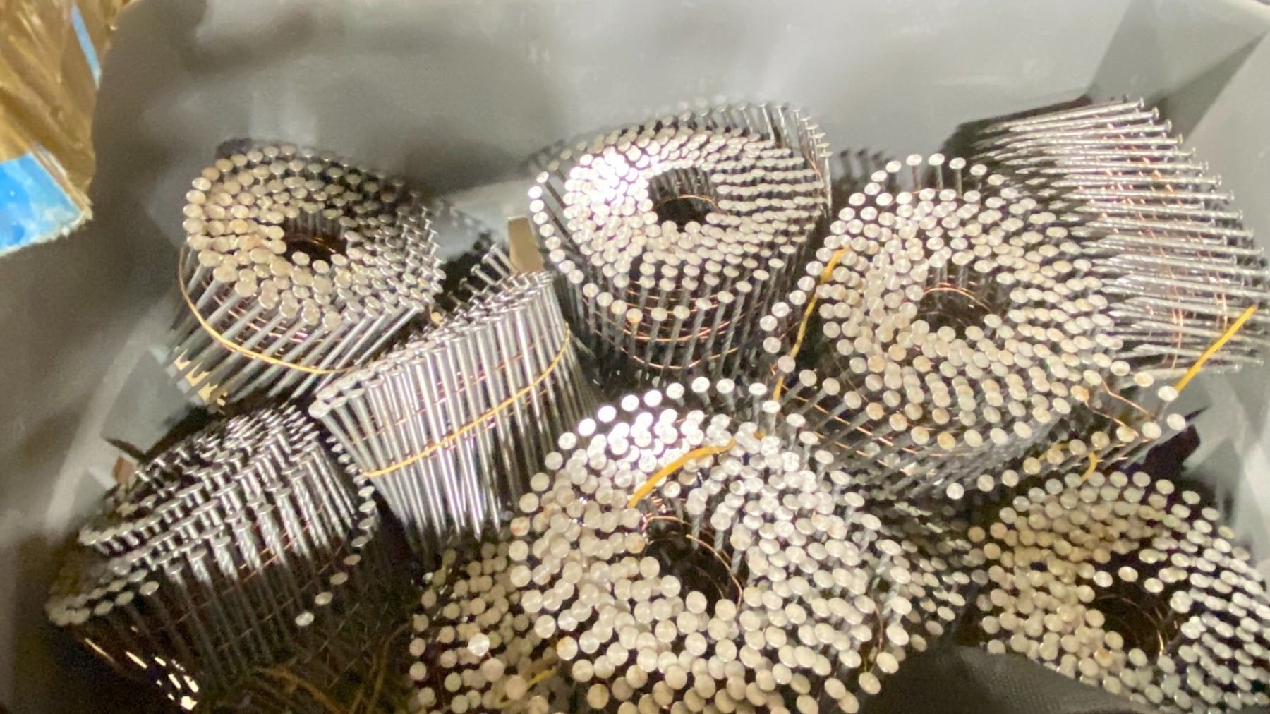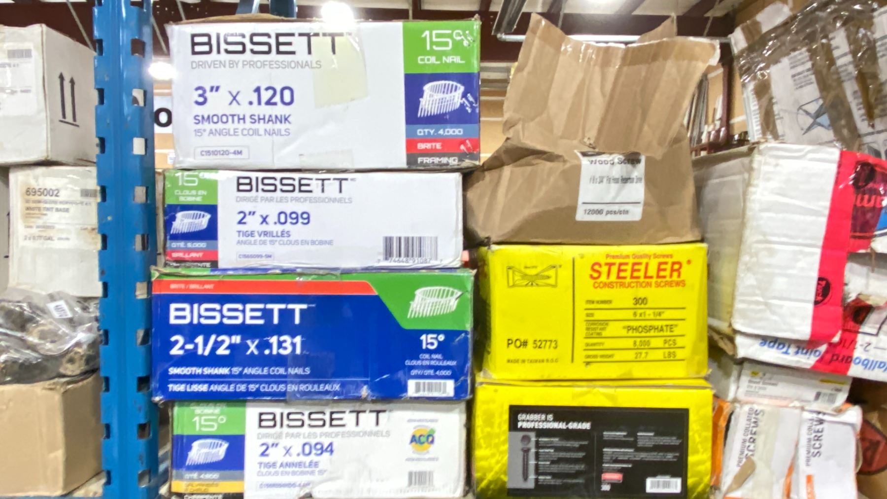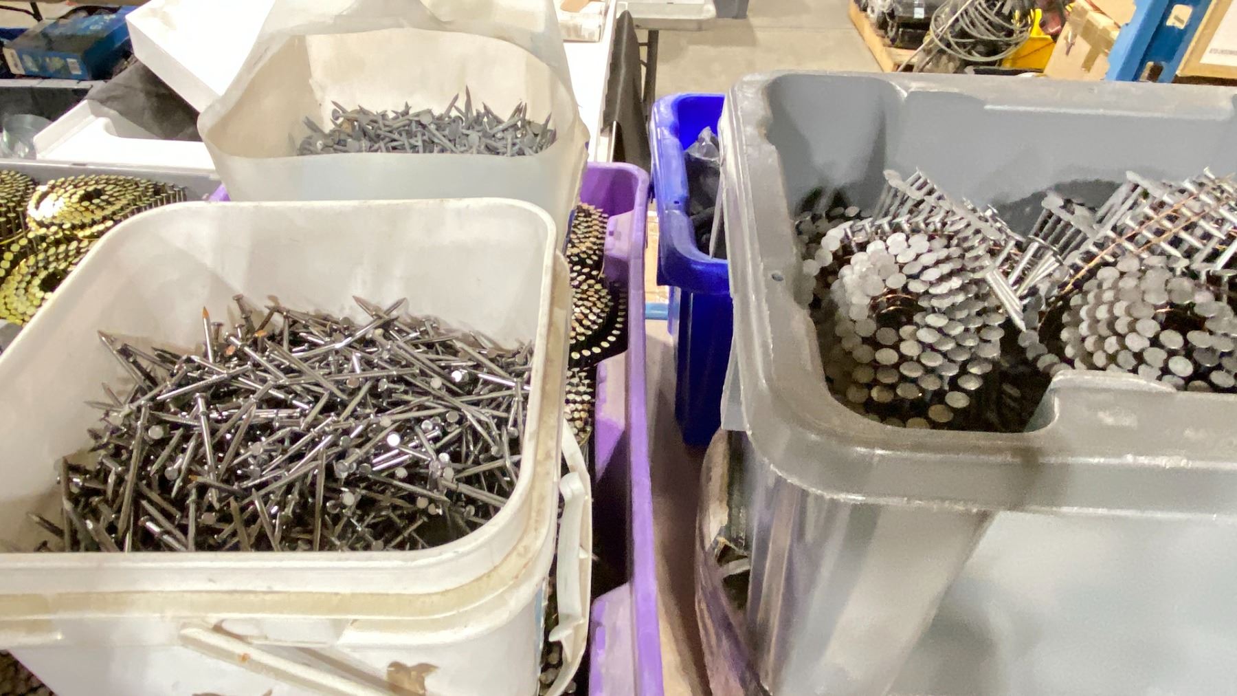 SHELF OF ASSORTED INDUSTRIAL COIL NAILS, HARDWARE & MISCELLANEOUS INDUSTRIAL ITEMS