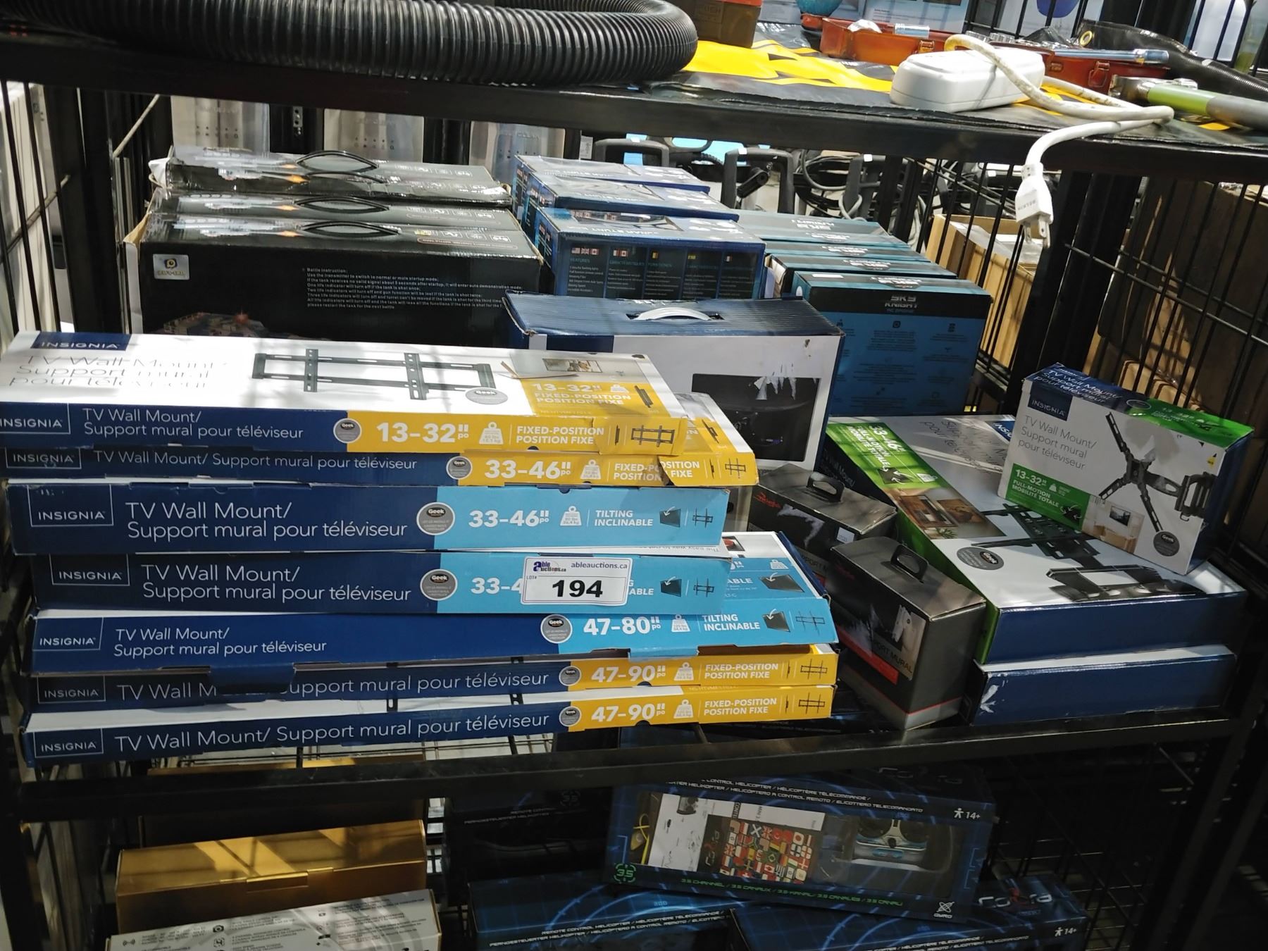SHELF OF ASSORTED INSIGNIA TV WALL MOUNTS AND DESKTOP MONITOR MOUNT