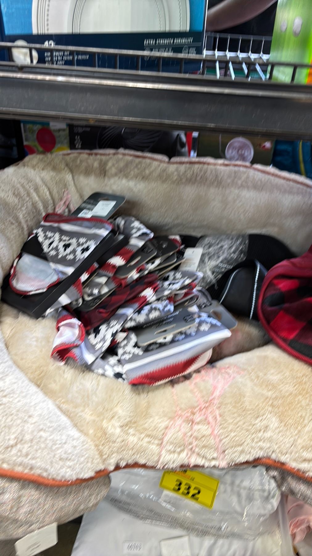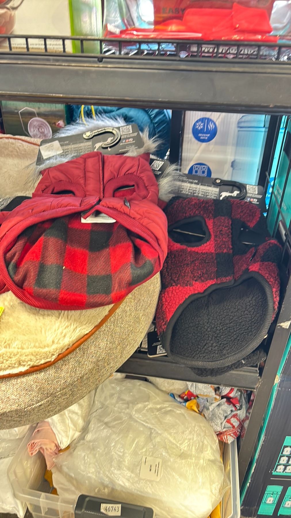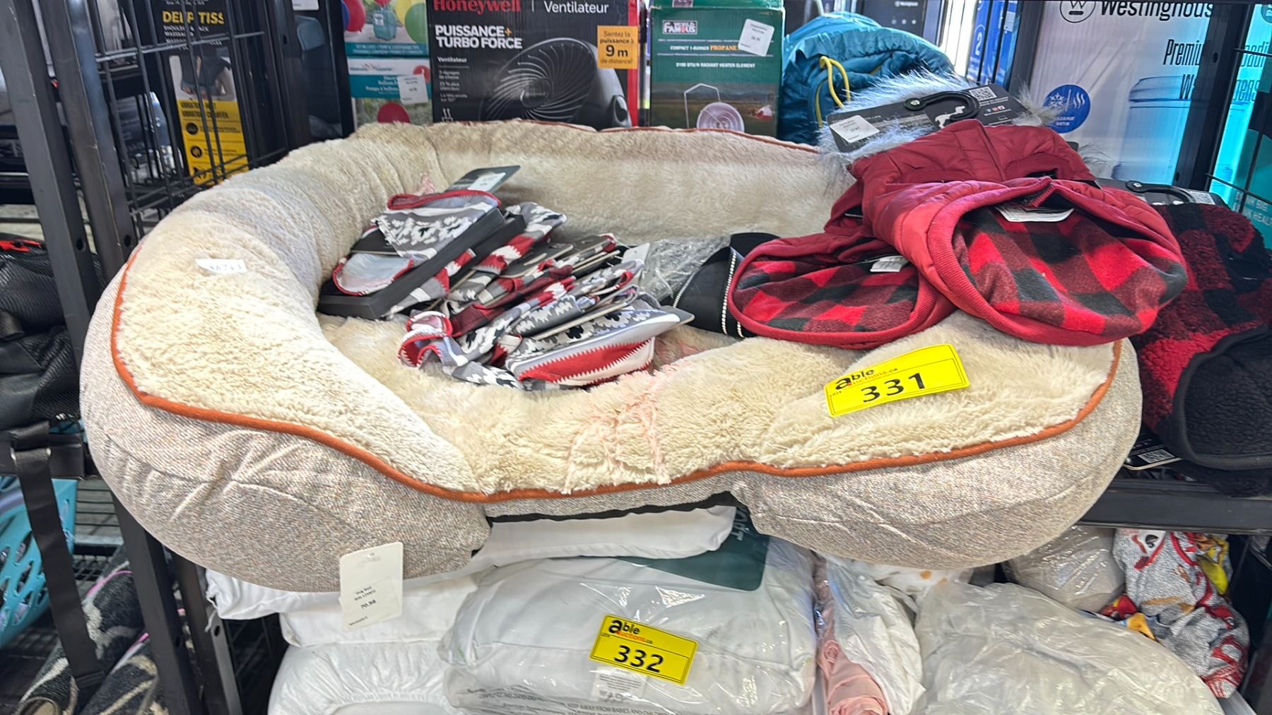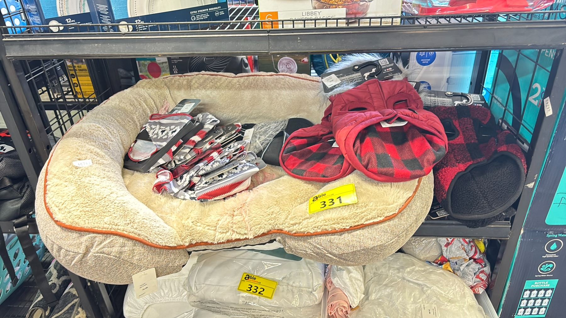 SHELF OF ASSORTED ITEMS INCLUDED: DOG BANDANAS, DOG FIT JACKETS AND DOG BED