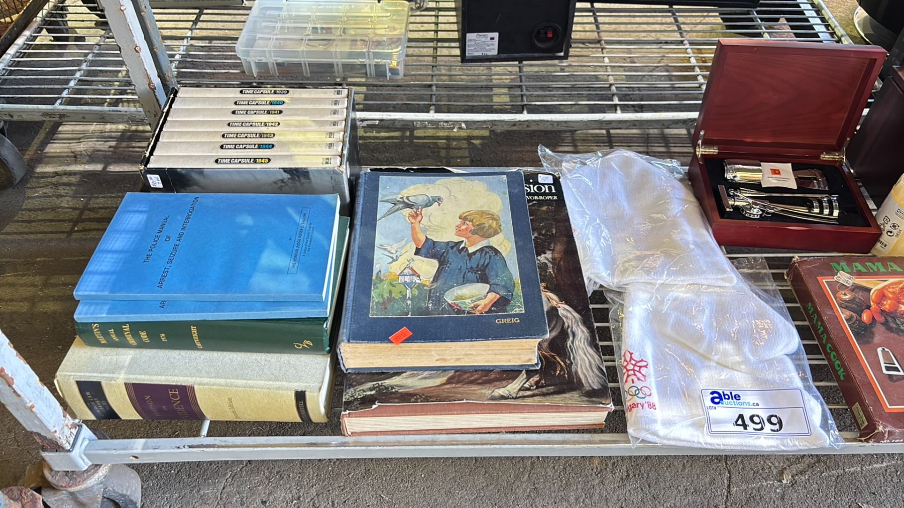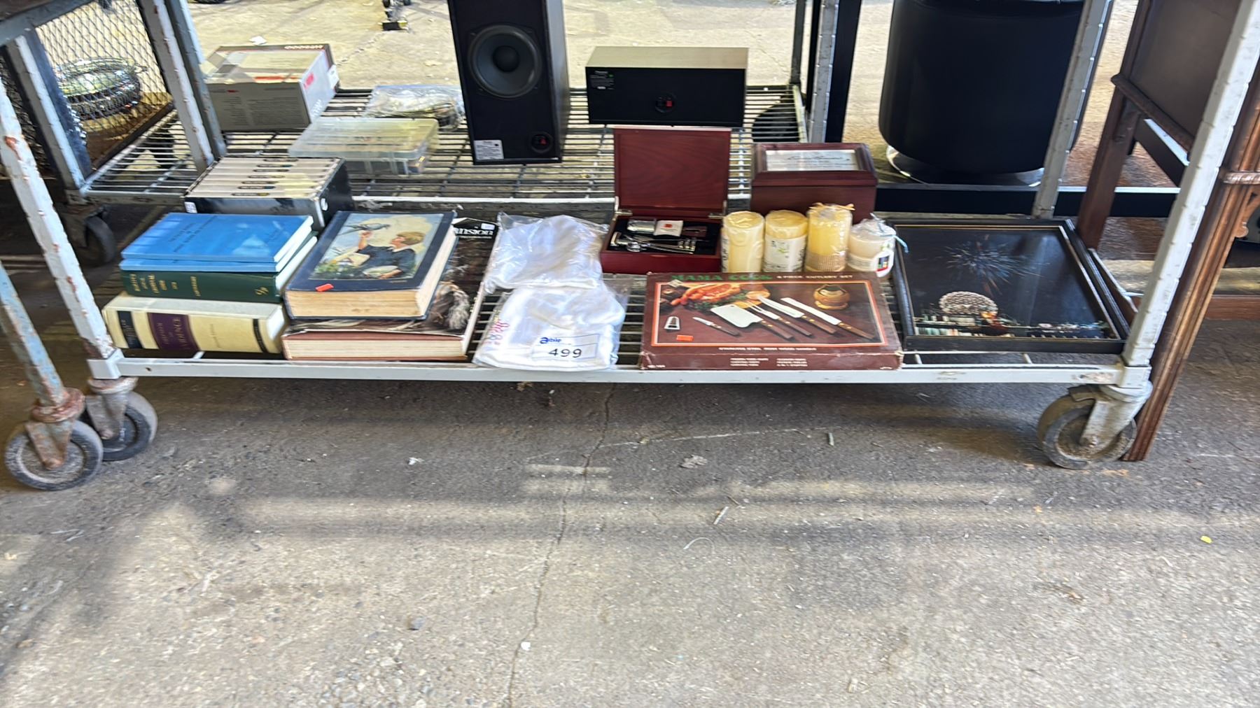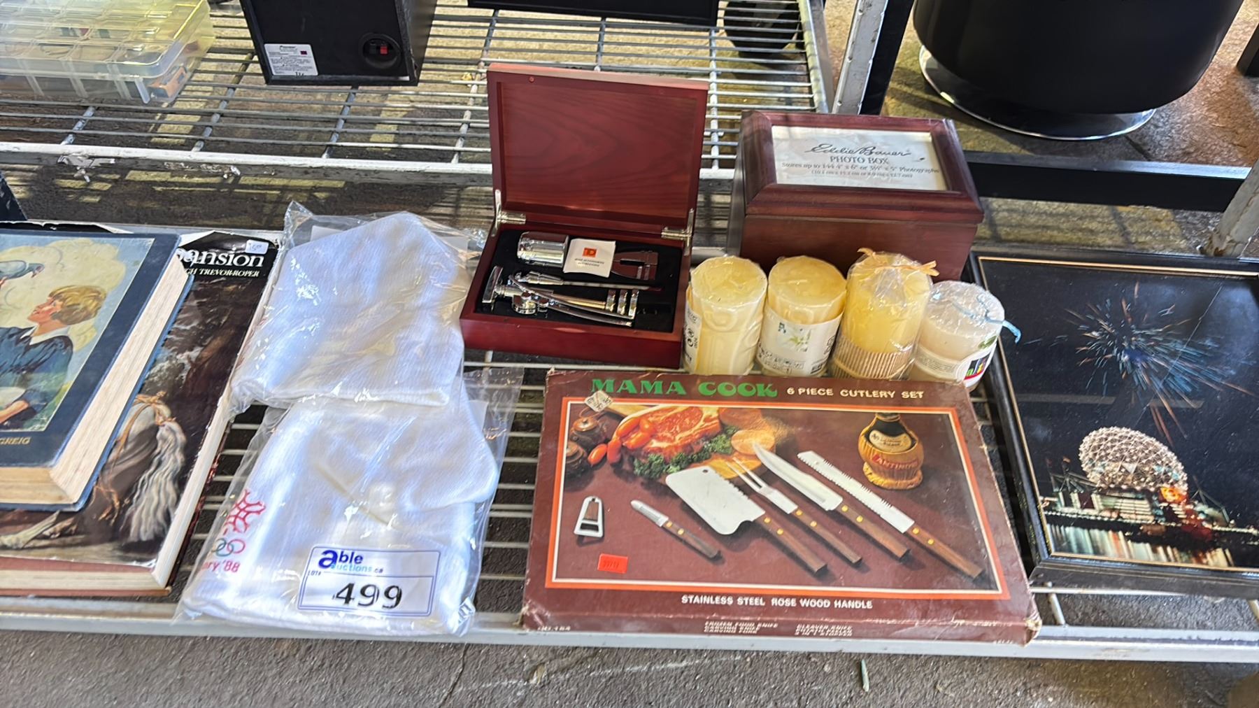 SHELF OF ASSORTED ITEMS INCLUDING; 6-PC CUTLERY SET, BOOKS, CANDLES & MORE