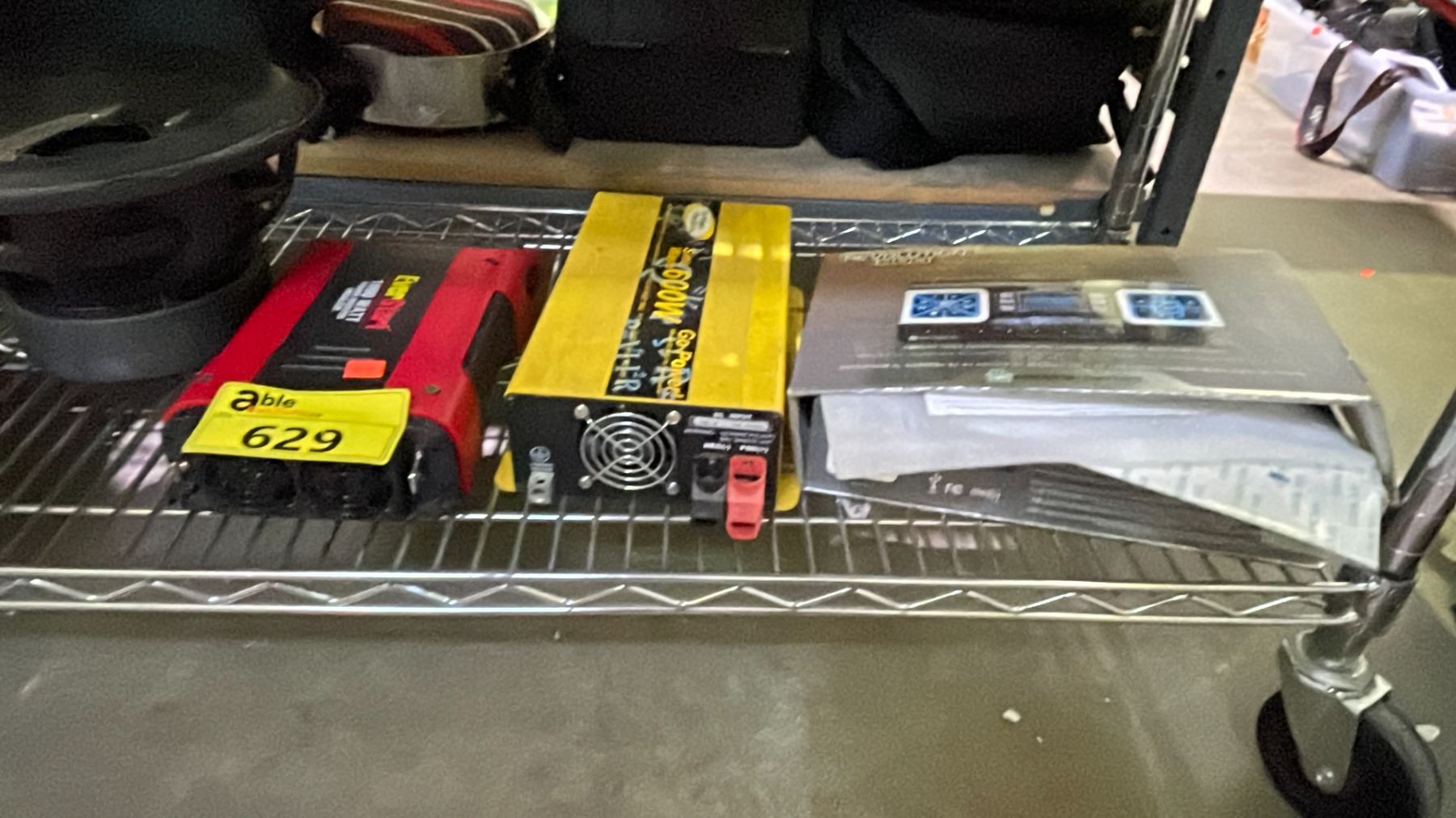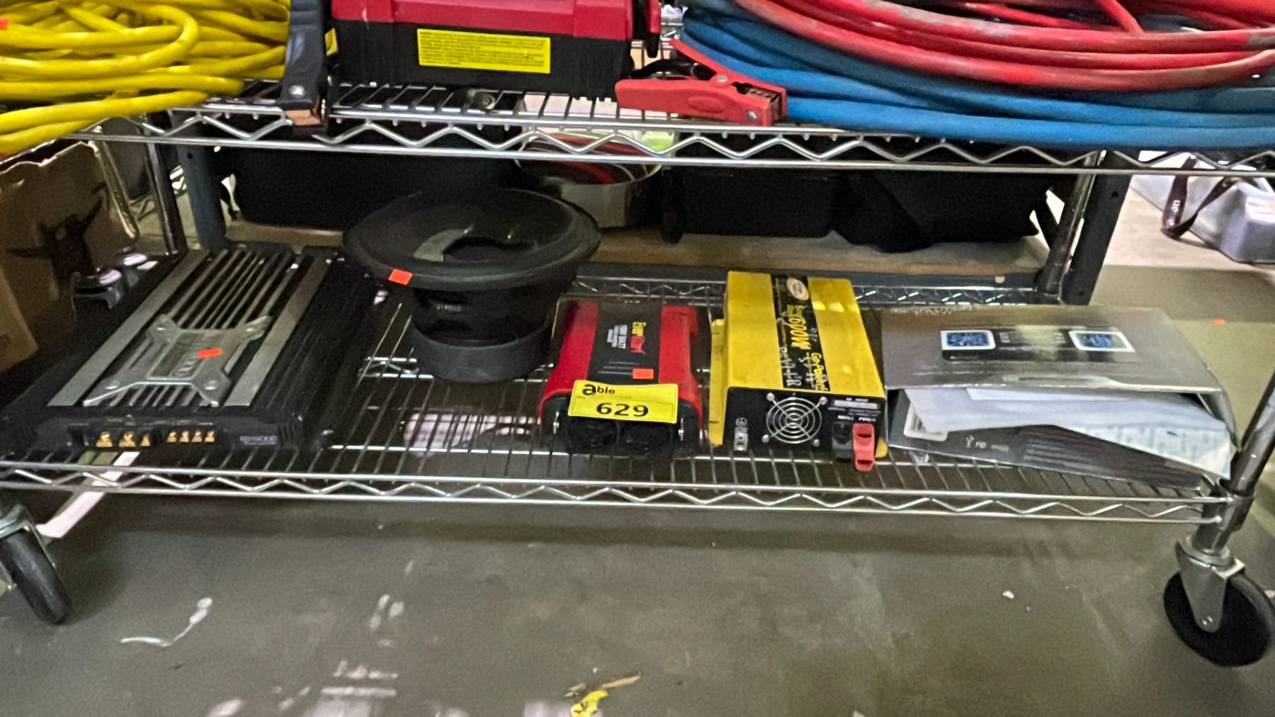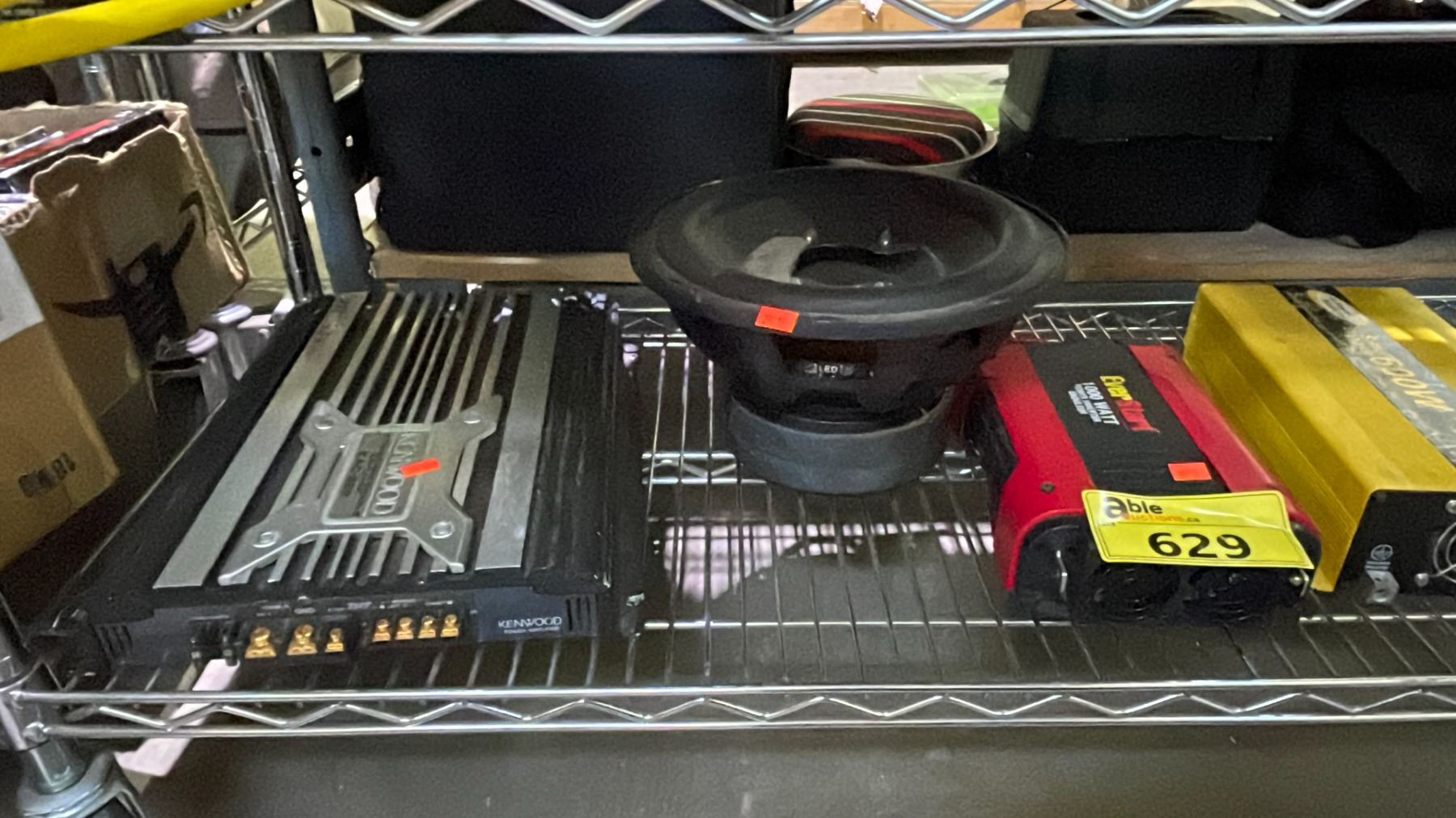 SHELF OF ASSORTED ITEMS INCLUDING; AMPLIFIER, CAR STEREO, POWER INVERTERS & MORE