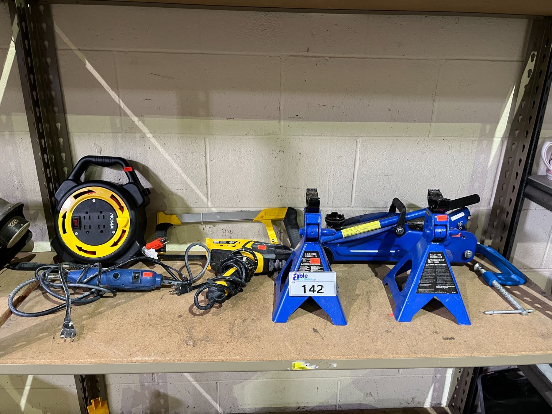 SHELF OF ASSORTED ITEMS INCLUDING; AXLE STANDS, TROLLEY JACK, HEAT GUN & MORE