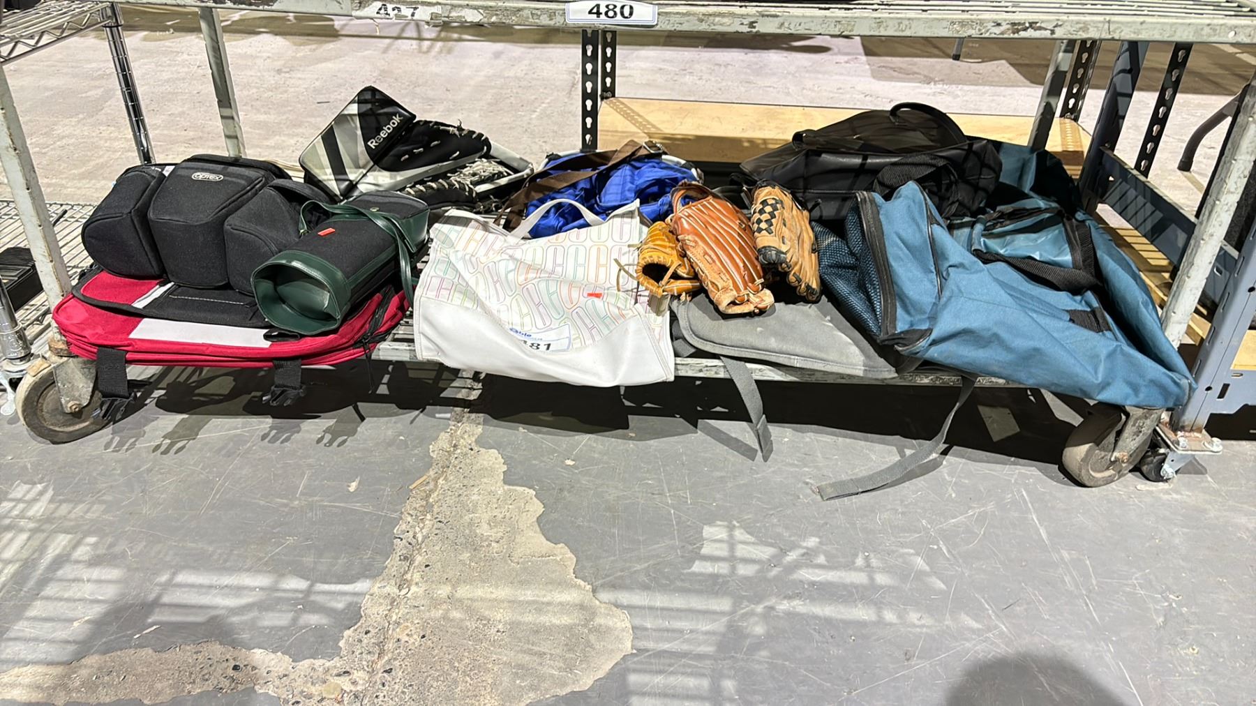 SHELF OF ASSORTED ITEMS INCLUDING; BASEBALL GLOVES, BAGS & STREET HOCKEY GOALIE GLOVE