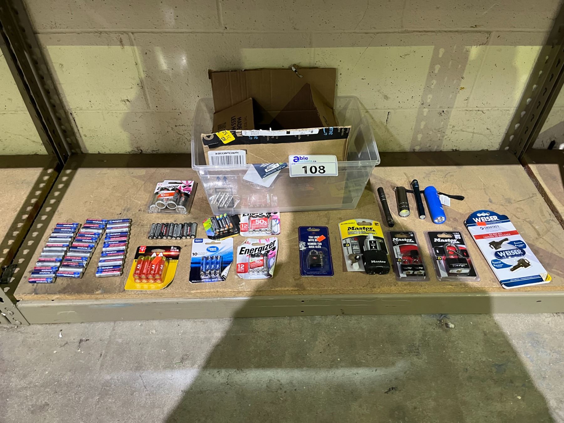 SHELF OF ASSORTED ITEMS INCLUDING; BATTERIES, LOCKS & KEYS & FLASHLIGHTS