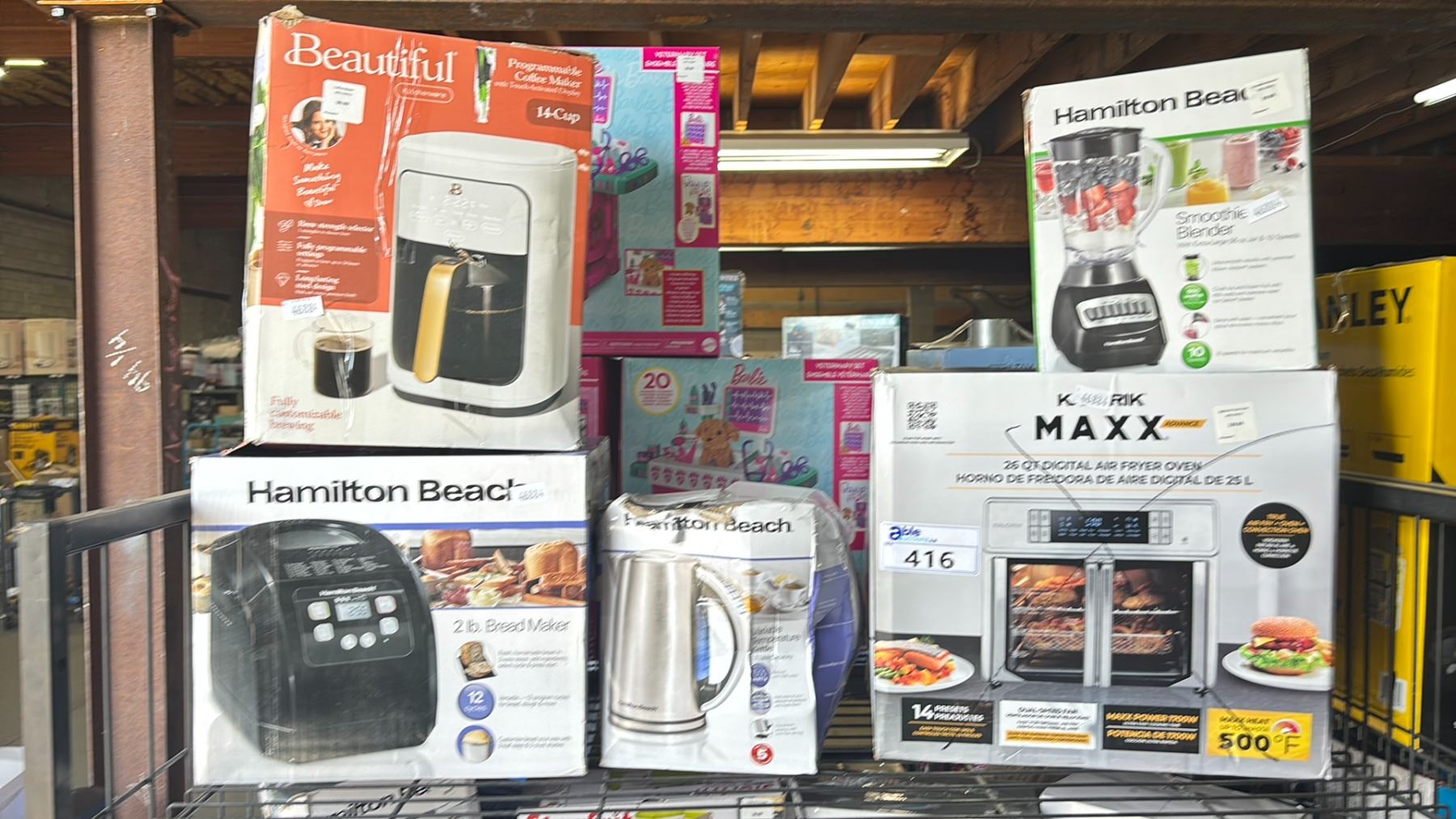 SHELF OF ASSORTED ITEMS INCLUDING; BEAUTIFUL PROGRAMMABLE COFFEE MAKER, HAMILTON BEACH BREAD MAKER, KALORIK MAXX ADVANCE 26QT DIGITAL AIR FRYER OVEN & MORE