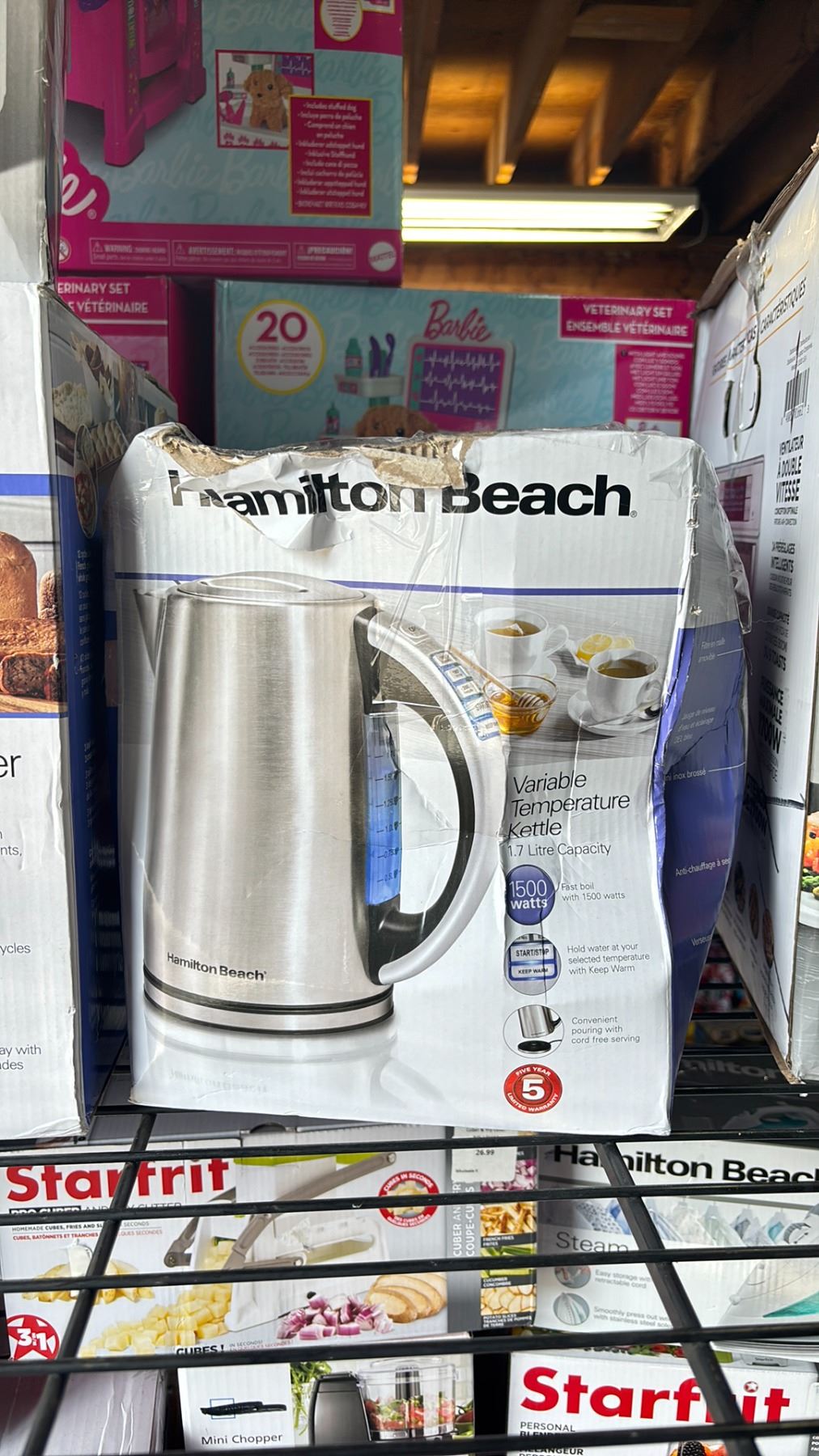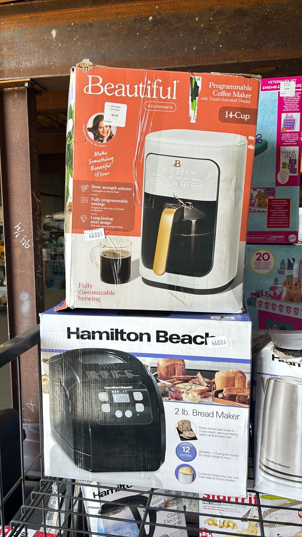 SHELF OF ASSORTED ITEMS INCLUDING; BEAUTIFUL PROGRAMMABLE COFFEE MAKER, HAMILTON BEACH BREAD MAKER,