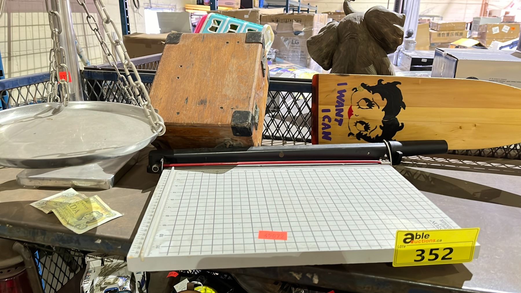 SHELF OF ASSORTED ITEMS INCLUDING; BETTY BOOP PADDLE, SCALE, CUTTING BOARD & MORE