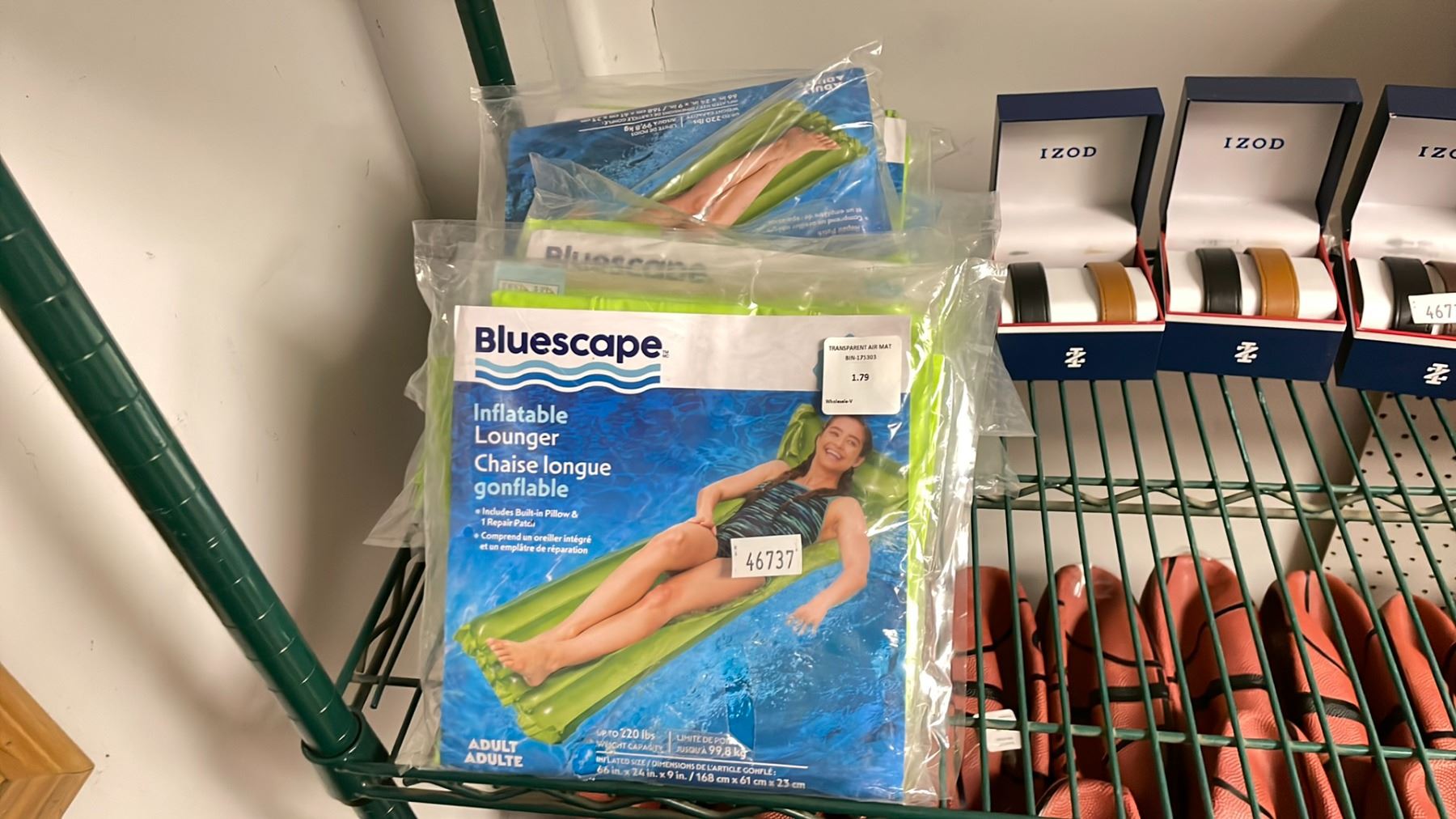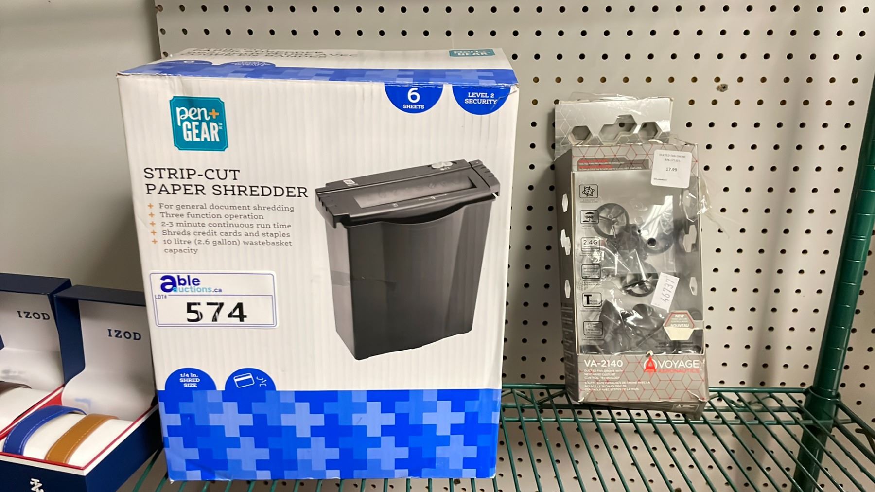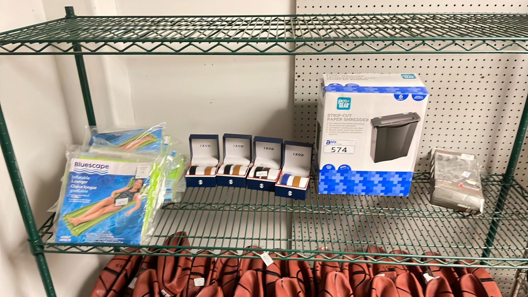 SHELF OF ASSORTED ITEMS INCLUDING; BLUESCAPE INFLATABLE POOL LOUNGERS, WATCH BANDS, PEN+GEAR STRIP-CUT PAPER SHREDDER & VOYAGE DRONE