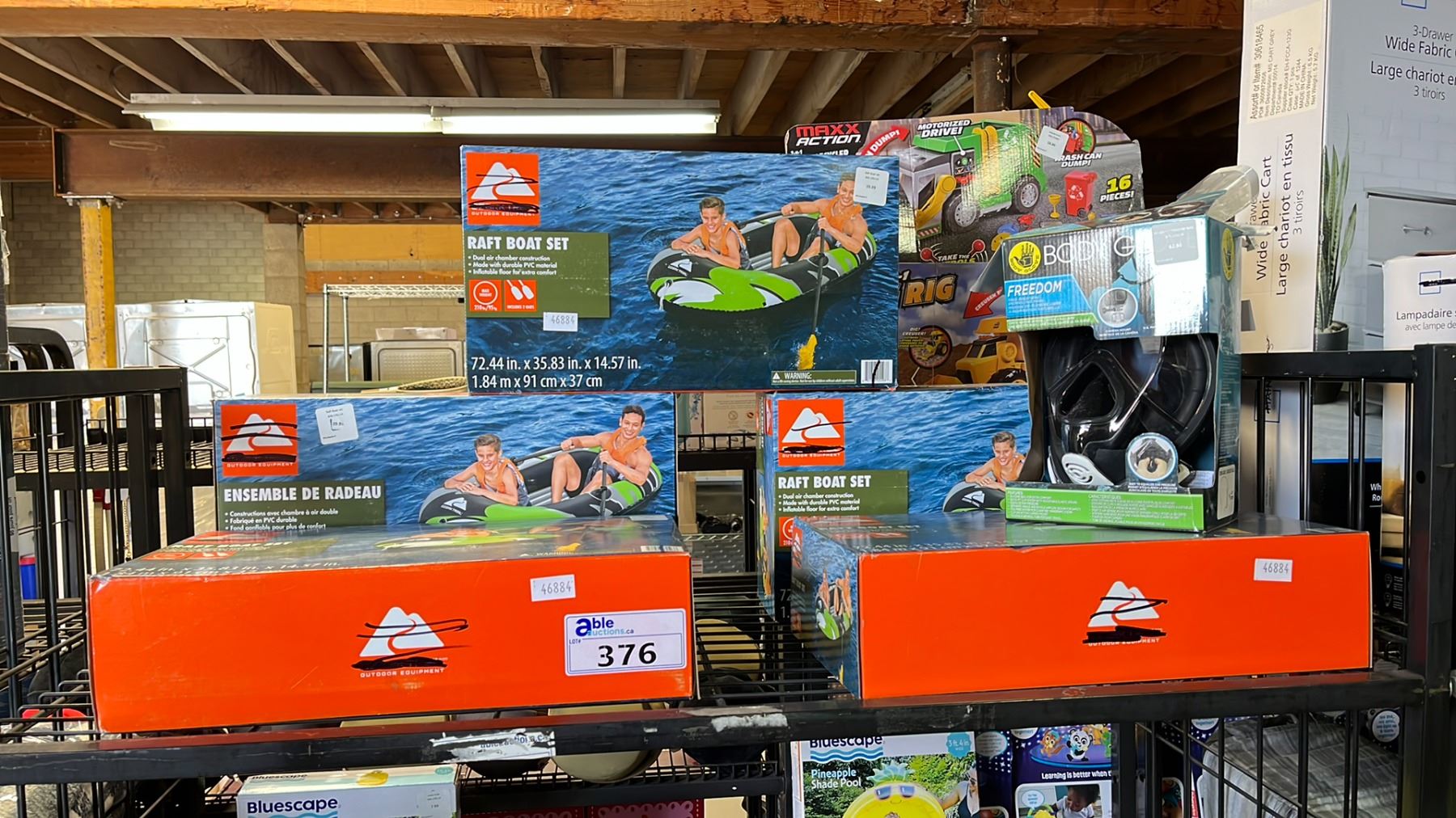 SHELF OF ASSORTED ITEMS INCLUDING; BODY GLOVE FREEDOM FREE BREATHING SNORKELING MASK & 4 OZARK TRAIL RAFT BOAT SETS