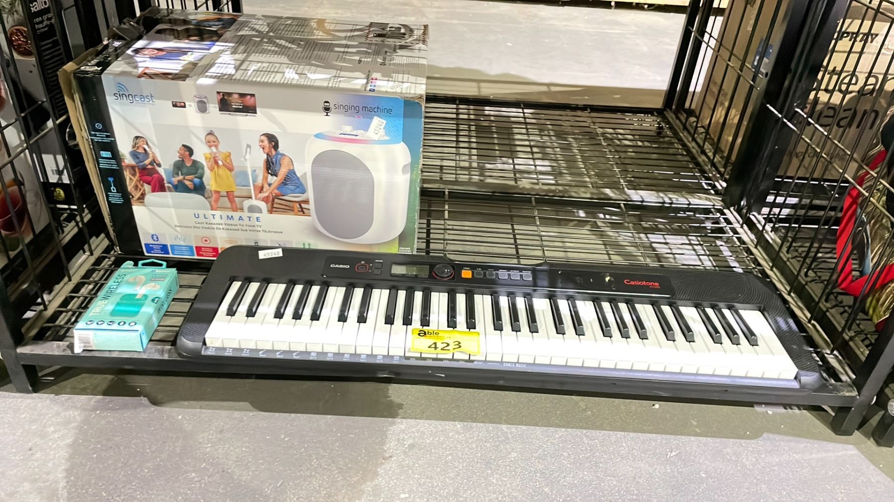 SHELF OF ASSORTED ITEMS INCLUDING; CASIO DIGITAL PIANO, SINGCAST ULTIMATE KARAOKE MACHINE & TRUE WIRELESS EARBUDS (UNKNOWN WORKING CONDITION, MAY BE MISSING PIECES)