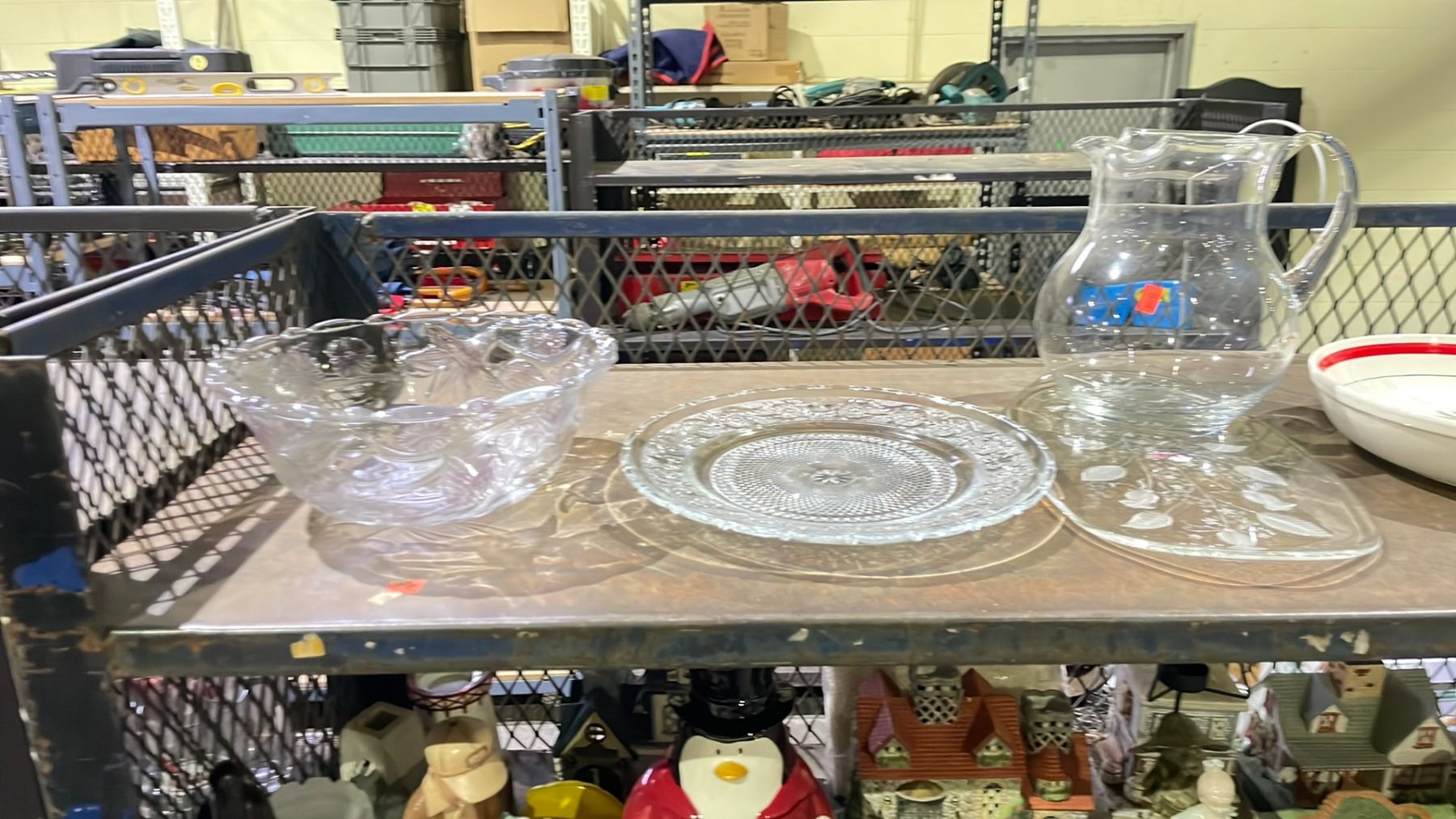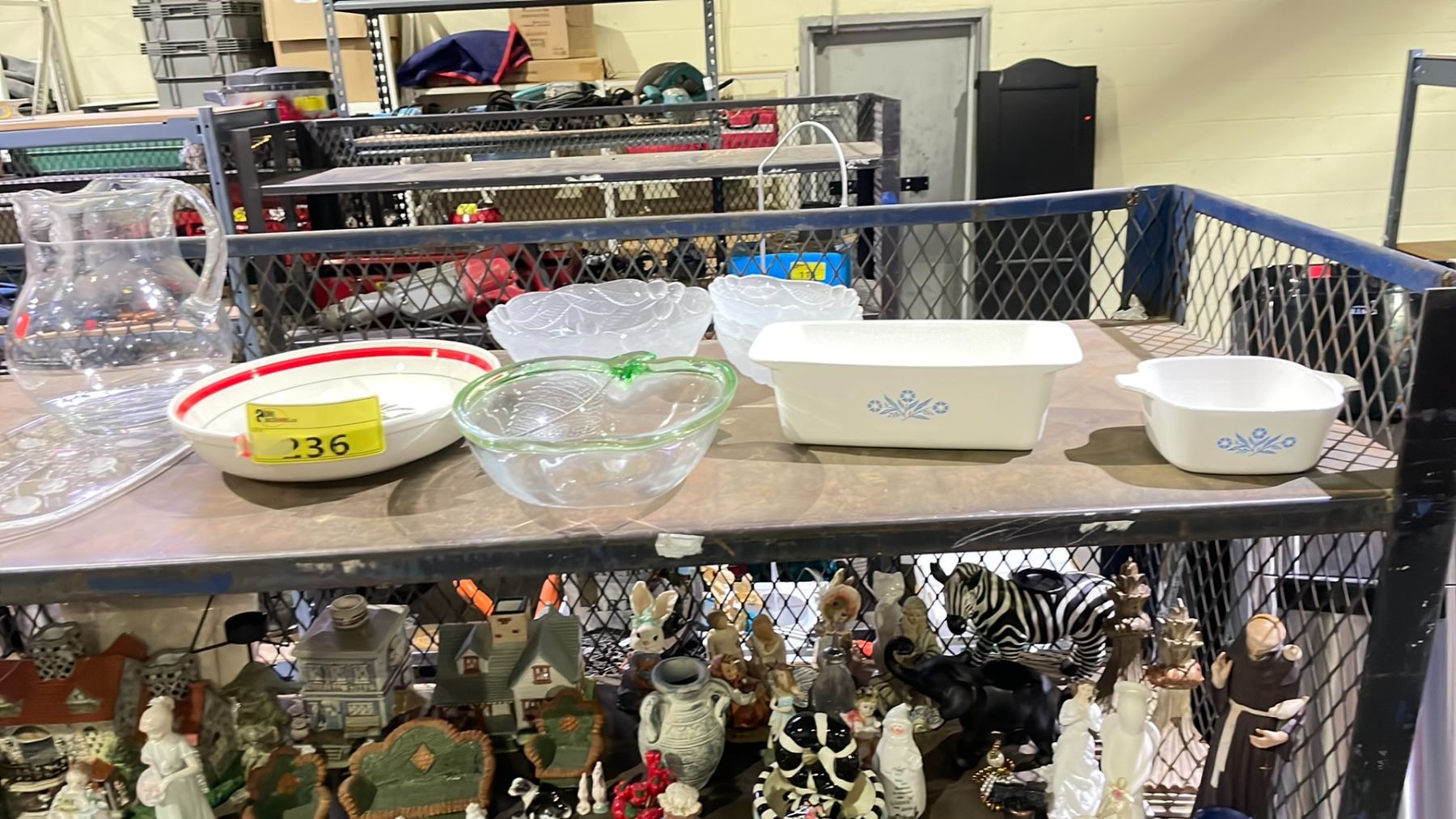 SHELF OF ASSORTED ITEMS INCLUDING; CASSEROLE DISHES, GLASS PITCHER, BOWL & MORE