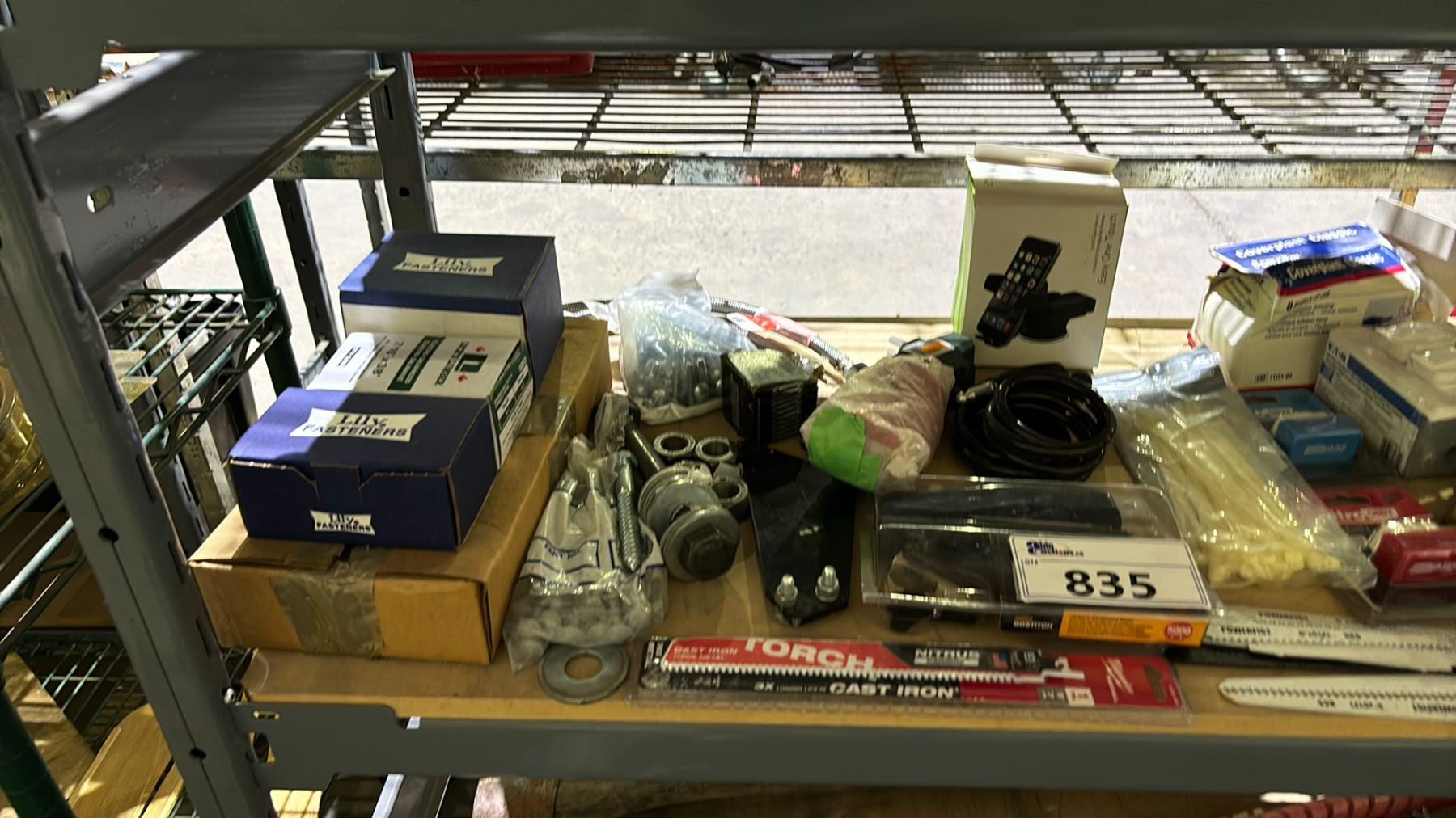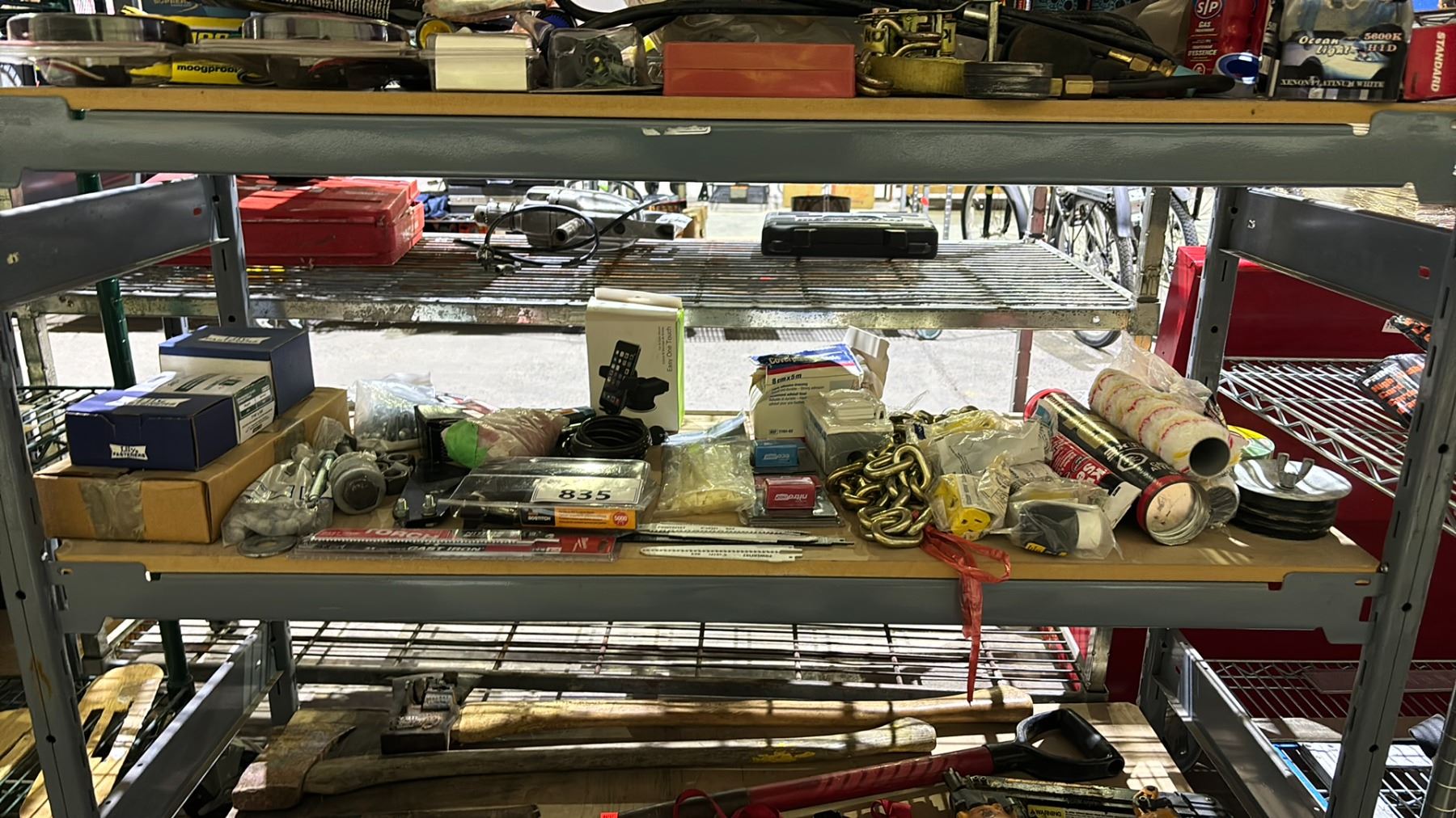SHELF OF ASSORTED ITEMS INCLUDING; CHAIN, RECIPROCATING SAW BLADES, FASTENERS & MORE