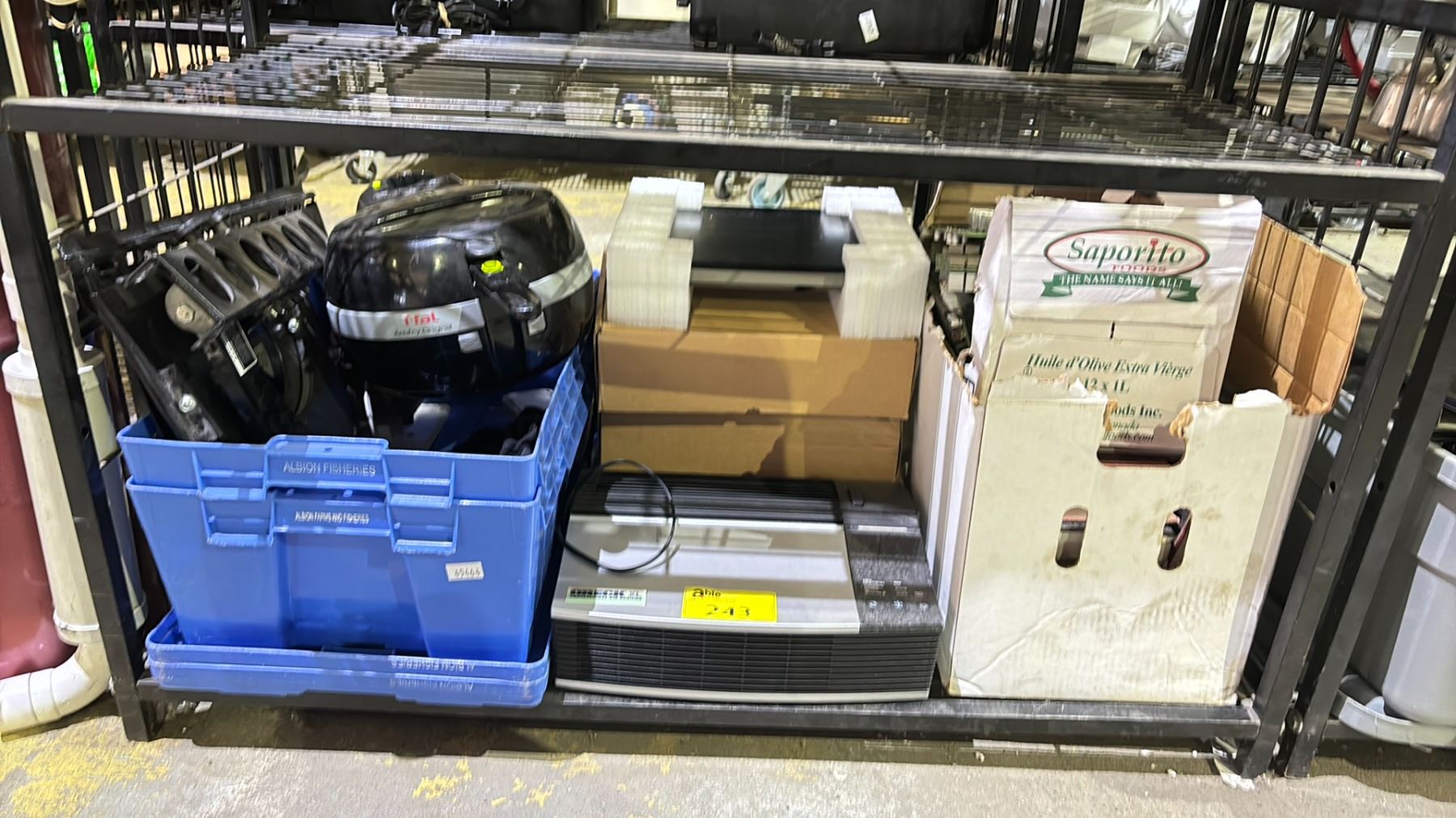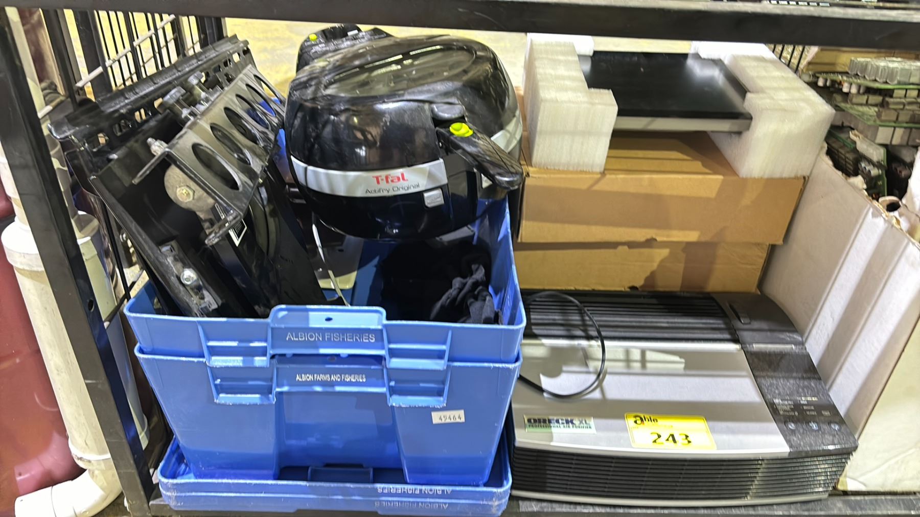 SHELF OF ASSORTED ITEMS INCLUDING; COMPUTER PARTS, AIR PURIFIER, TFAL ACTIFRY ORIGINAL & MORE