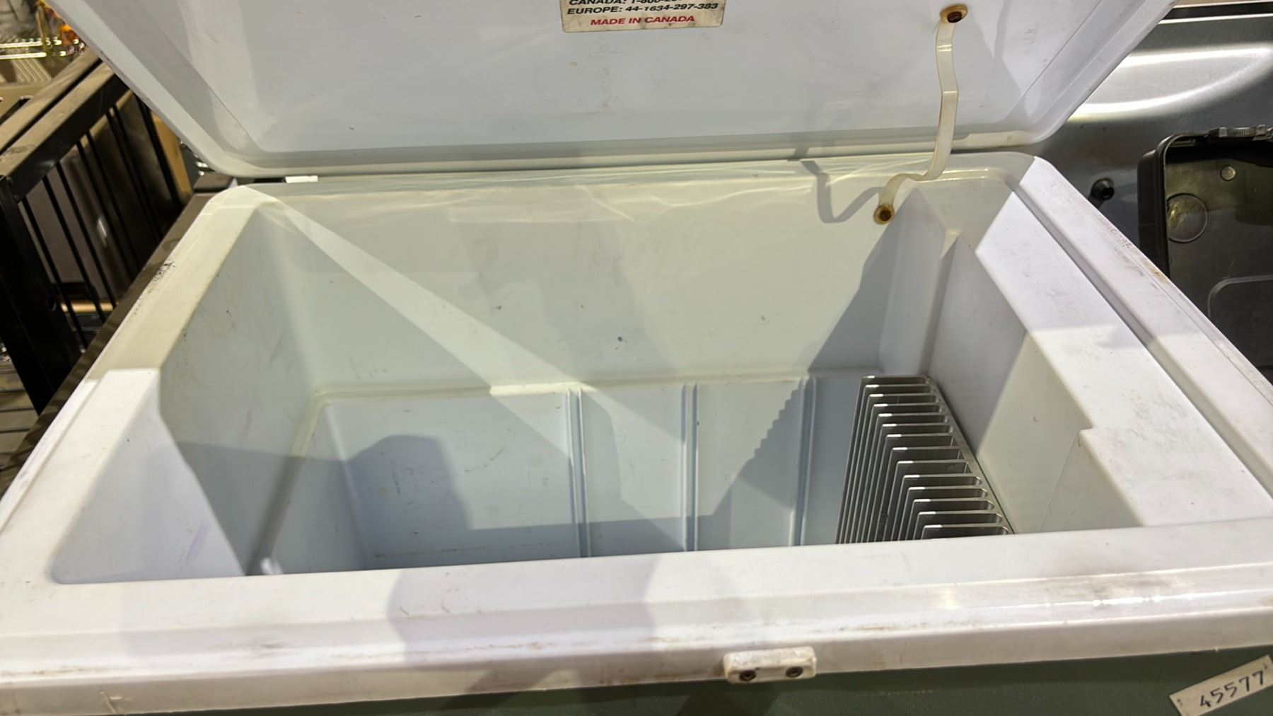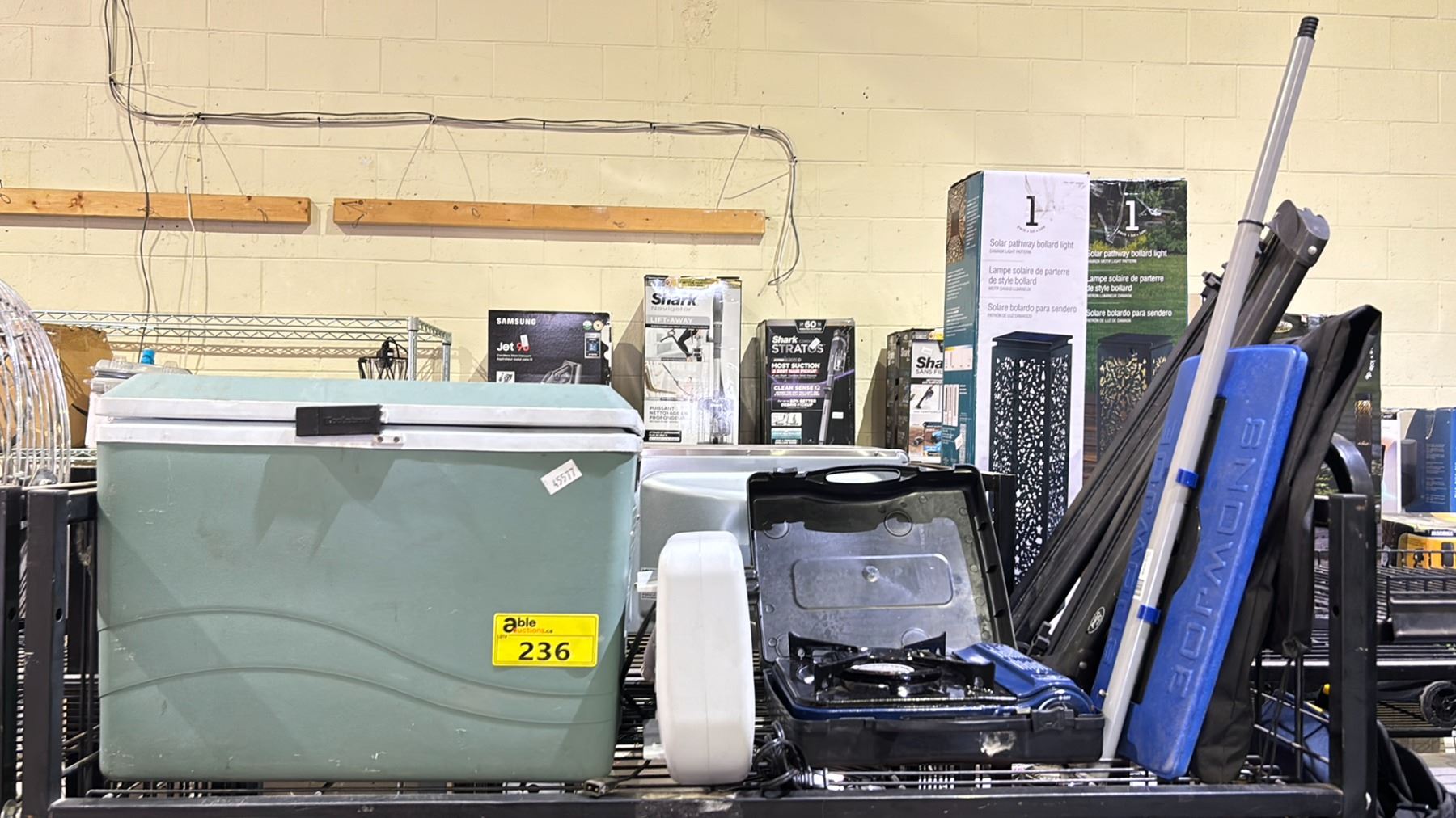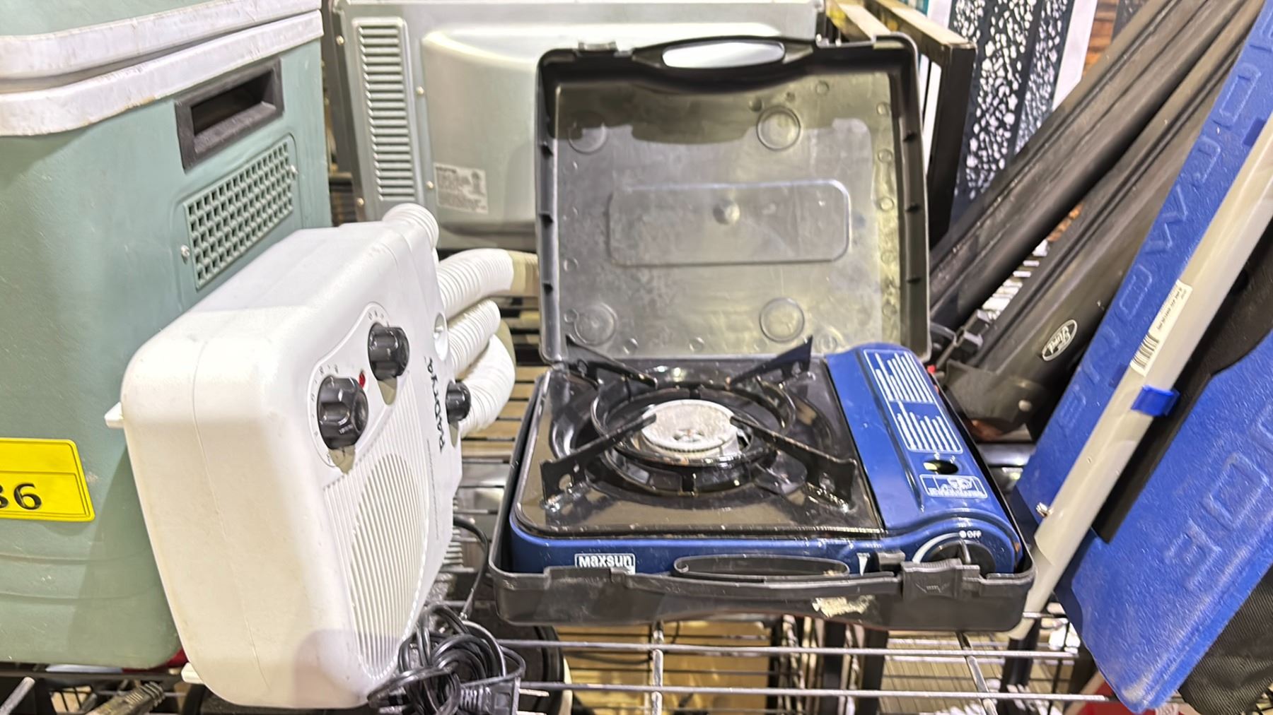 SHELF OF ASSORTED ITEMS INCLUDING; COOLER, CASSETTE STOVE, R4DRY4 FAN & MORE