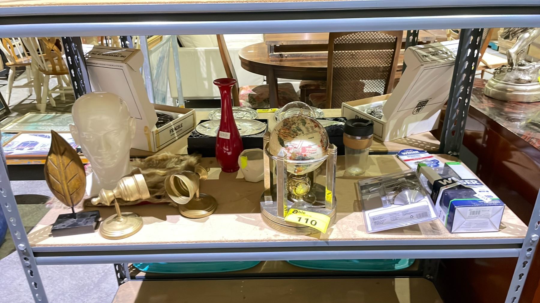 SHELF OF ASSORTED ITEMS INCLUDING; DESK CLOCKS, DOOR HANDLES, VASE, DECOR & MORE