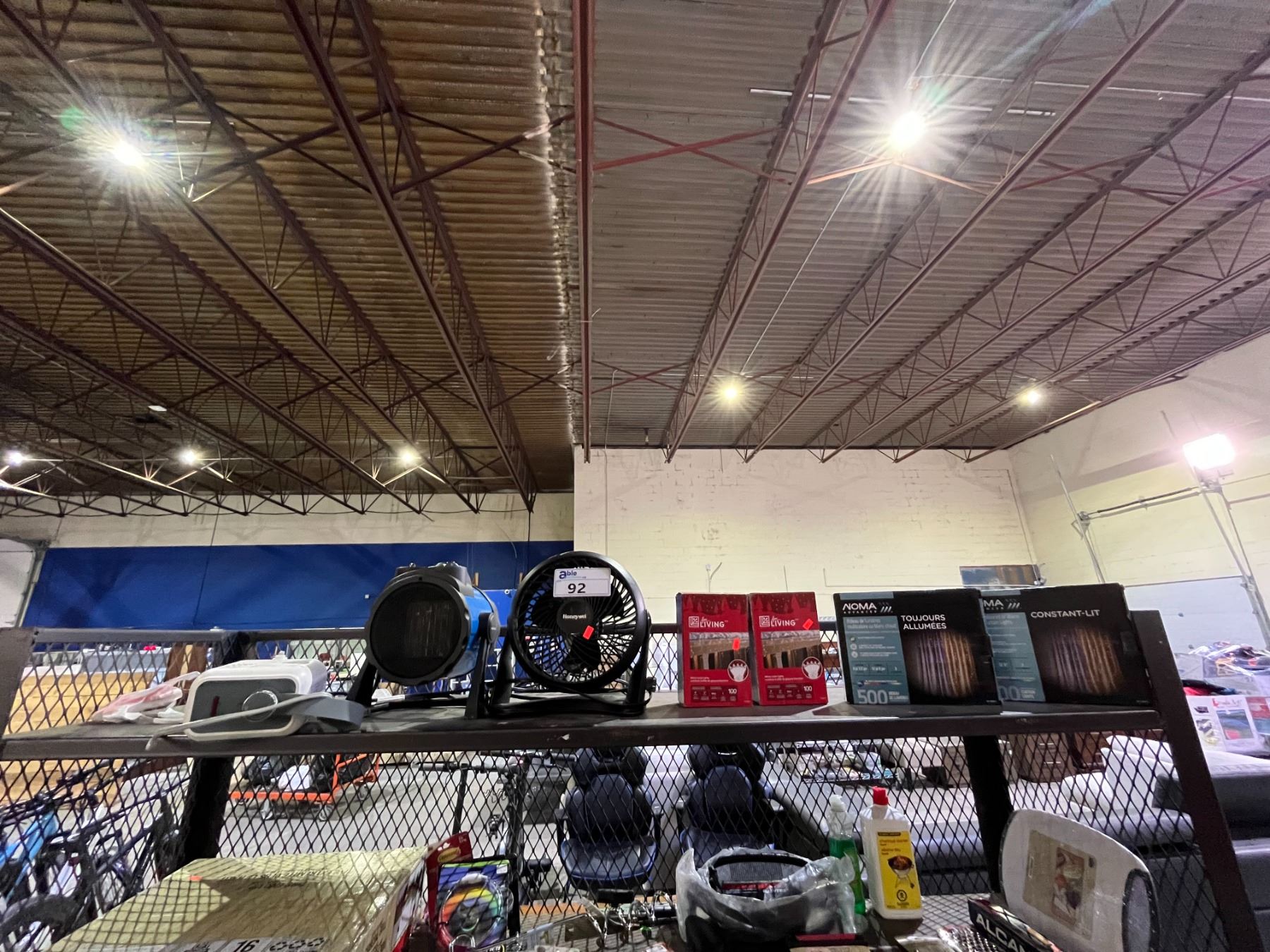 SHELF OF ASSORTED ITEMS INCLUDING; DESK FAN, DESK HEATER, WHITE CURTAIN LIGHTS & MORE