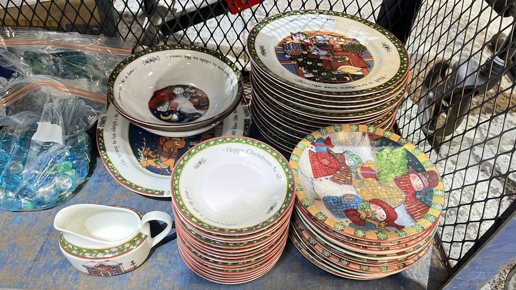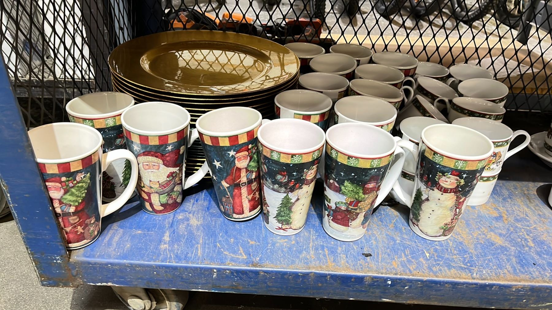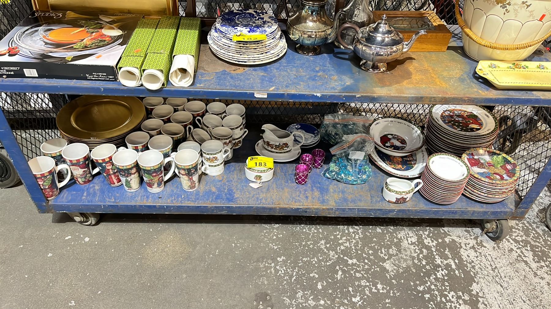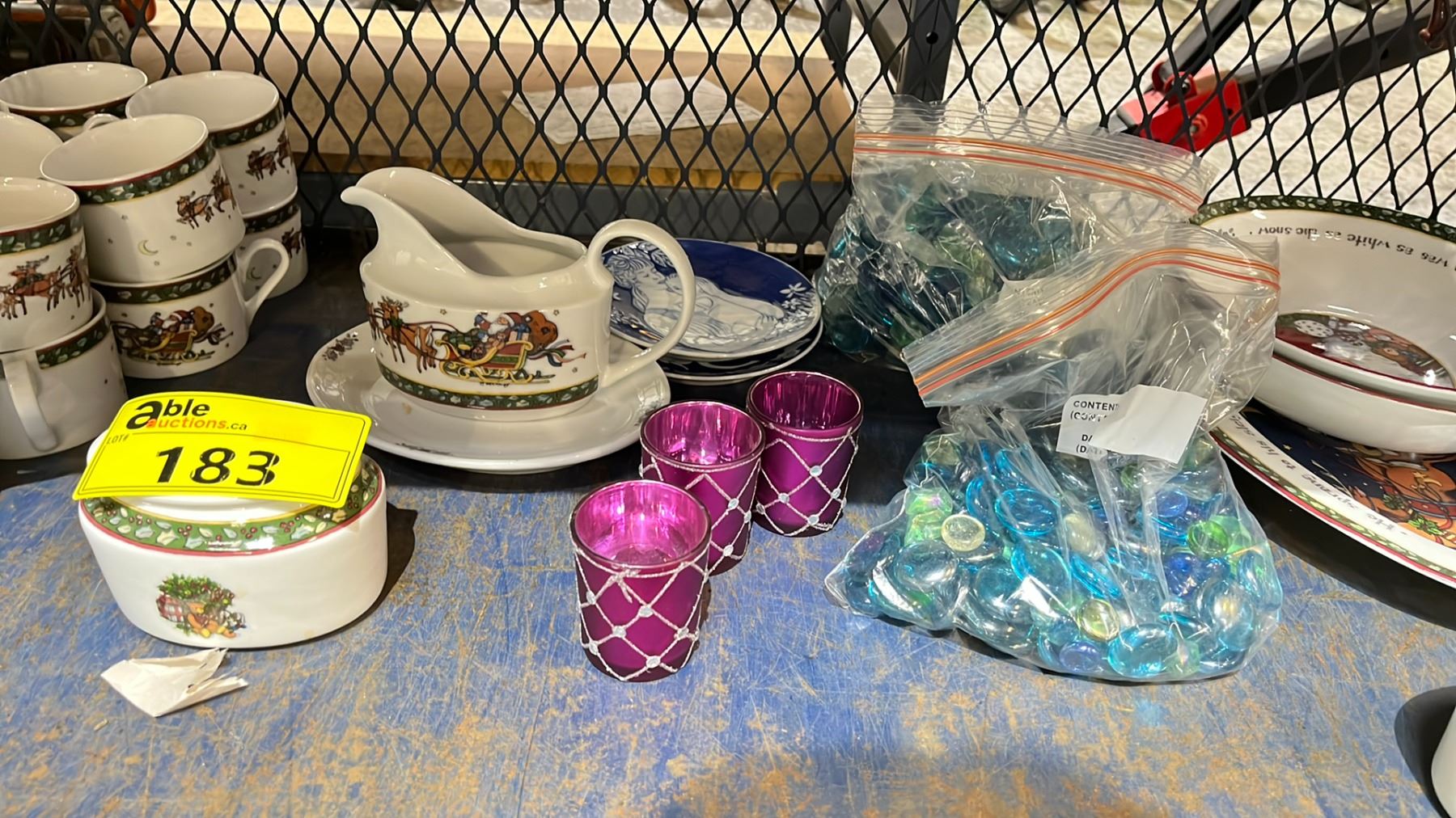 SHELF OF ASSORTED ITEMS INCLUDING; DINNERWARE, CHRISTMAS MUGS, FIREPLACE STONES & MORE
