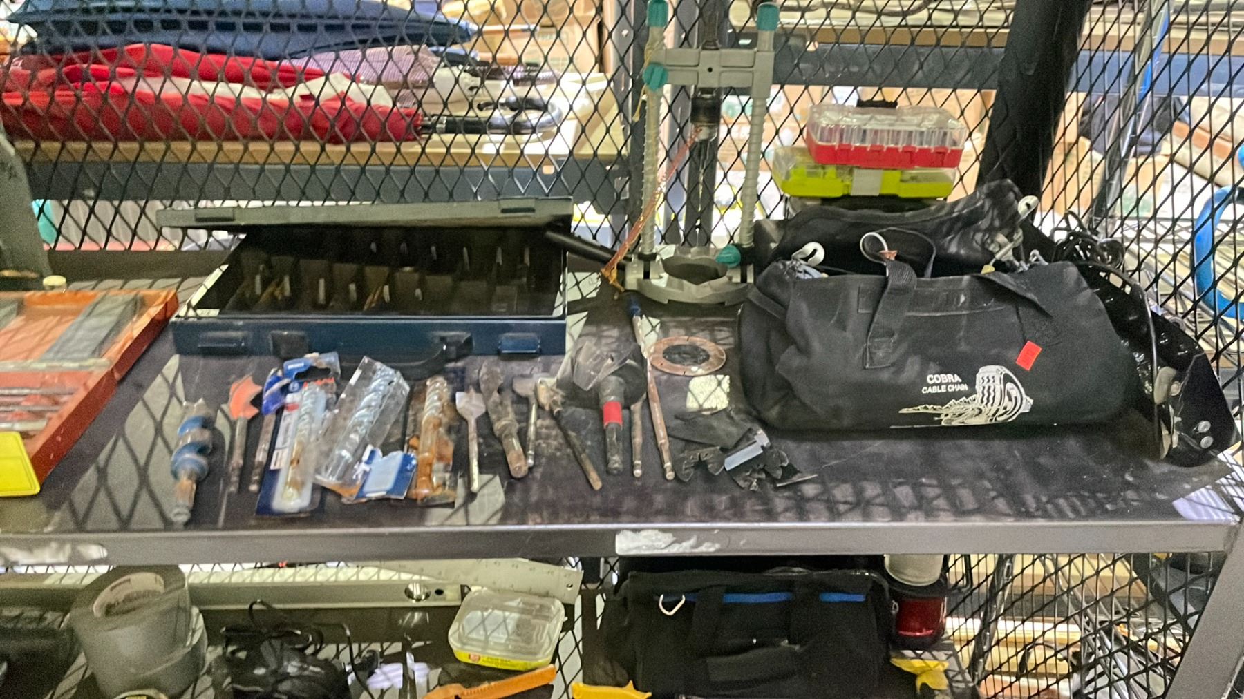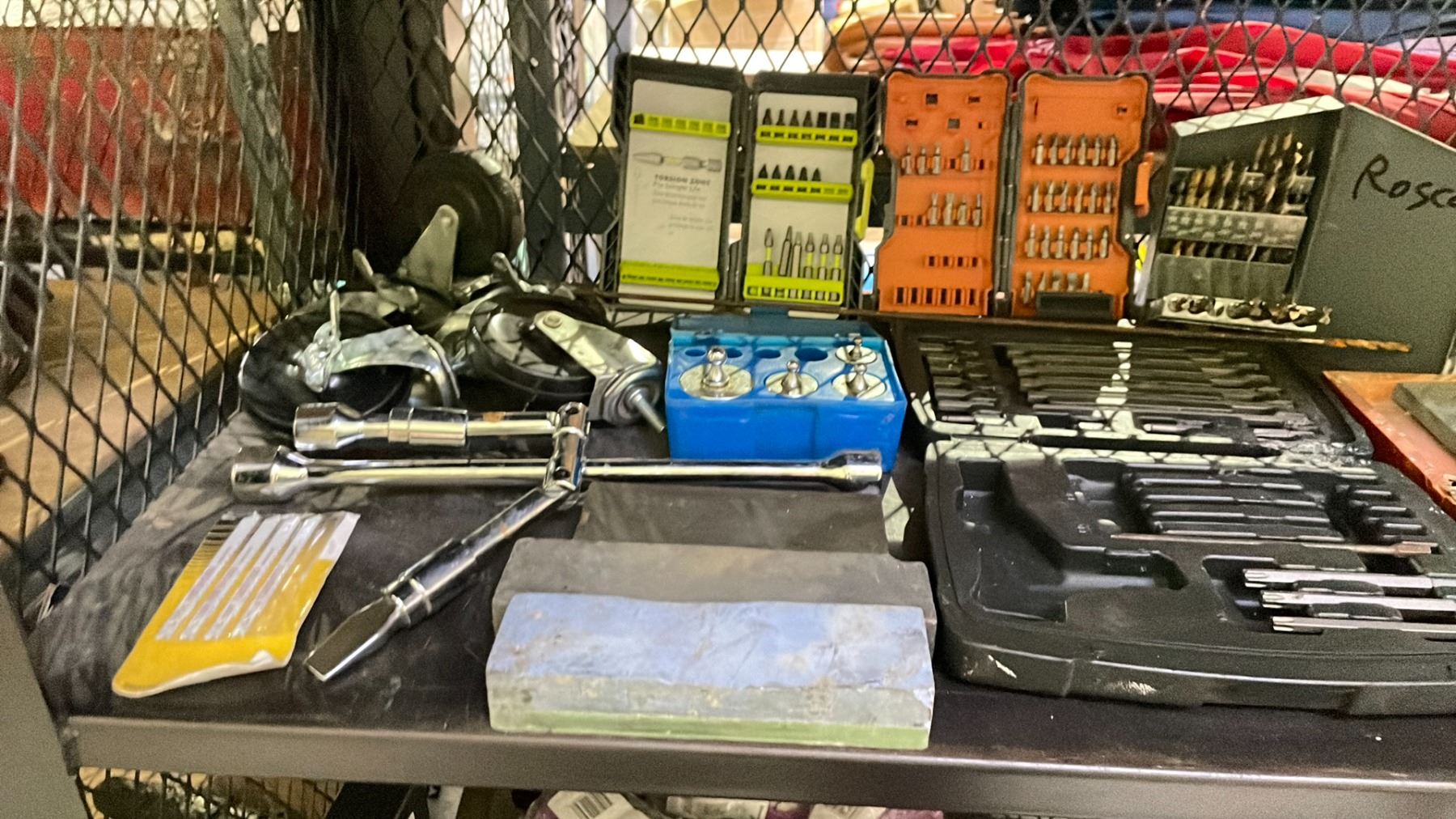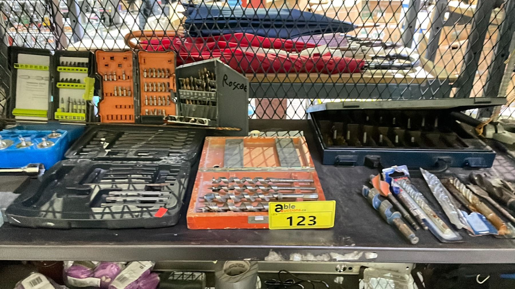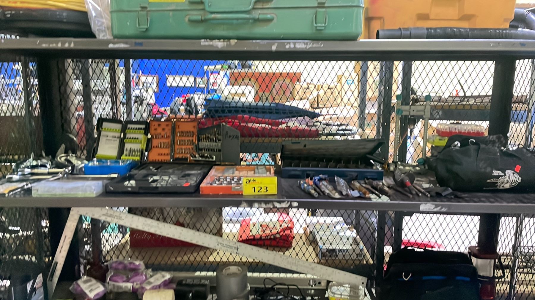 SHELF OF ASSORTED ITEMS INCLUDING; DRILL BITS, CASTER WHEELS, WEIGHTS & MORE