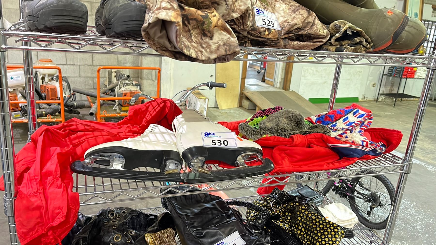 SHELF OF ASSORTED ITEMS INCLUDING; FIGURE SKATES, TOQUES & WINTER JACKET