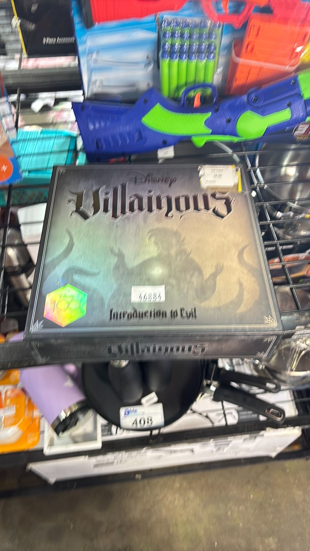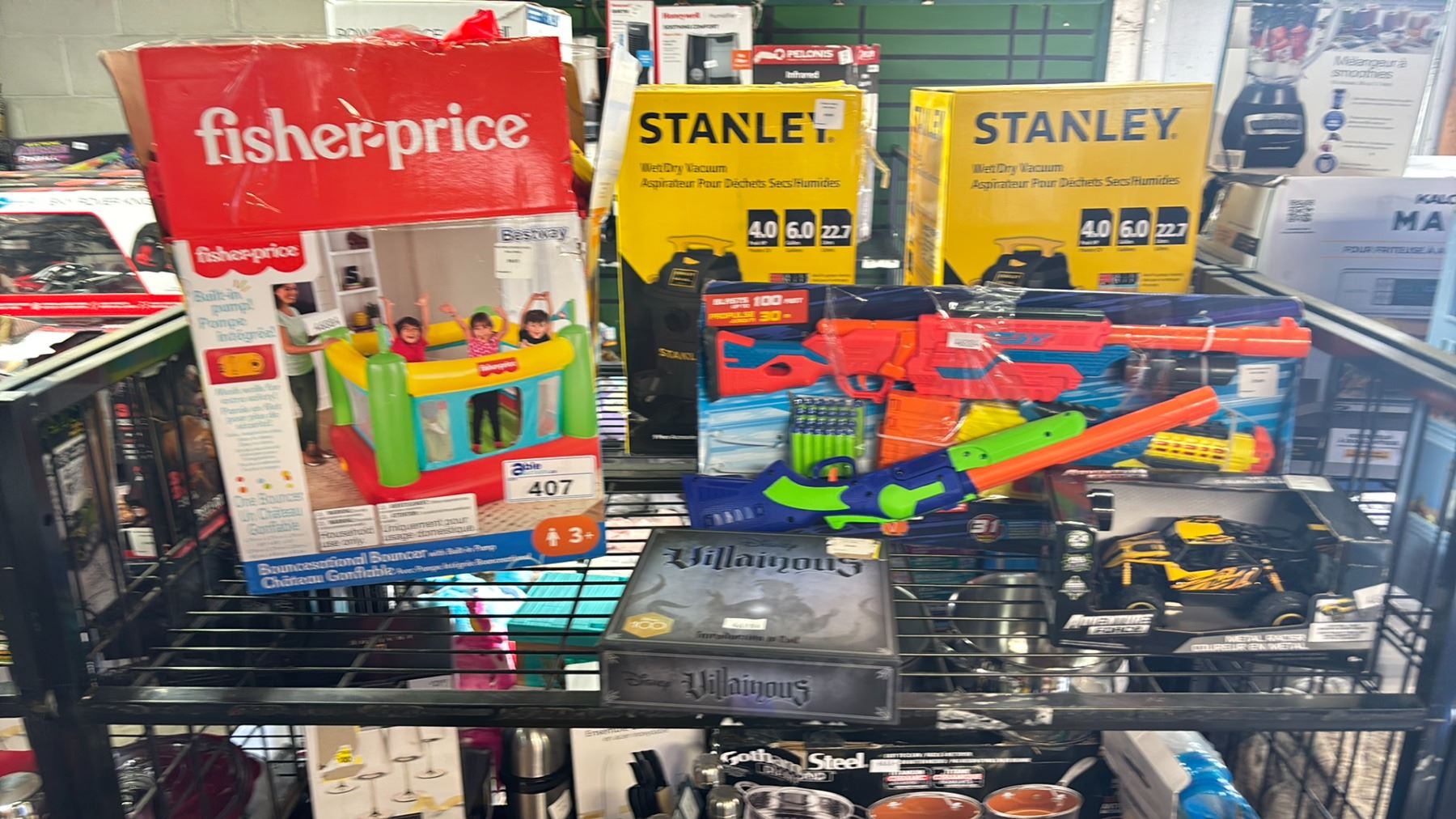 SHELF OF ASSORTED ITEMS INCLUDING; FISHER PRICE BOUNCESATINOAL BOUNCER, DISNEY VILLAINOUS BOARD GAME, ADVENTURE FORCE FOAM GUN & MORE