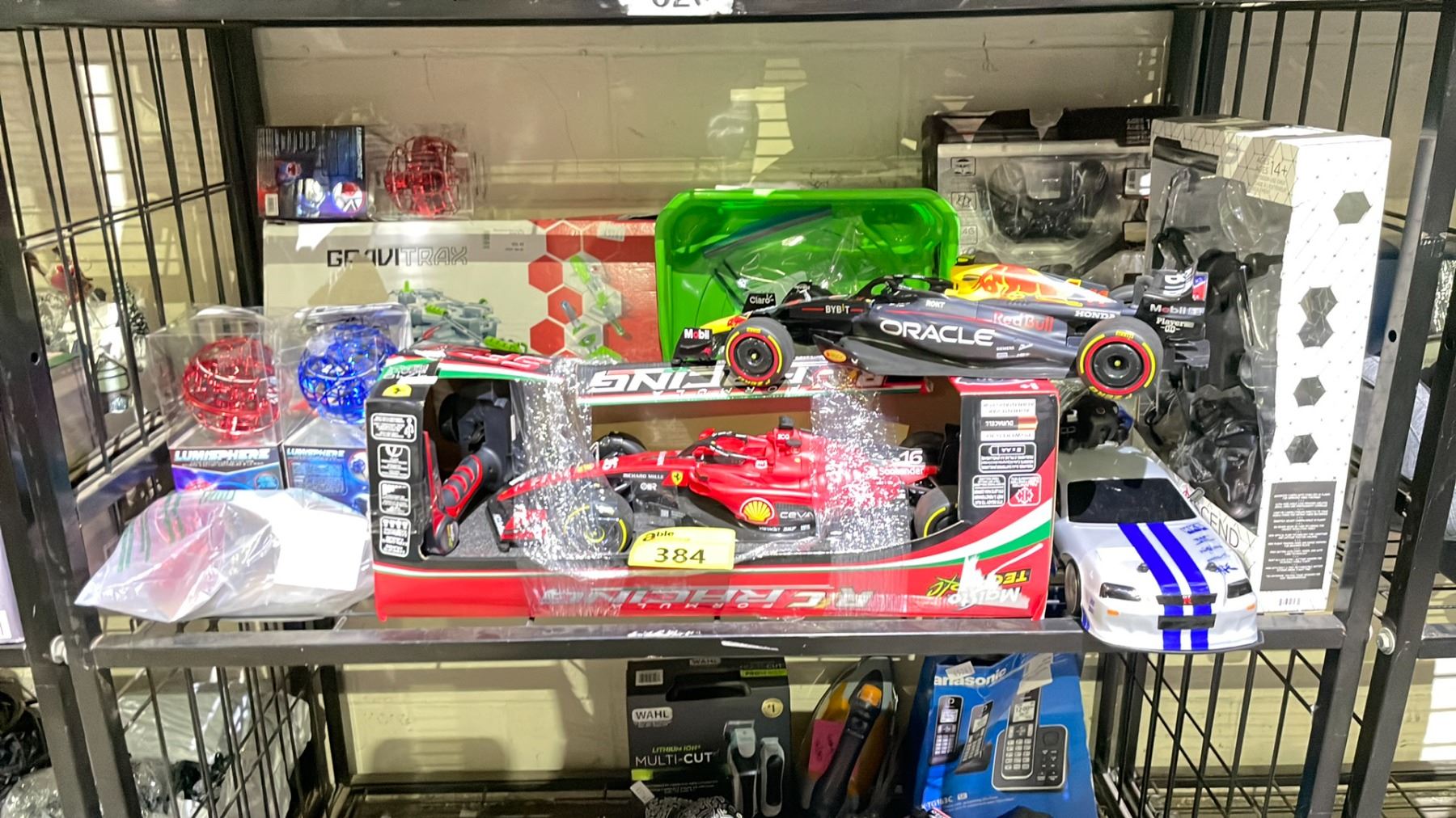 SHELF OF ASSORTED ITEMS INCLUDING; FORMULA ONE RC RACING CARS, DRONES, LUMISPHERES & MORE (UNKNOWN