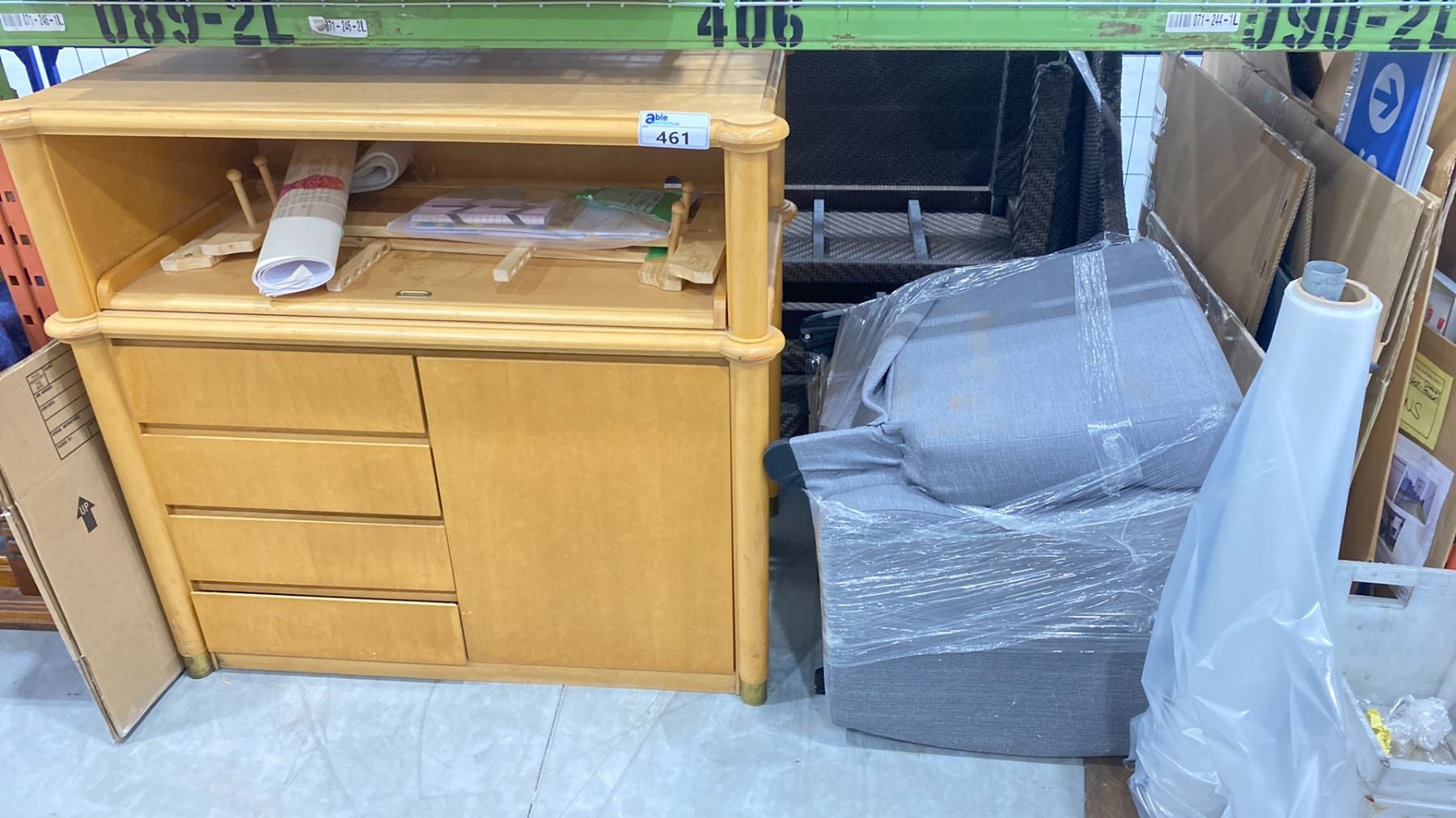 SHELF OF ASSORTED ITEMS INCLUDING; FURNITURE, SET DEC SIGNS, ROLL OF CLEAR GARBAGE BAGS & MORE