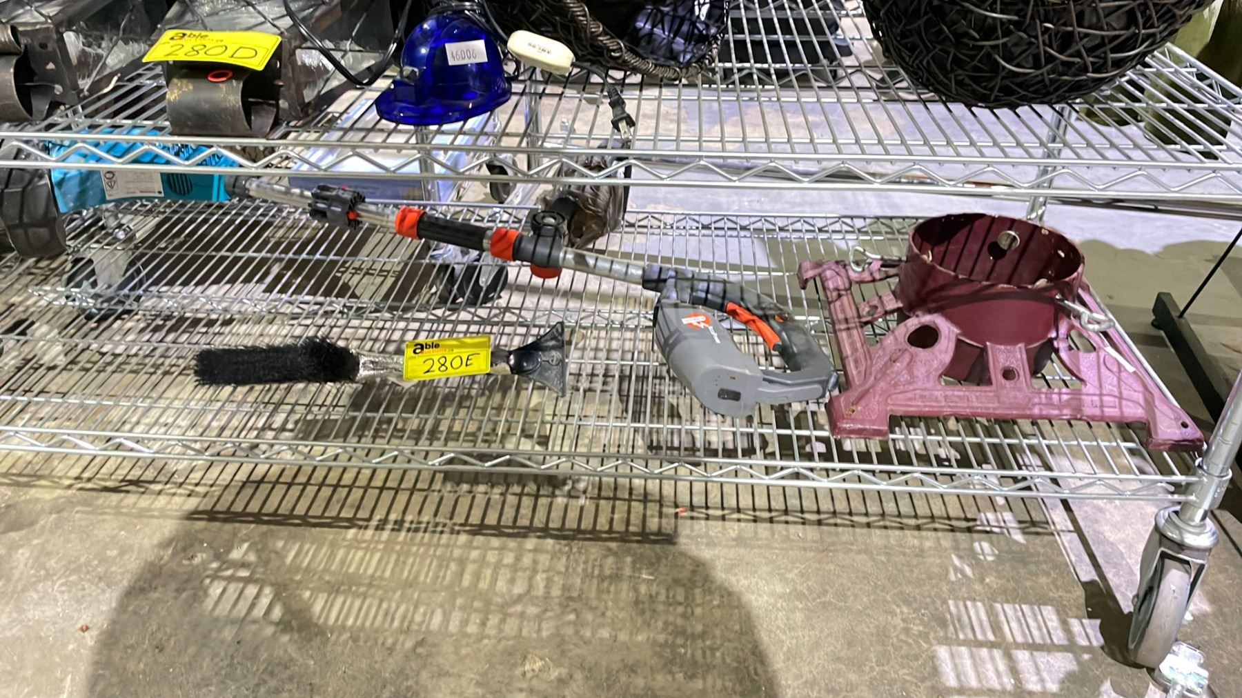 SHELF OF ASSORTED ITEMS INCLUDING; GARDENA CORDLESS TRIMMER, WINDSHIELD BRUSH/SCRAPER & CHRISTMAS TREE BASE