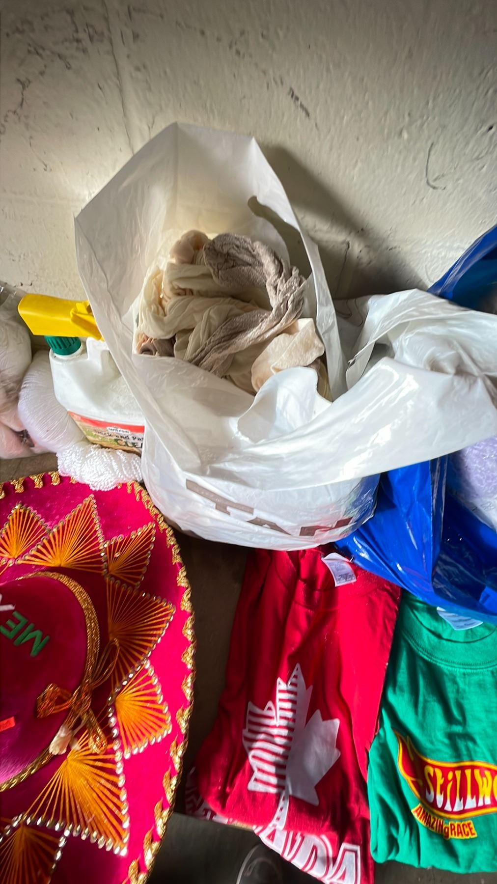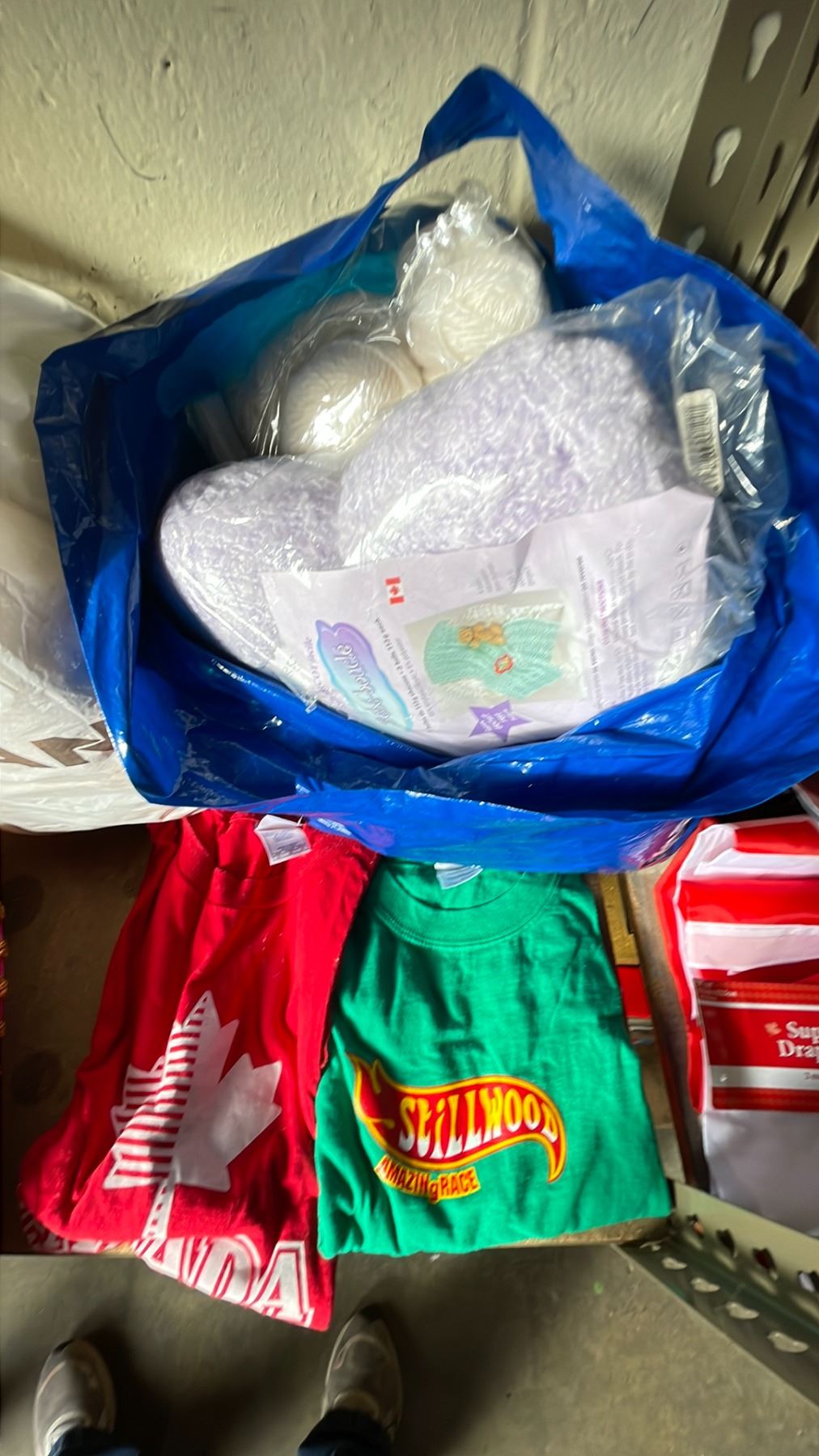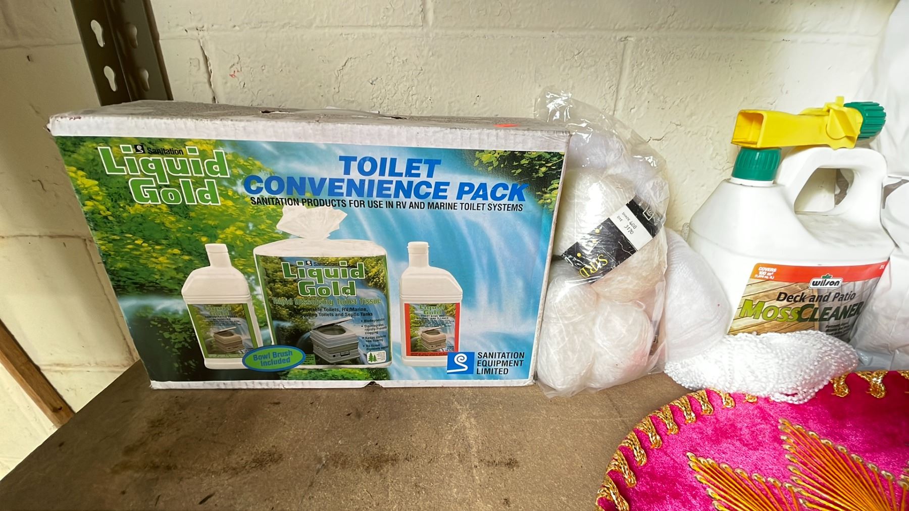 SHELF OF ASSORTED ITEMS INCLUDING; GONZALEZ HAT, SHIRTS, LIQUID GOLD TOILER CONVENIENCE PACK & MORE