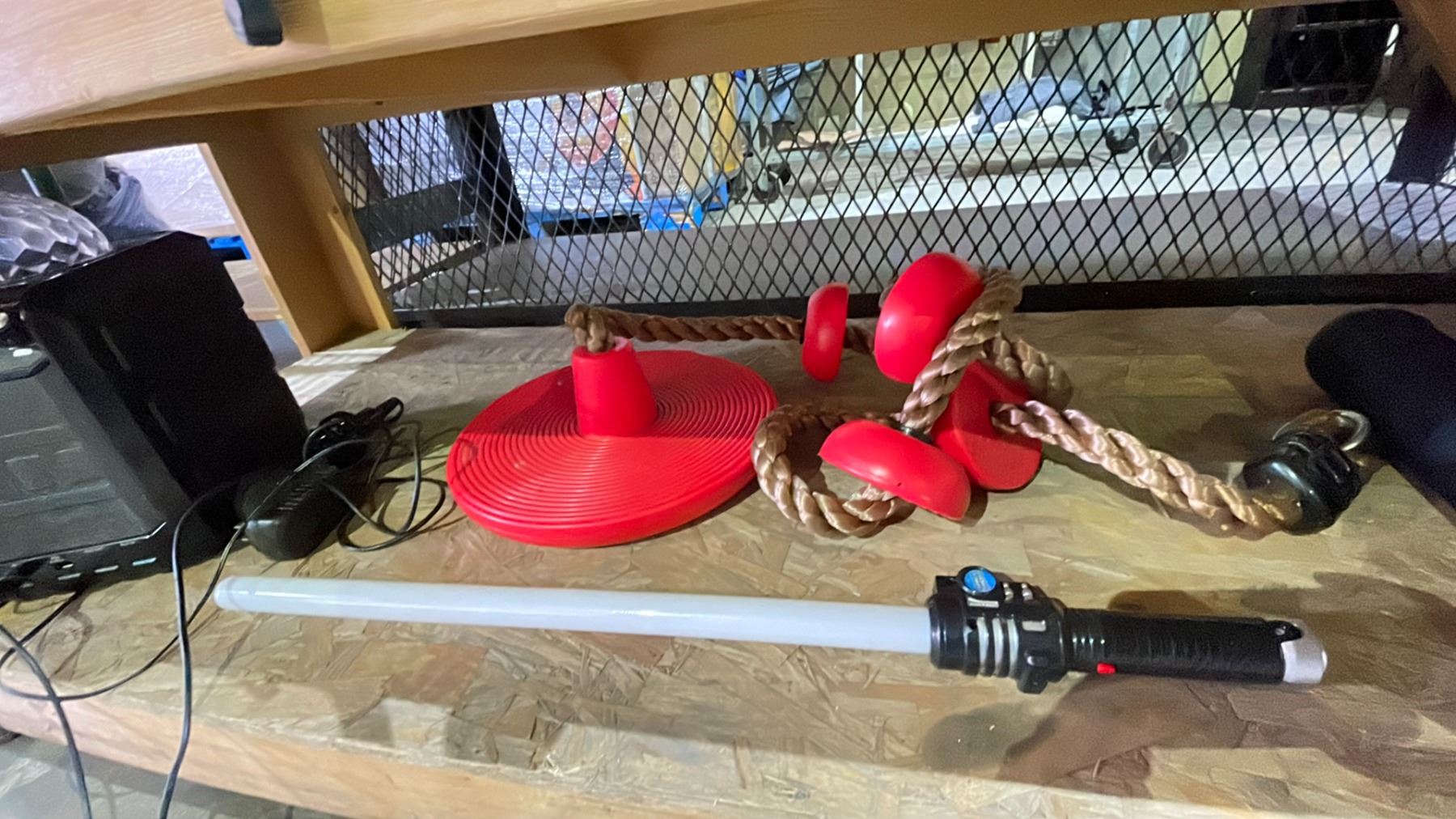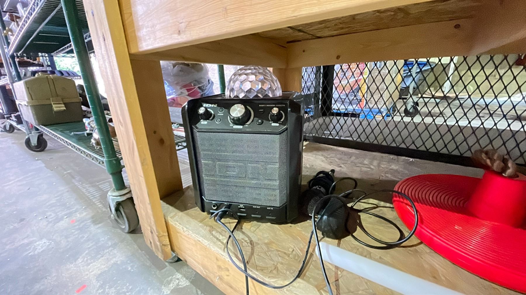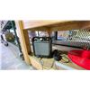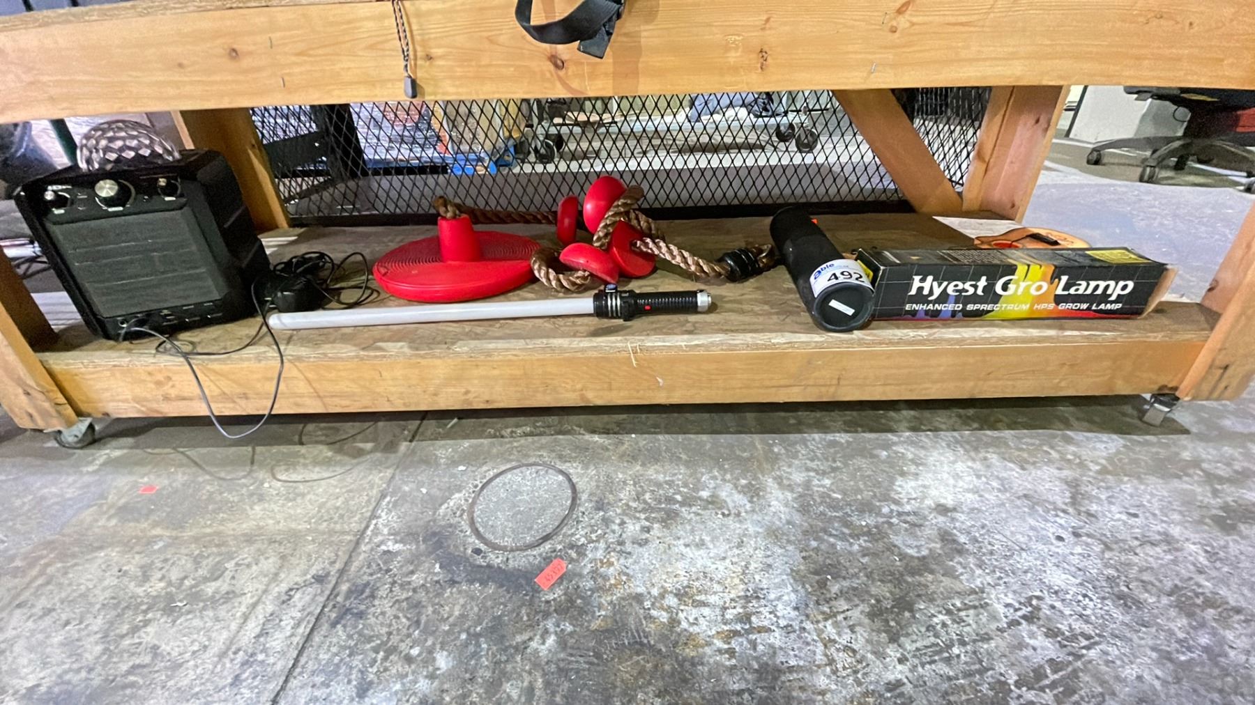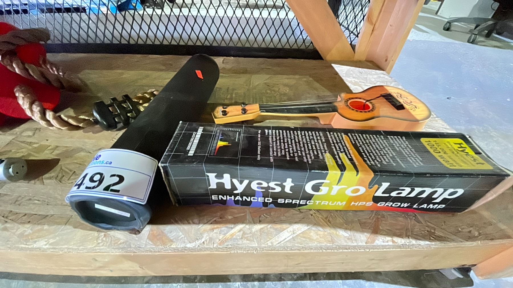 SHELF OF ASSORTED ITEMS INCLUDING; GROW LAMP, ROPE SWING, AMP & MORE