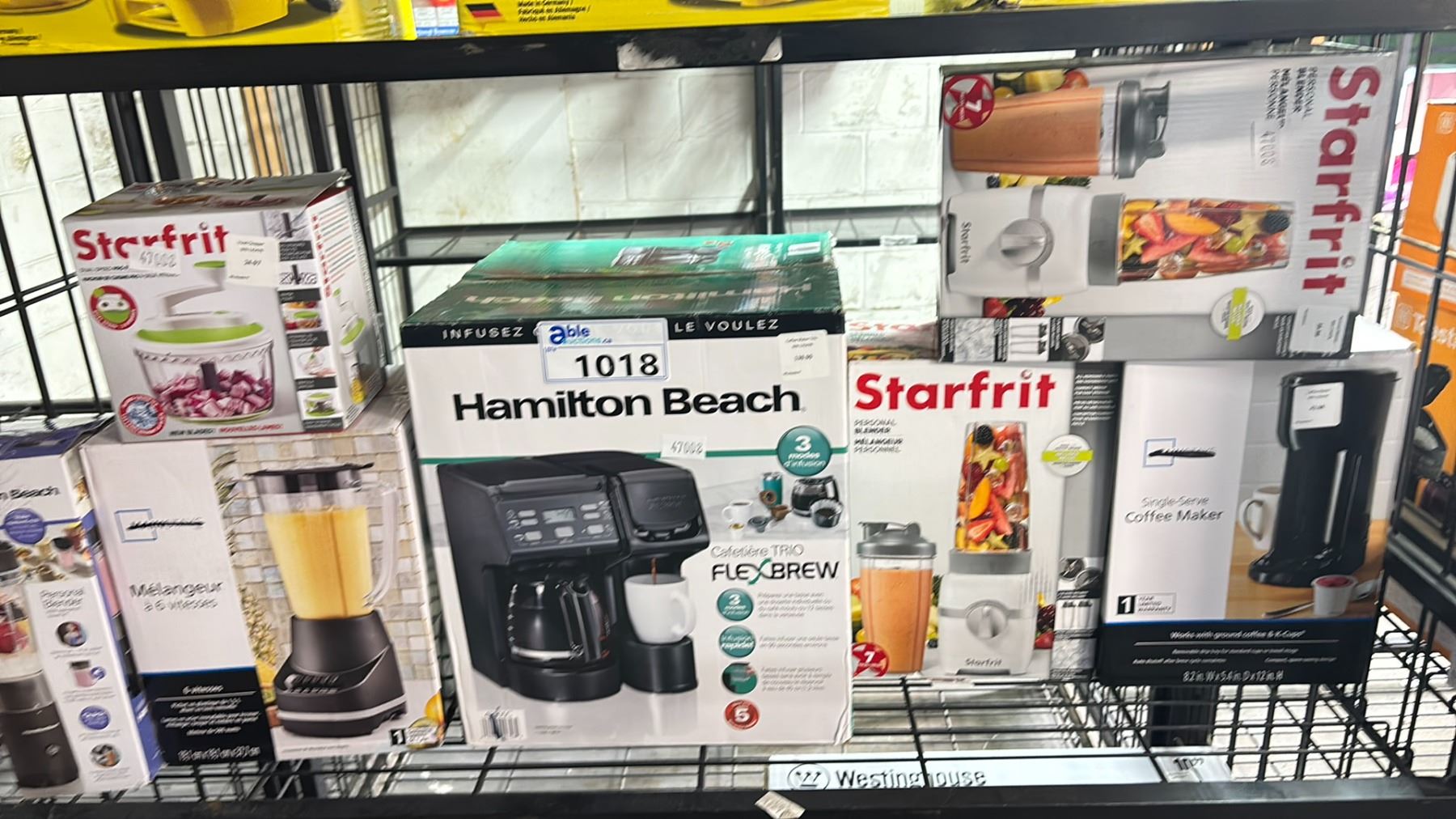 SHELF OF ASSORTED ITEMS INCLUDING; HAMILTON BEACH COFFEE MAKER TRIO, STARFRIT PERSONAL BLENDER, STARFRIT FOOD CHOPPER AND MORE