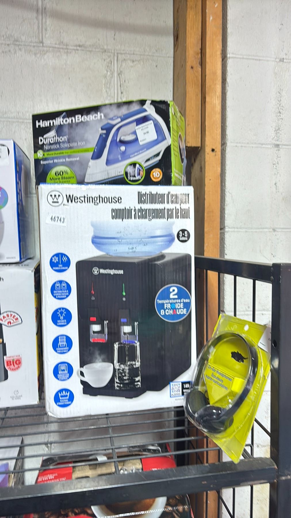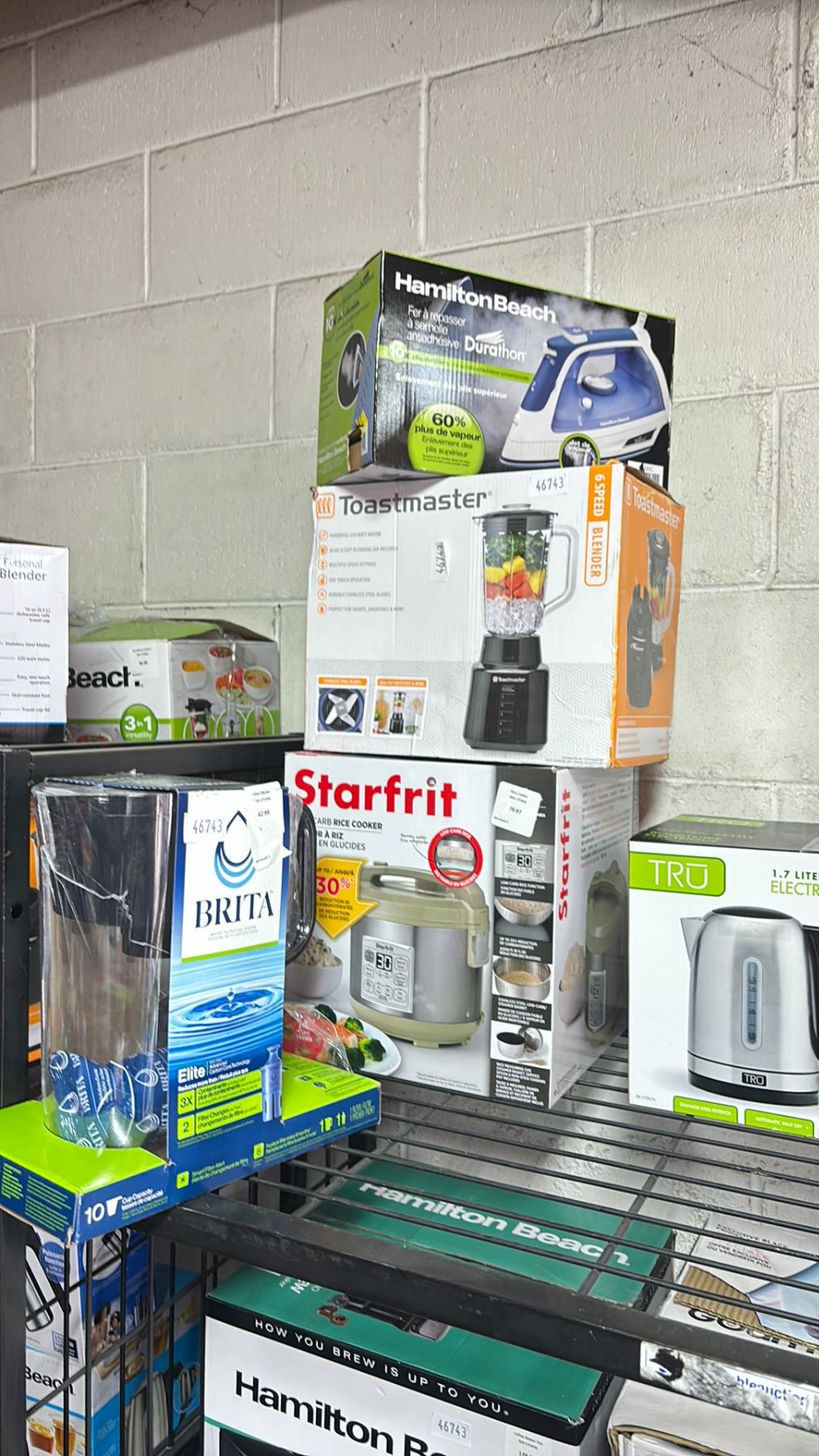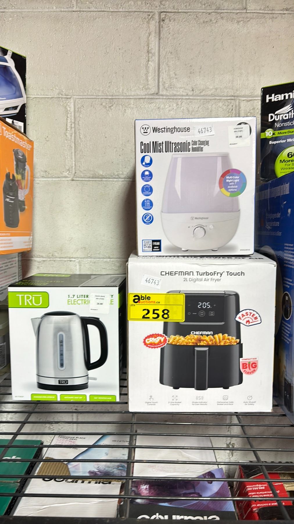 SHELF OF ASSORTED ITEMS INCLUDING; HAMILTON BEACH DURATHON NONSTICK SOLEPLATE IRON, CHEFMAN TURBOFRY TOUCH 2L DIGITAL AIR FRYER, TOASTMASTER 6 SPEED BLENDER
