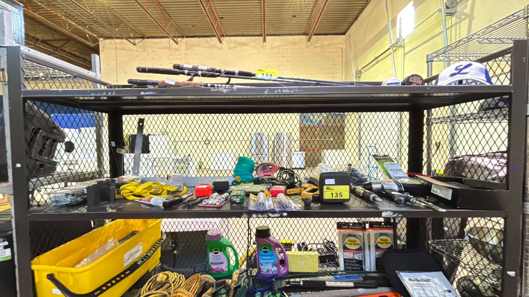 SHELF OF ASSORTED ITEMS INCLUDING; HAND TOOLS, AIR TOOLS, MOUSE SANDER & MORE