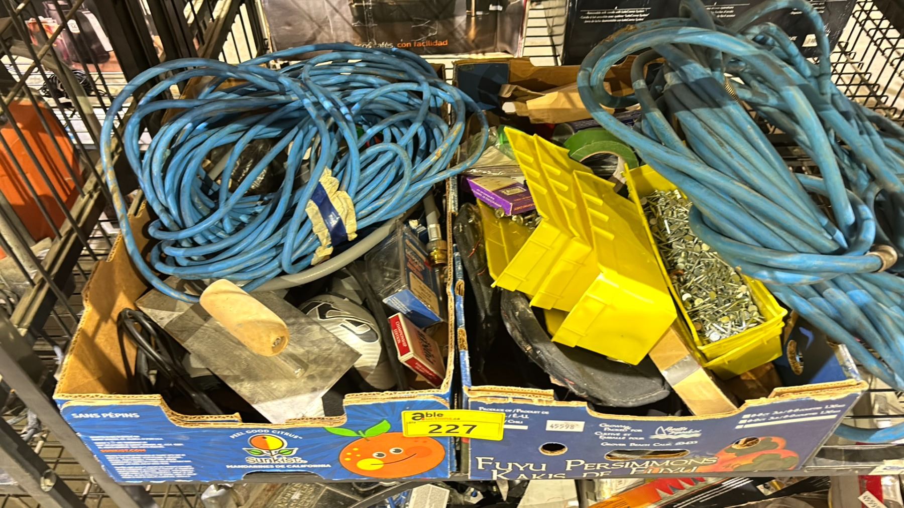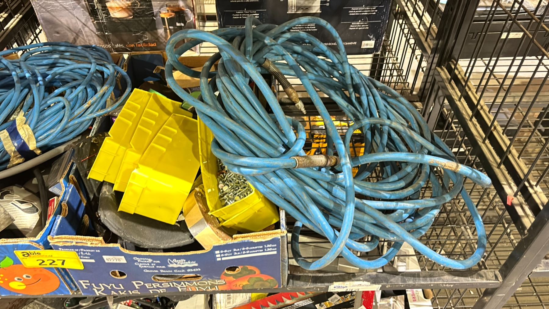 SHELF OF ASSORTED ITEMS INCLUDING; HARDWARE, AIR HOSE, EXTENSION CORD & MORE