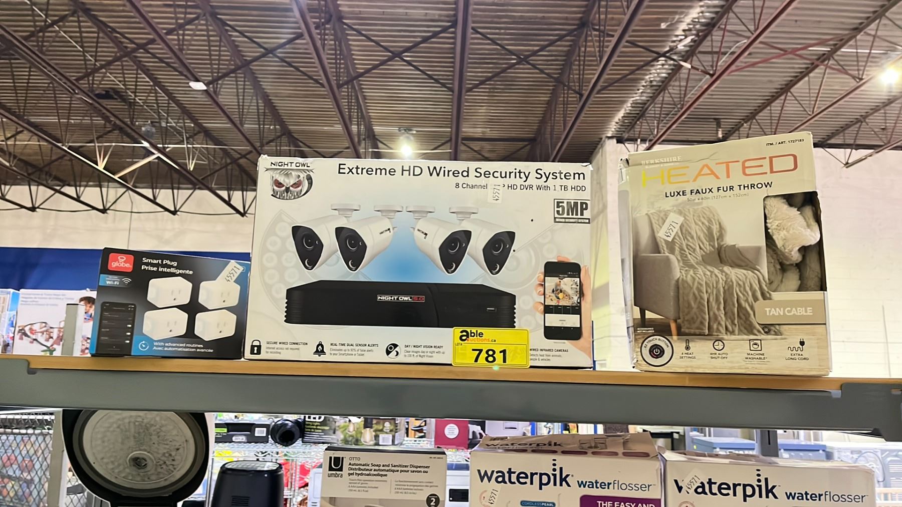 SHELF OF ASSORTED ITEMS INCLUDING; HEATED THROW, EXTREME HD WIRED SECURITY SYSTEM & 4 PACK SMART PLUGS (UNKNOWN WORKING CONDITION, MAY BE MISSING PIECES)