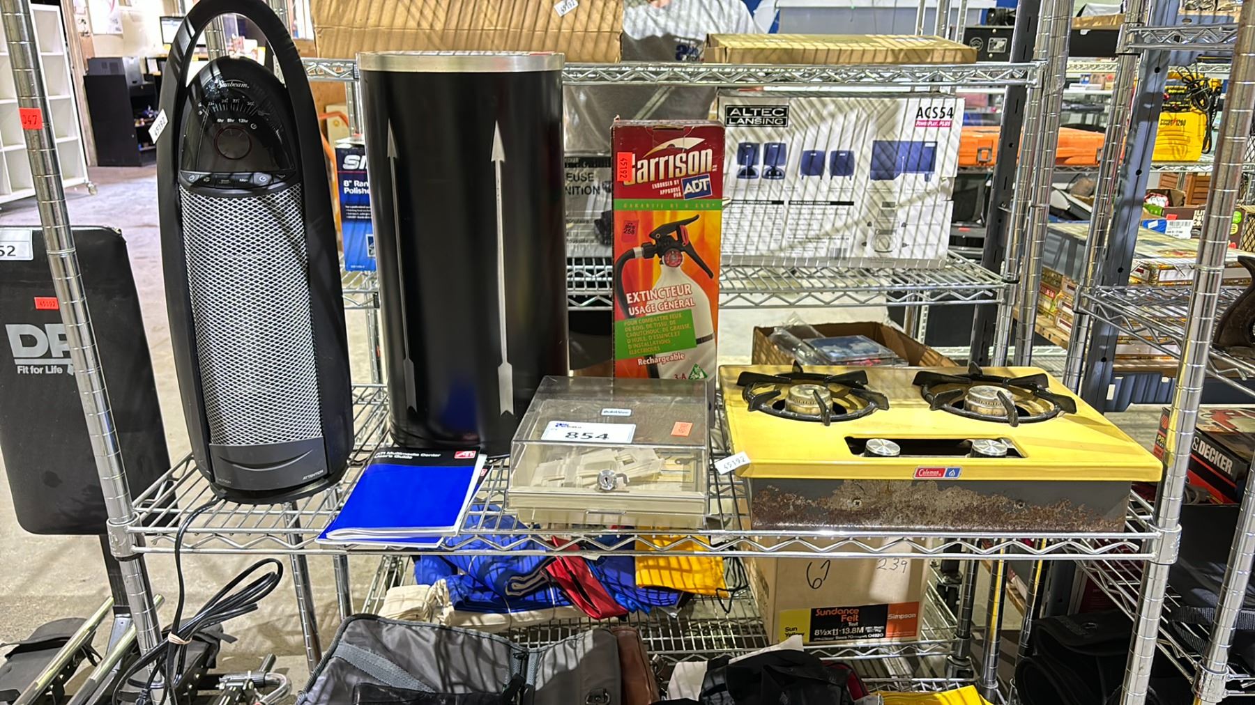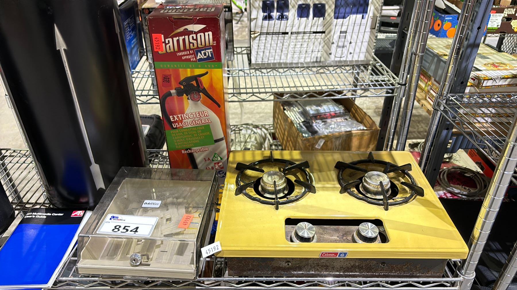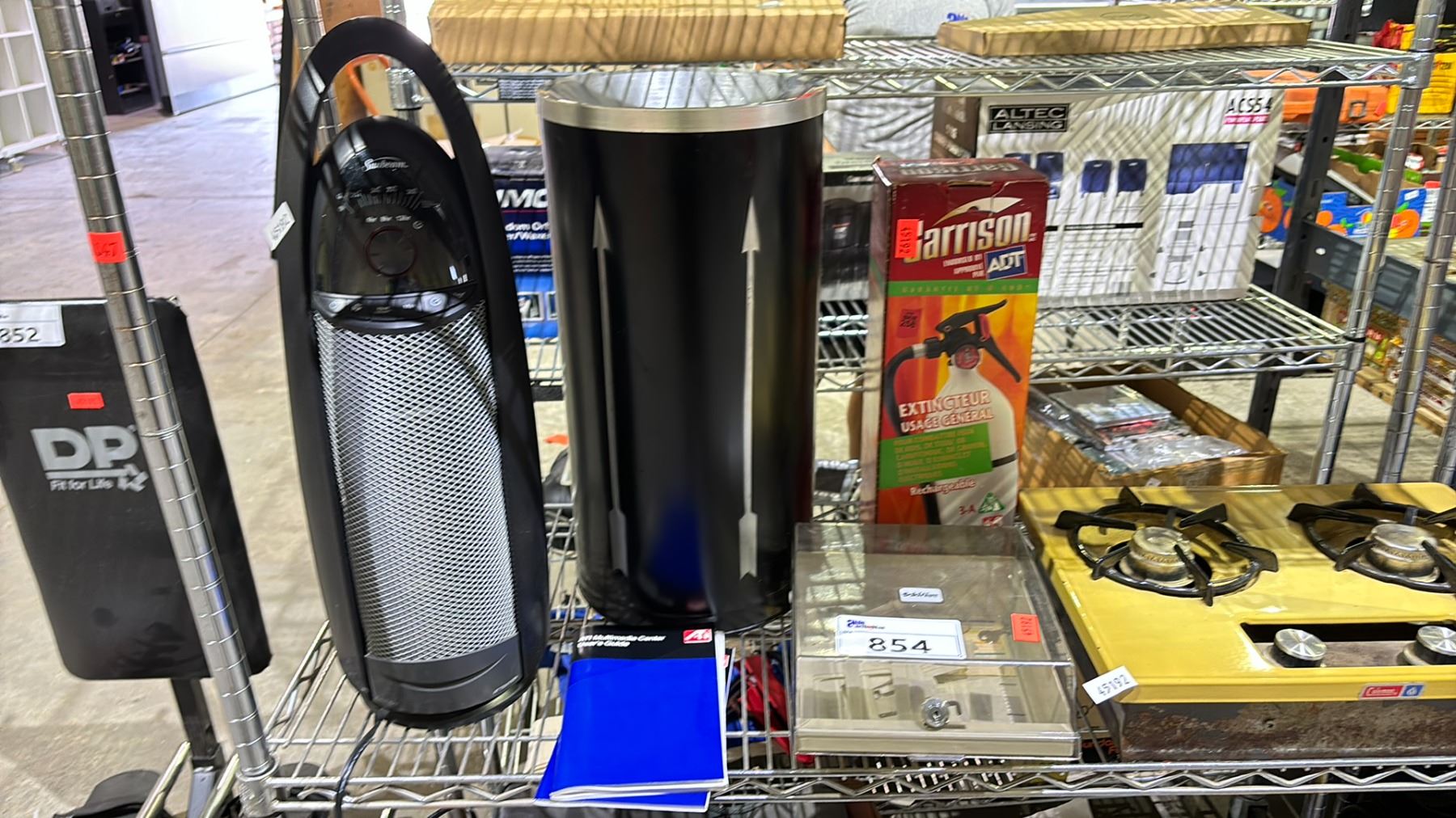 SHELF OF ASSORTED ITEMS INCLUDING; HEATER, COLEMAN CAMPING STOVE, FIRE EXTINGUISHER & MORE