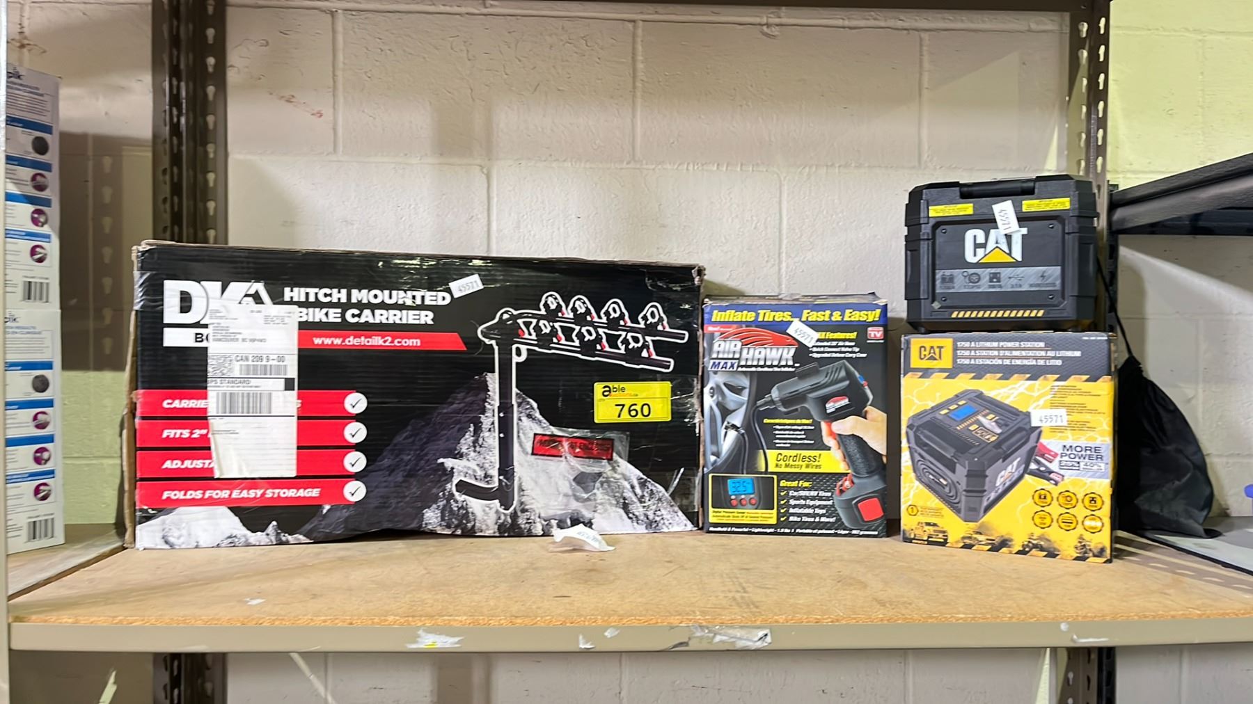 SHELF OF ASSORTED ITEMS INCLUDING; HITCH MOUNTED BIKE CARRIER, AIR HAWK MAX TIRE INFLATOR & 2 CAT POWER STATIONS (UNKNOWN WORKING CONDITION, MAY BE MISSING PIECES)