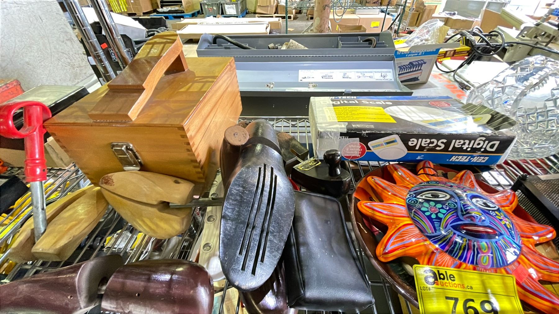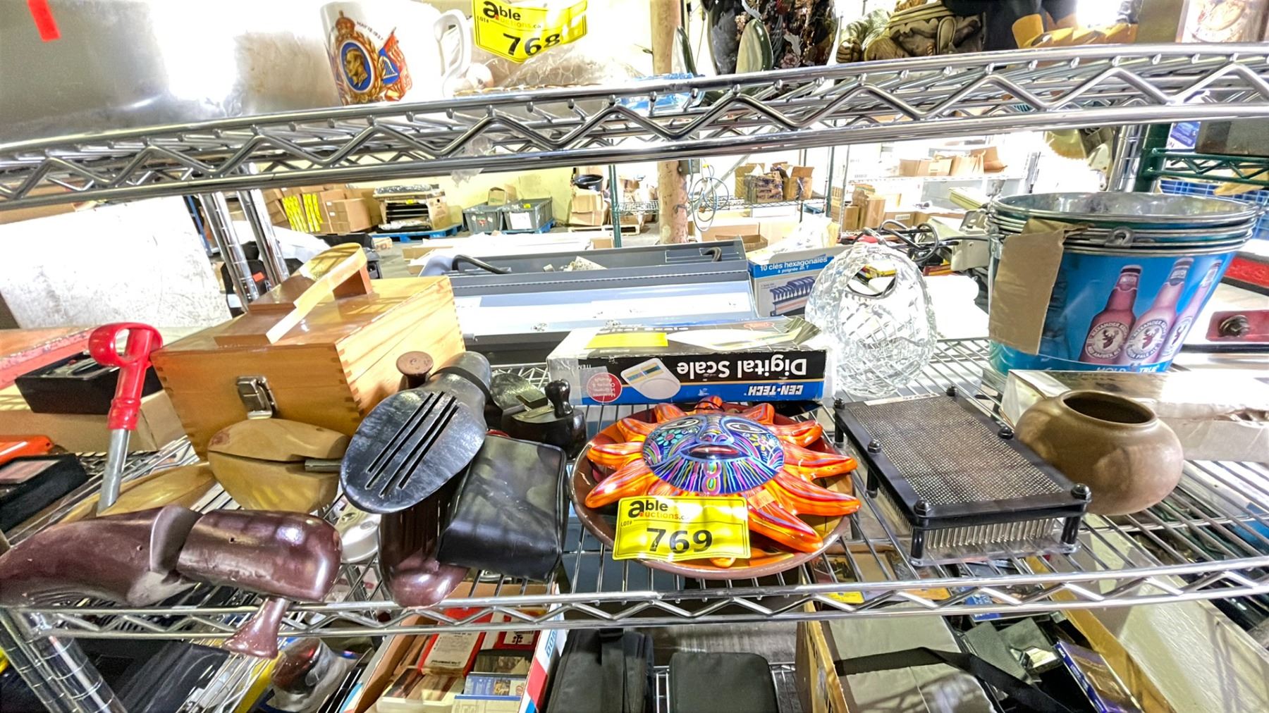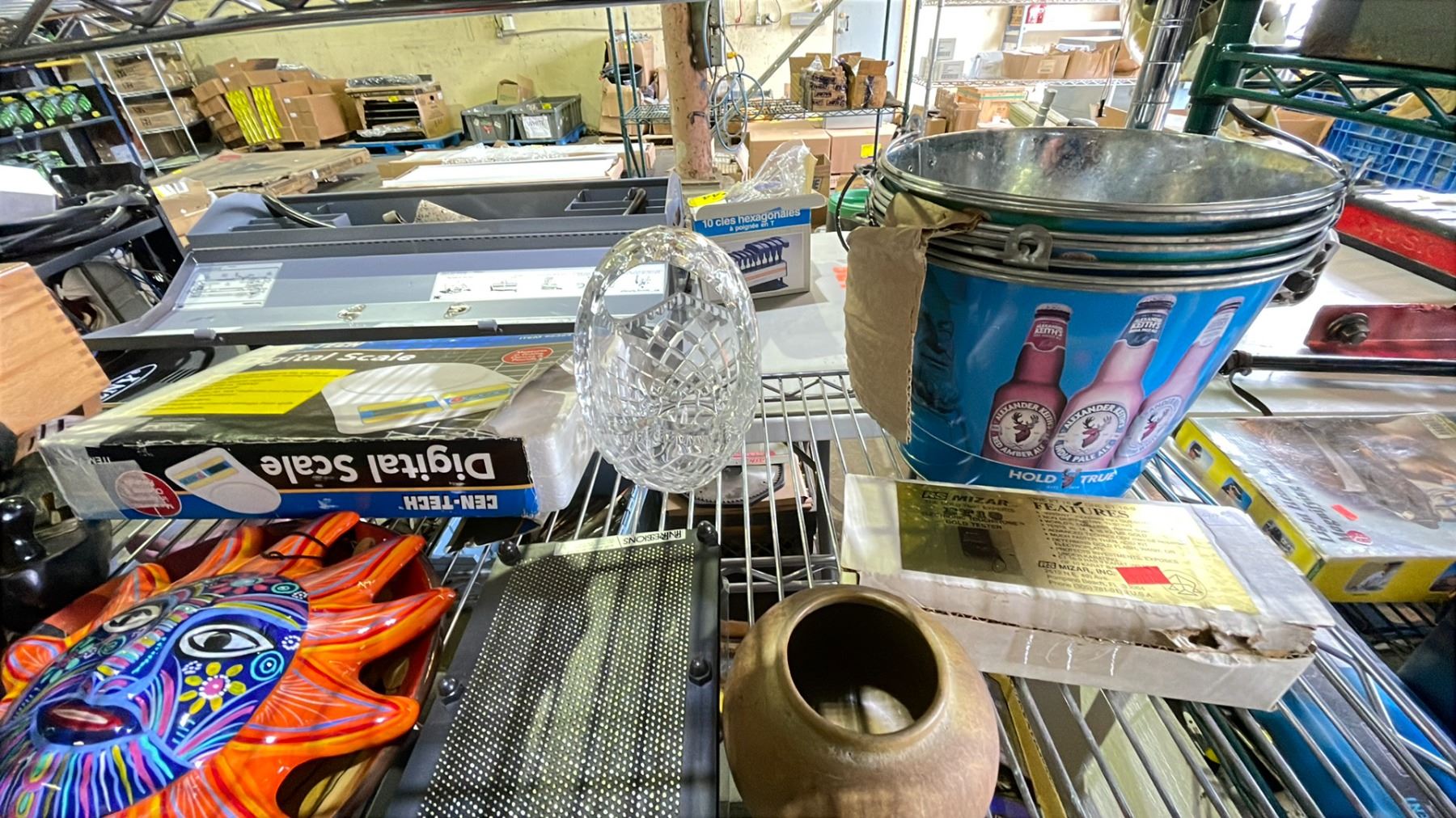 SHELF OF ASSORTED ITEMS INCLUDING; HOME DECOR, BEER BUCKETS, DIGITAL SCALE & MORE