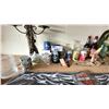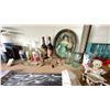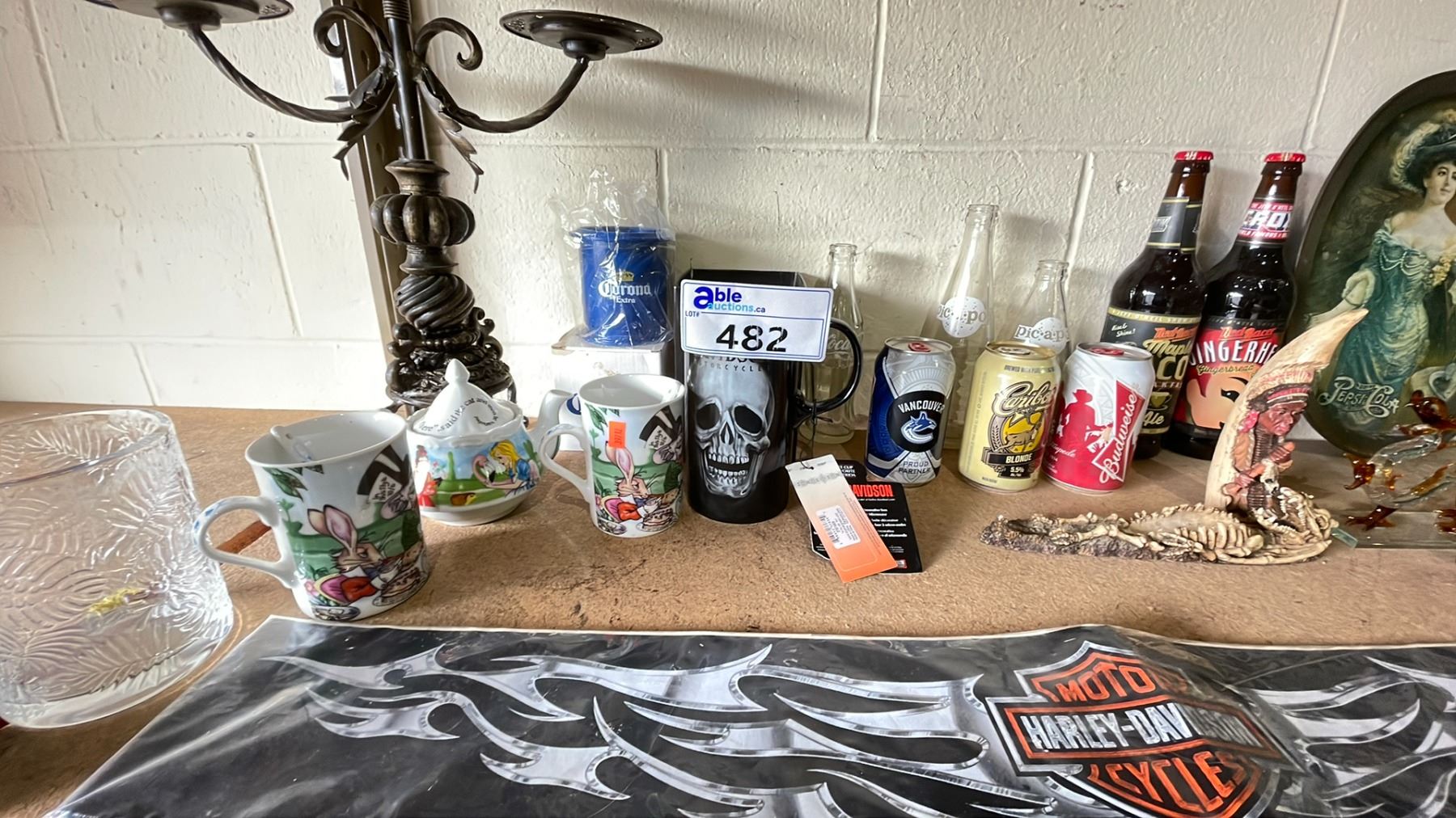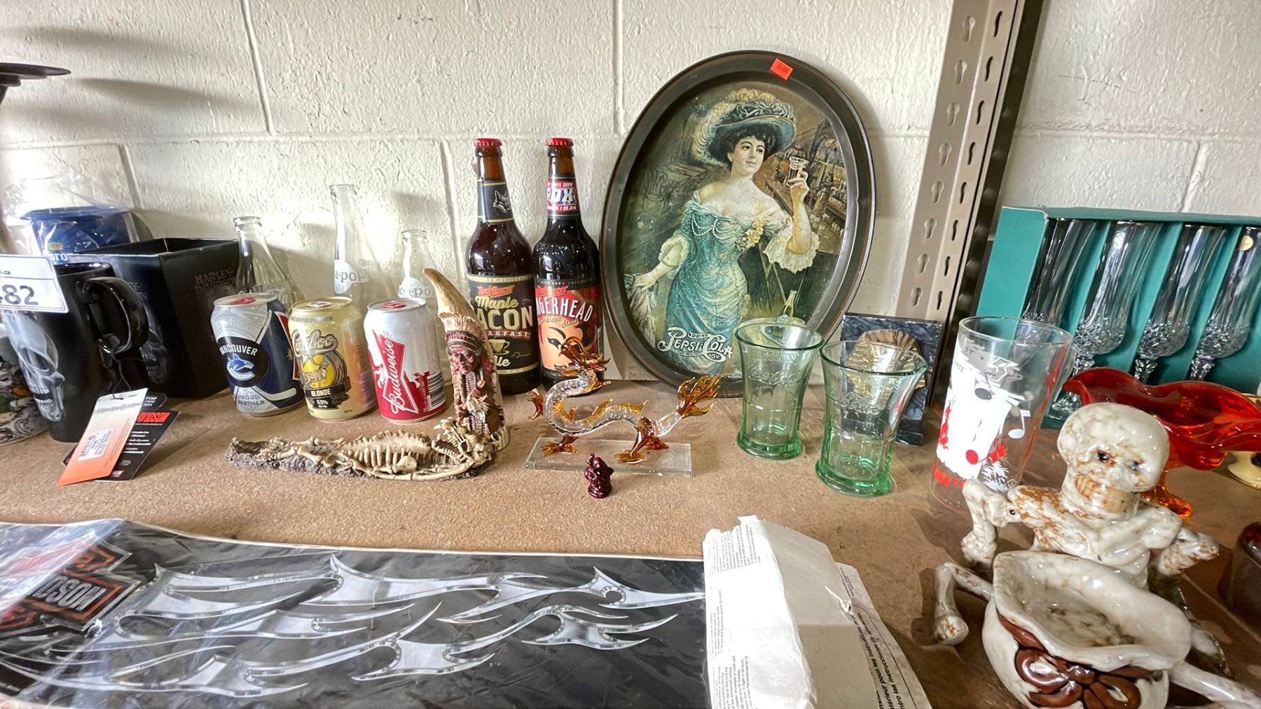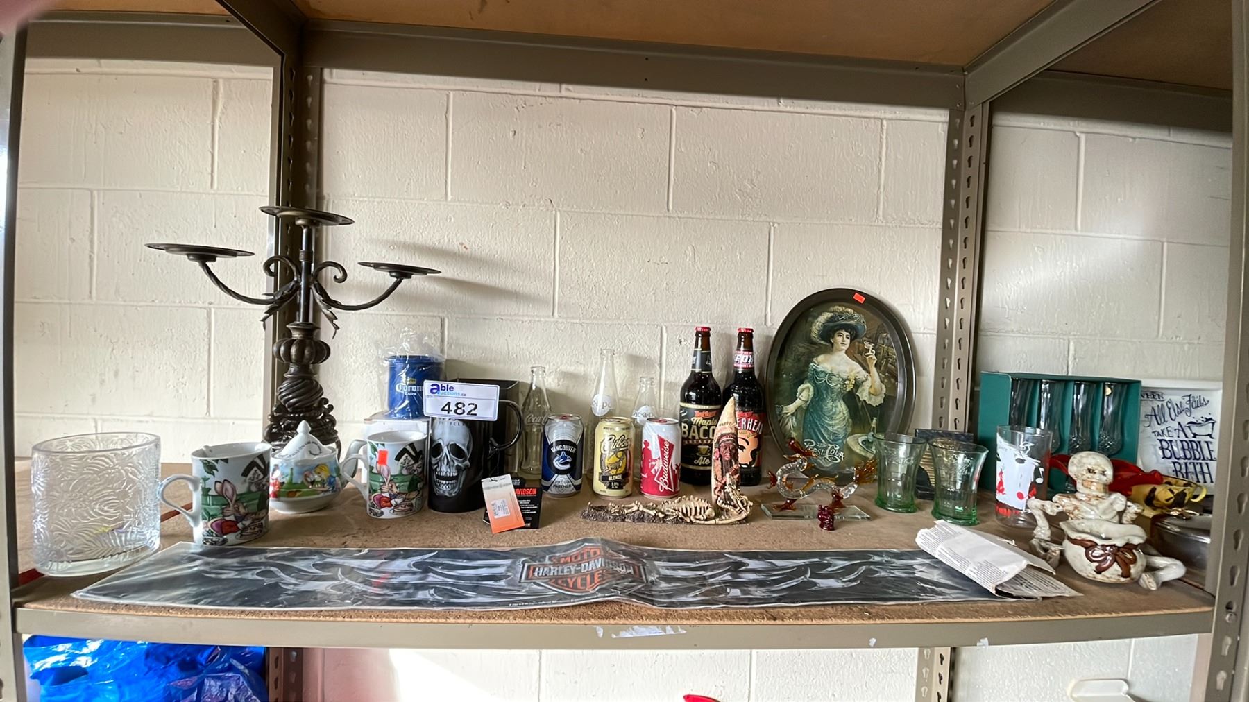 SHELF OF ASSORTED ITEMS INCLUDING; HOME DECOR, COLLECTIBLE CANS & BOTTLES, CANDELABRA & MOREO