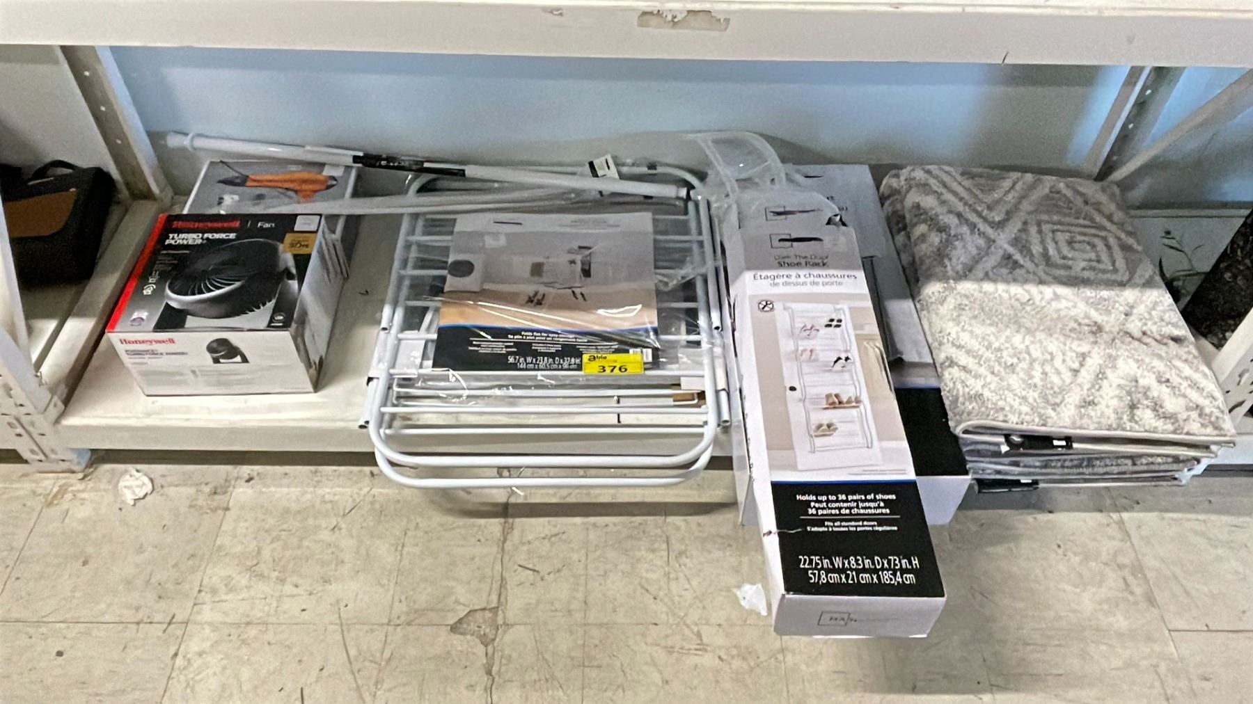 SHELF OF ASSORTED ITEMS INCLUDING; HONEYWELL TURBO FORCE POWER+ FAN, FOLDING DRYING RACK, OVER THE DOOR SHOE RACK & MORE
