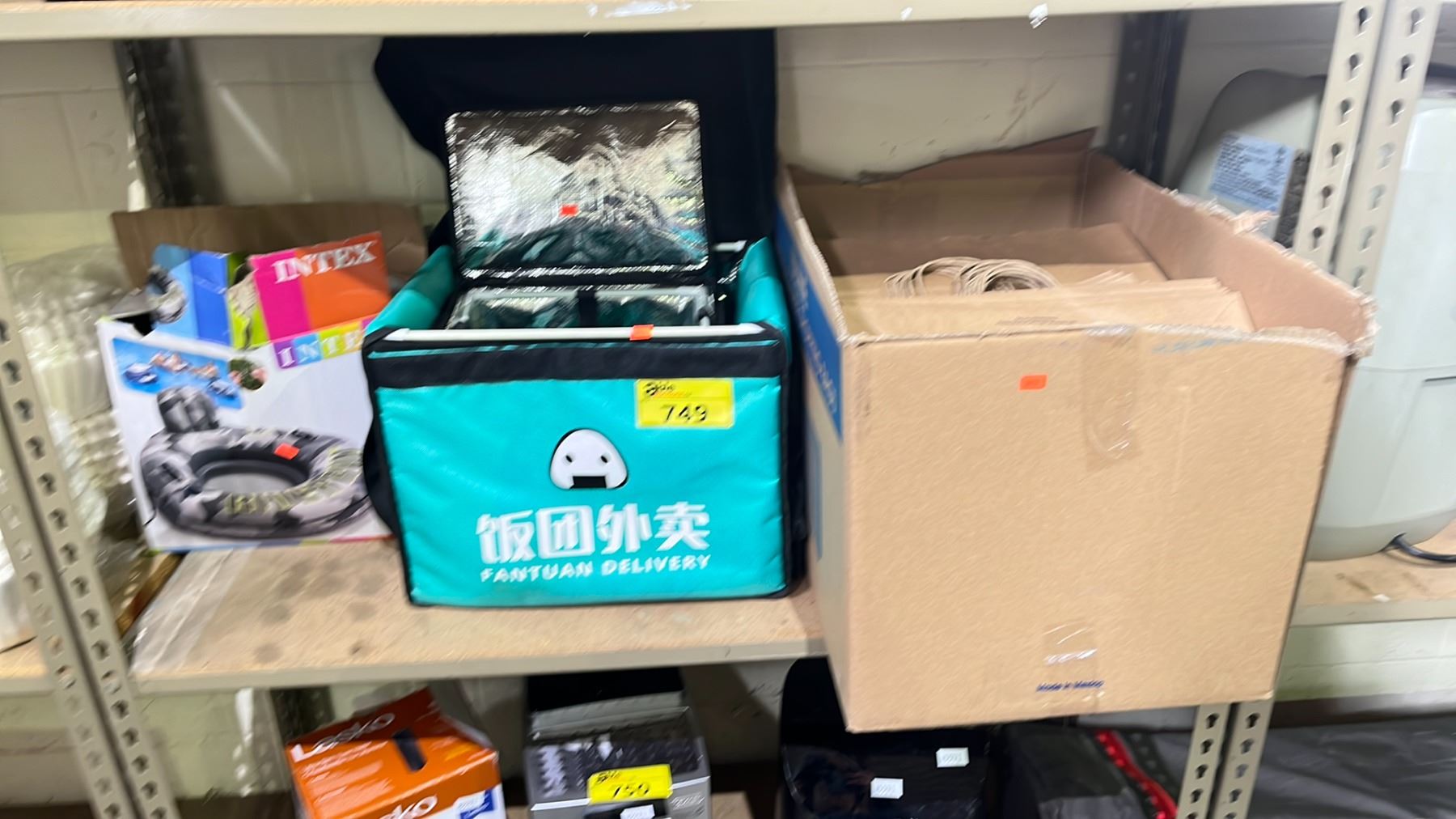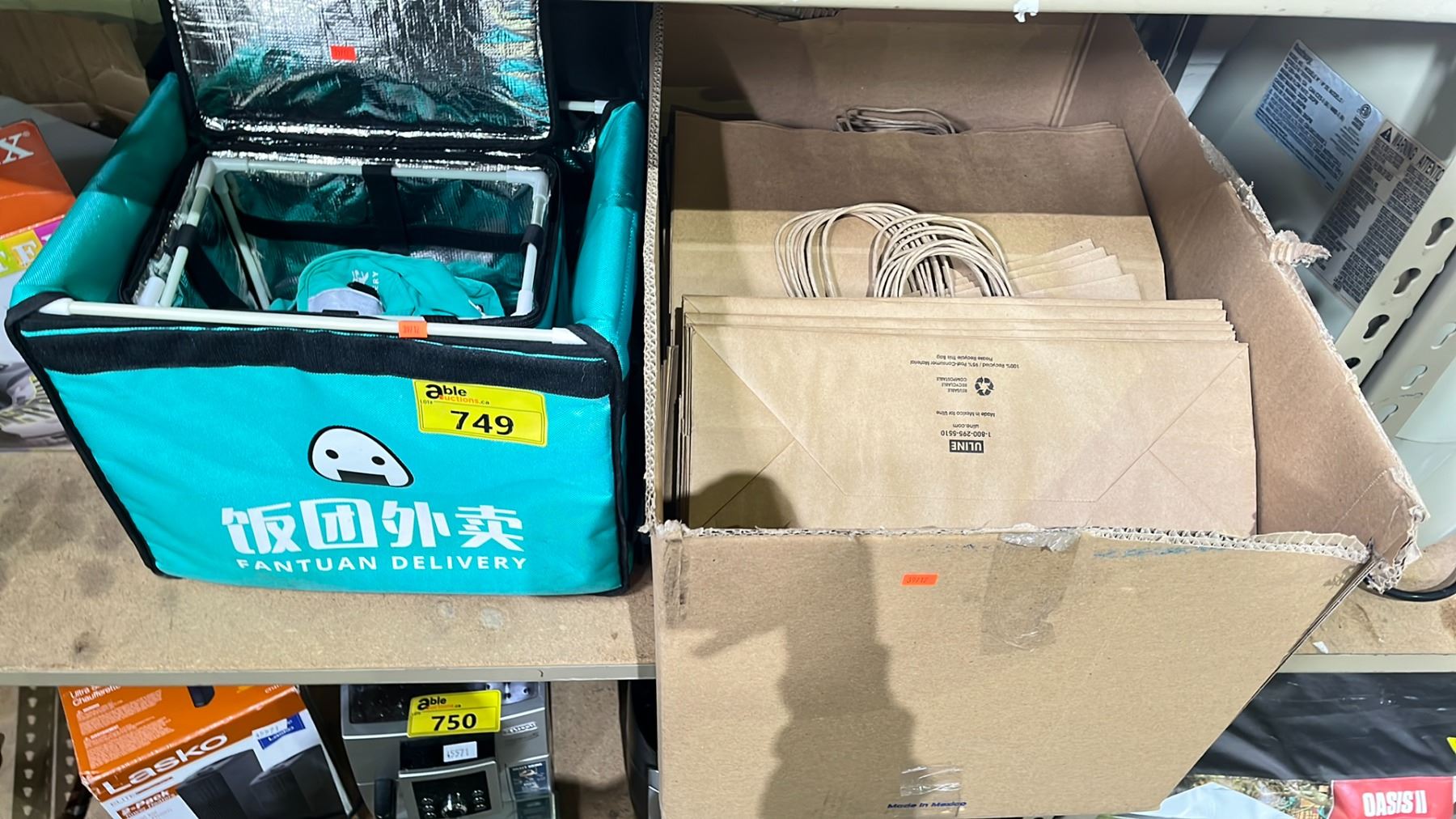 SHELF OF ASSORTED ITEMS INCLUDING; INTEX RIVER TUBE, ULINE PAPER BAGS & DELIVERY BAGS