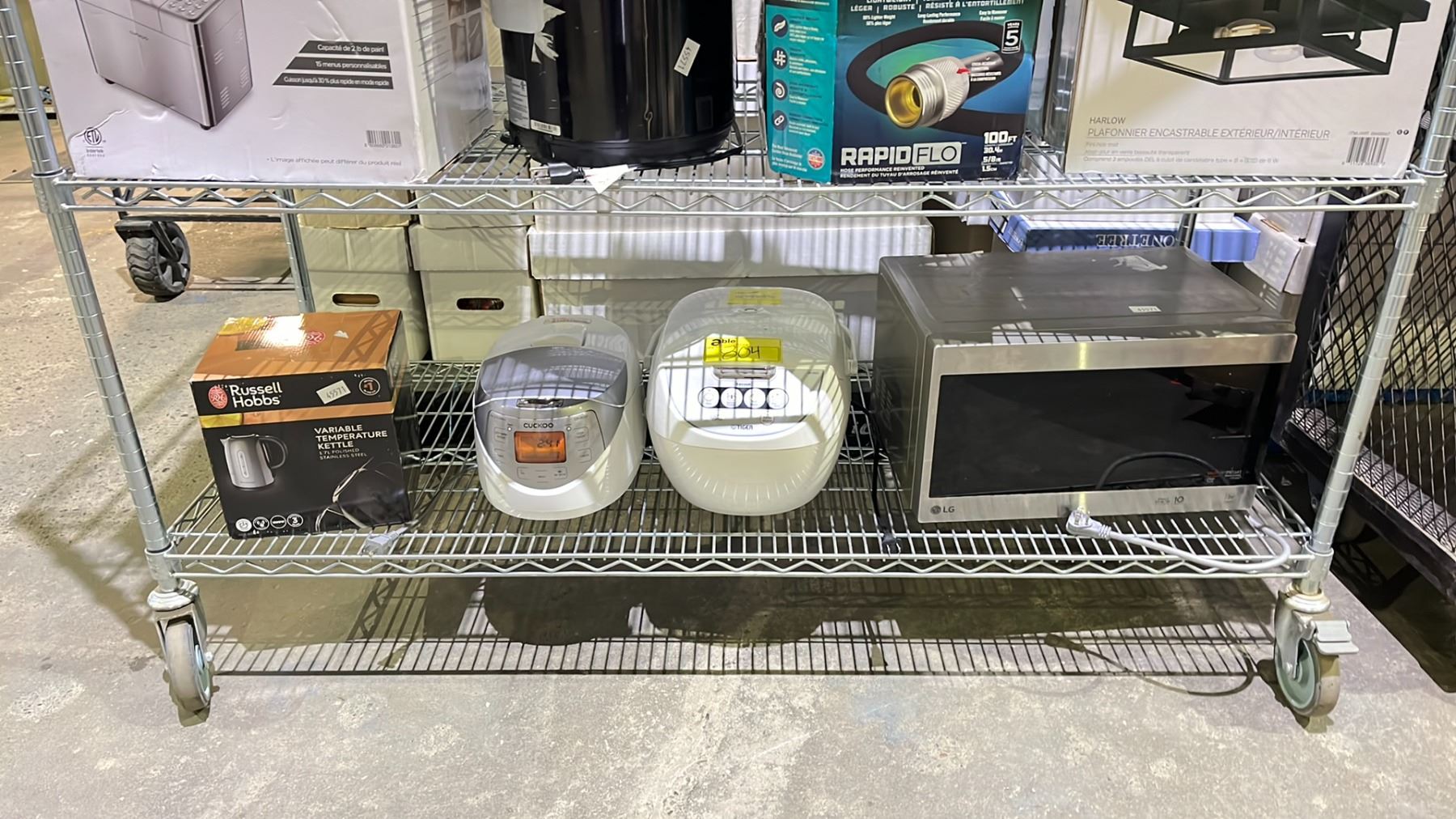 SHELF OF ASSORTED ITEMS INCLUDING; KETTLE, RICE COOKERS & MICROWAVE (UNKNOWN WORKING CONDITION, MAY BE MISSING PIECES)