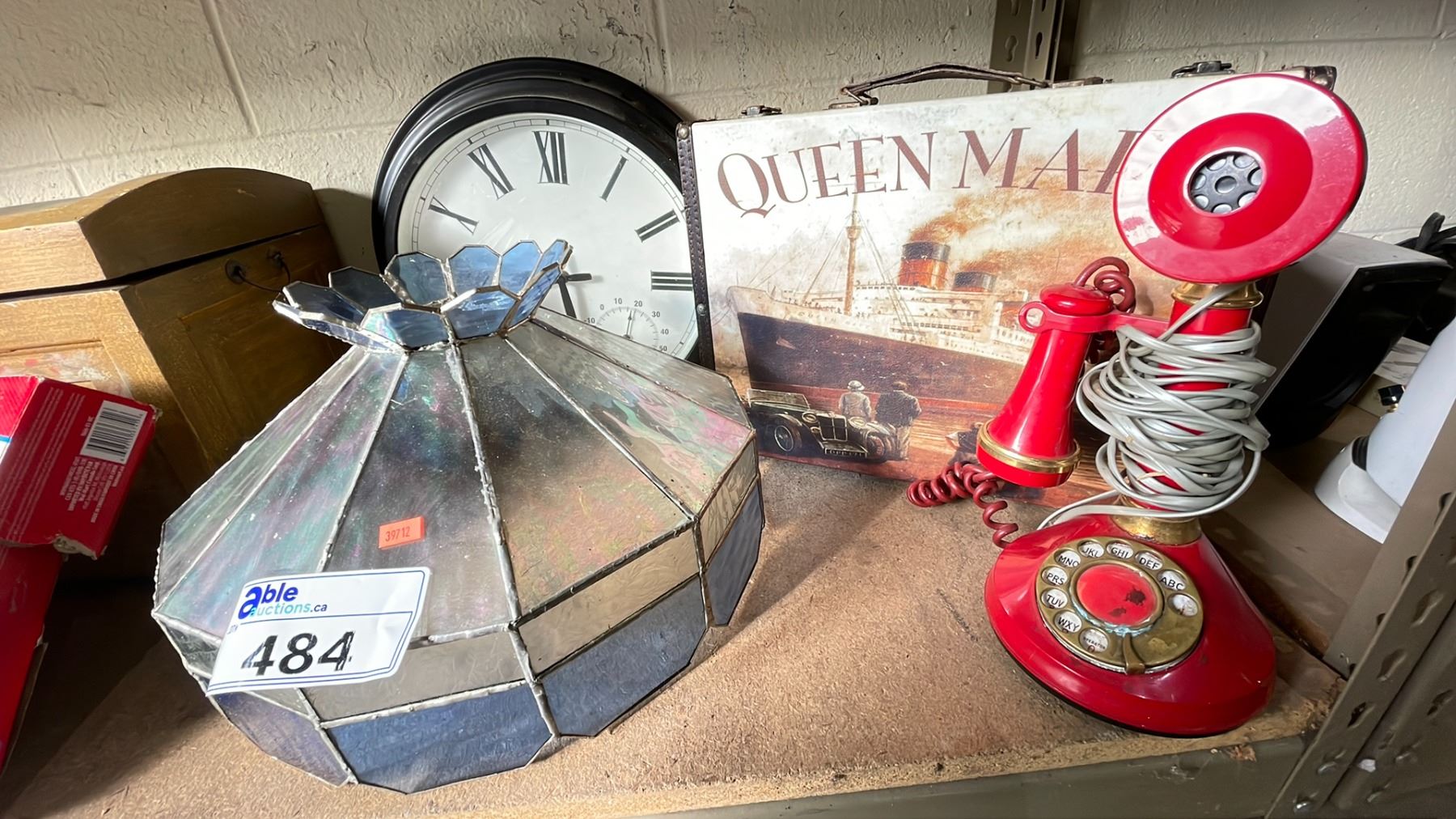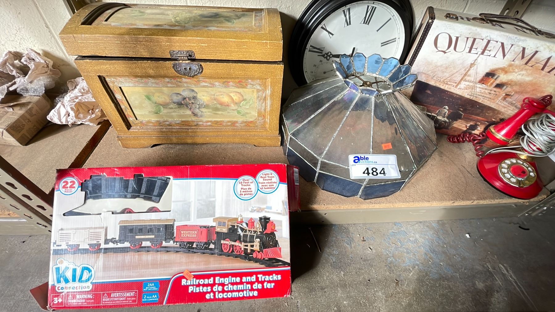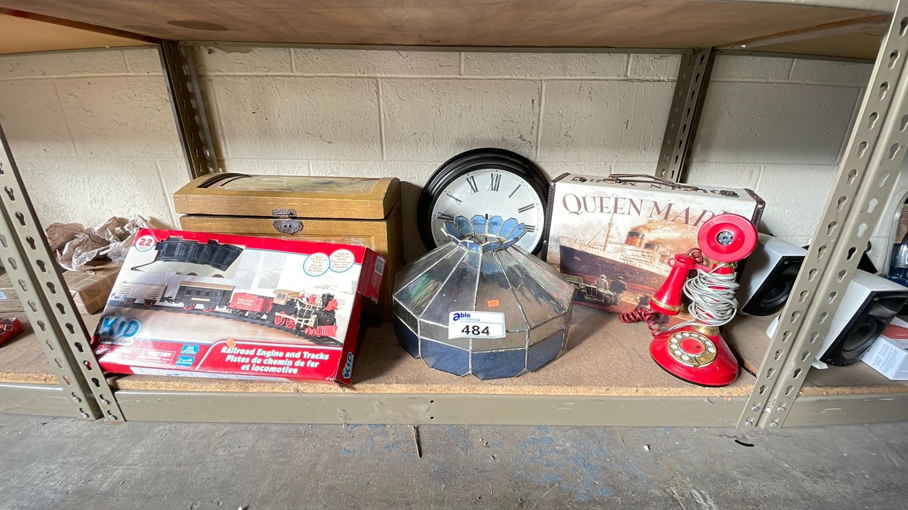 SHELF OF ASSORTED ITEMS INCLUDING; LEAD GLASS LAMP SHADE, RAILROAD ENGINE AND TRACKS, VINTAGE PHONE & MORE